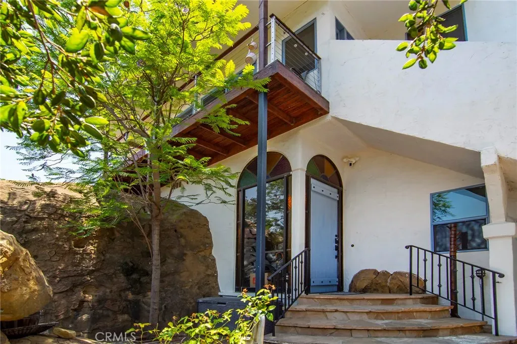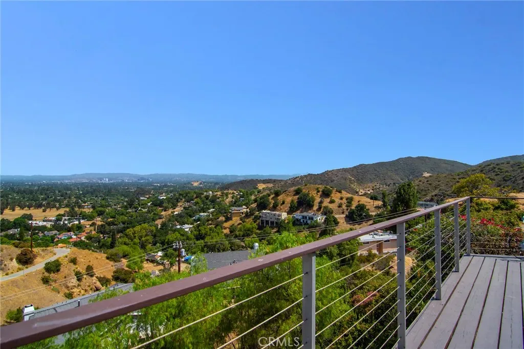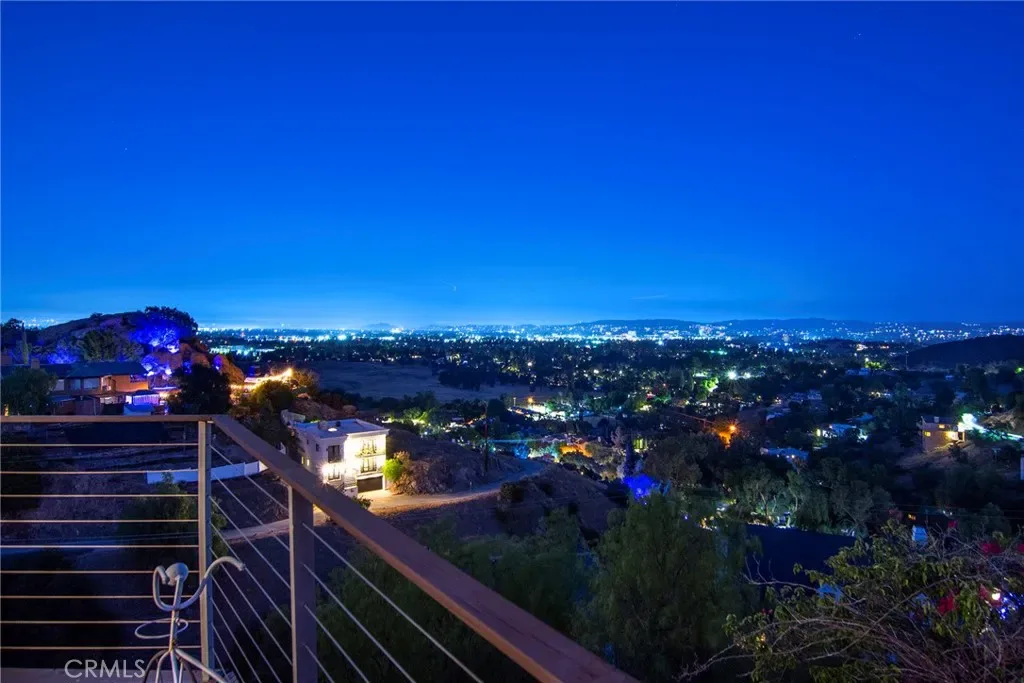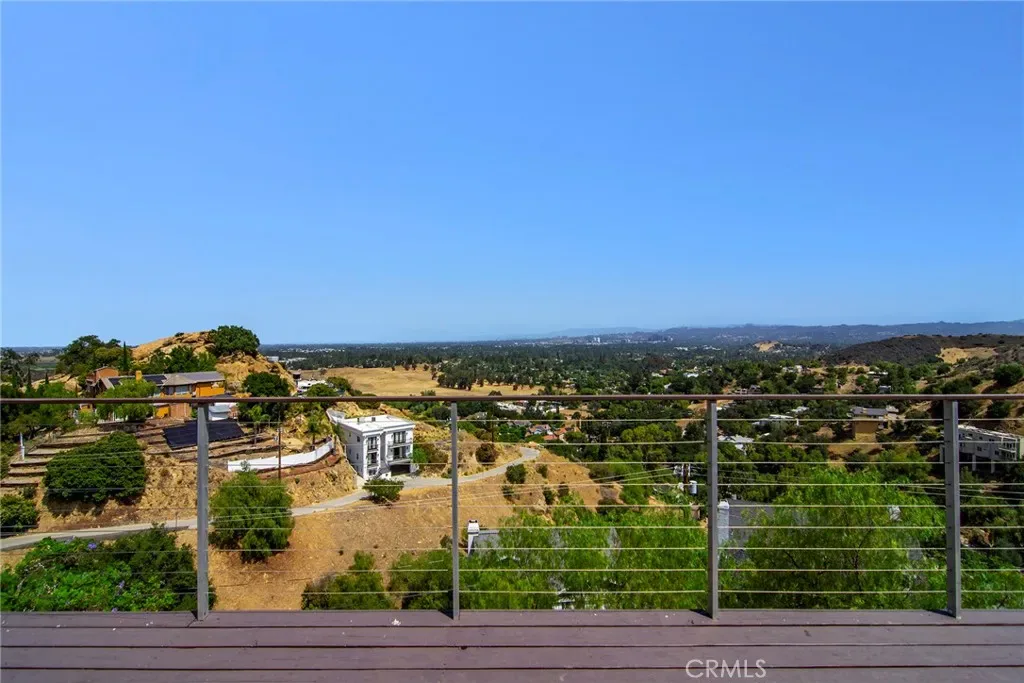 This Spanish adobe residence is situated on a sandstone ridge in West Hills, offering unobstructed 360-degree views of the San Fernando Valley and surrounding canyon terrain. The home includes 3 bedrooms and 3 full bathrooms across an open-concept layout featuring vaulted ceilings with exposed wood beams.