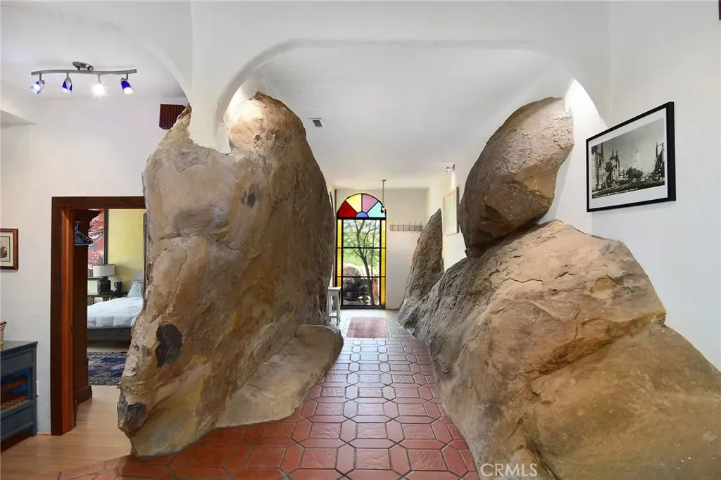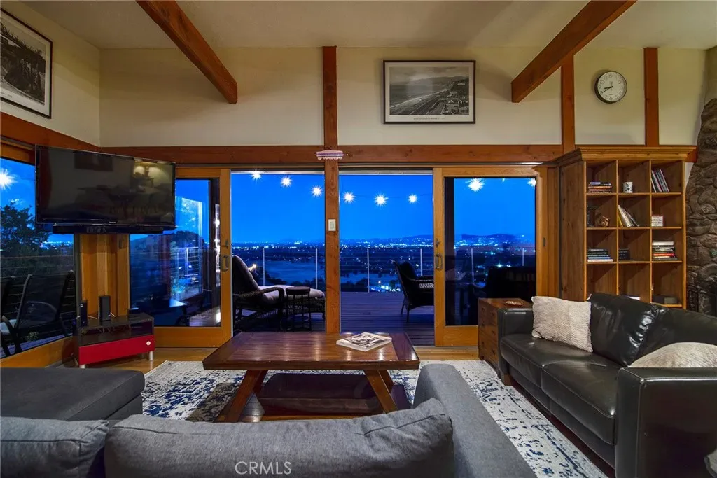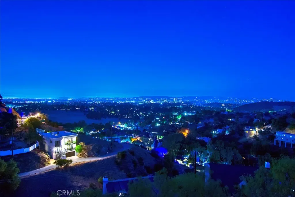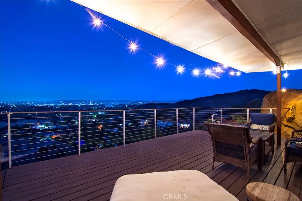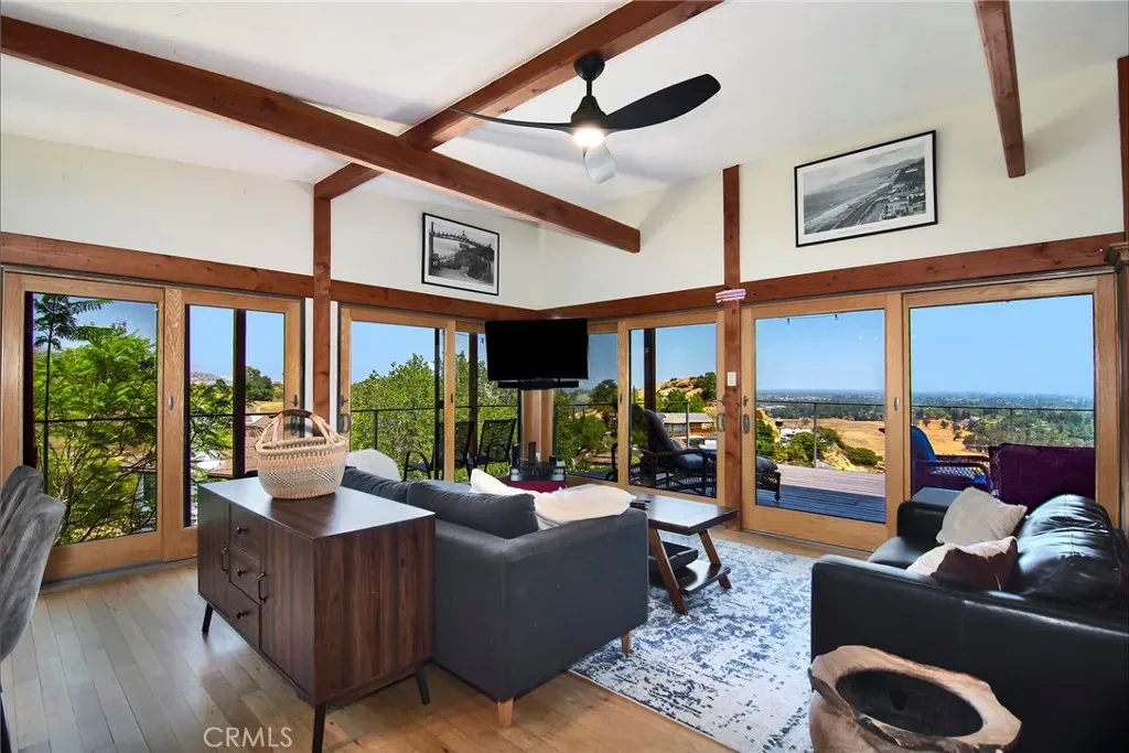 This Spanish adobe residence is situated on a sandstone ridge in West Hills, offering unobstructed 360-degree views of the San Fernando Valley and surrounding canyon terrain. The home includes 3 bedrooms and 3 full bathrooms across an open-concept layout featuring vaulted ceilings with exposed wood beams.