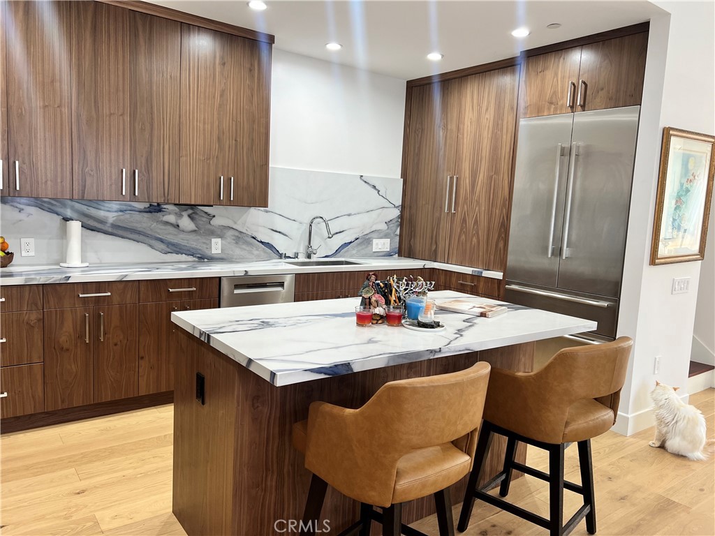Step inside to a spacious, inviting living area featuring newly remodeled floors, soaring high ceilings, recessed lighting throughout, custom window treatments, and a generous patio perfect for indoor-outdoor entertaining. The modern kitchen boasts walnut cabinetry, luxurious marble countertops and backsplash, high-end stainless steel appliances, and an island with bar seating—ideal for casual meals or hosting.