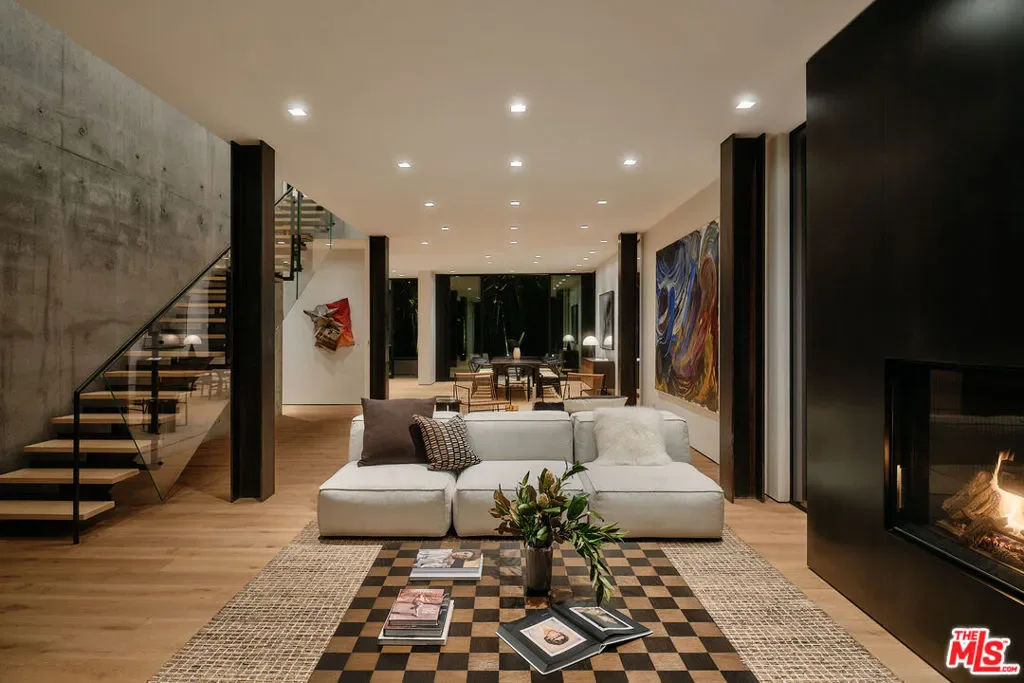 Concrete House at 8899 Beverly |Part of a limited collection of eight standalone residences at 8899 Beverly, Concrete House is an architecturally significant and recognizable work by Olson Kundig, defined by a monolithic expression of site-cast concrete set behind dense tropical foliage. A dramatic double-height entry reveals a floating open-riser staircase set against the central concrete wall. Exposed structural steel, a cantilevered roof, Fleetwood glazing, and fixed steel screening panels complete the composition, filtering light and providing privacy while framing the surrounding tropical landscape and glimpses of the Hollywood Hills. The home spans 2,962 square feet, with three bedrooms and three-and-a-half bathrooms. The living area is anchored by a fireplace beneath exposed steel beams, with white oak floors running throughout. The kitchen is appointed with Miele and Gaggenau appliances, rift-cut oak cabinetry, and Dornbracht fixtures. All three bedrooms include built-out closets and ensuite baths. The primary suite is detailed with a bedside fireplace framed by windows which offer peekaboo views of the Hollywood Hills. Multi-panel doors connect the living and dining areas to a private outdoor space with a 32-foot plunge pool and spa, surrounded by tropical landscaping. Residents of 8899 Beverly have access to 24-hour concierge and property management, a fitness center, and an amenity deck with resort-style pool, spa, and outdoor kitchen. One of only four remaining homes in the collection, Concrete House offers a rare opportunity to own a fully private, architecturally significant residence with the services and amenities of 8899 Beverly, combining the privacy of a single-family home with the ease of fully serviced living.