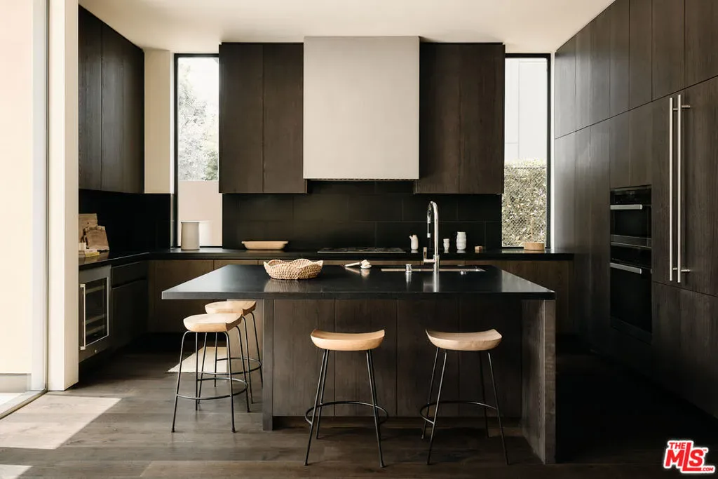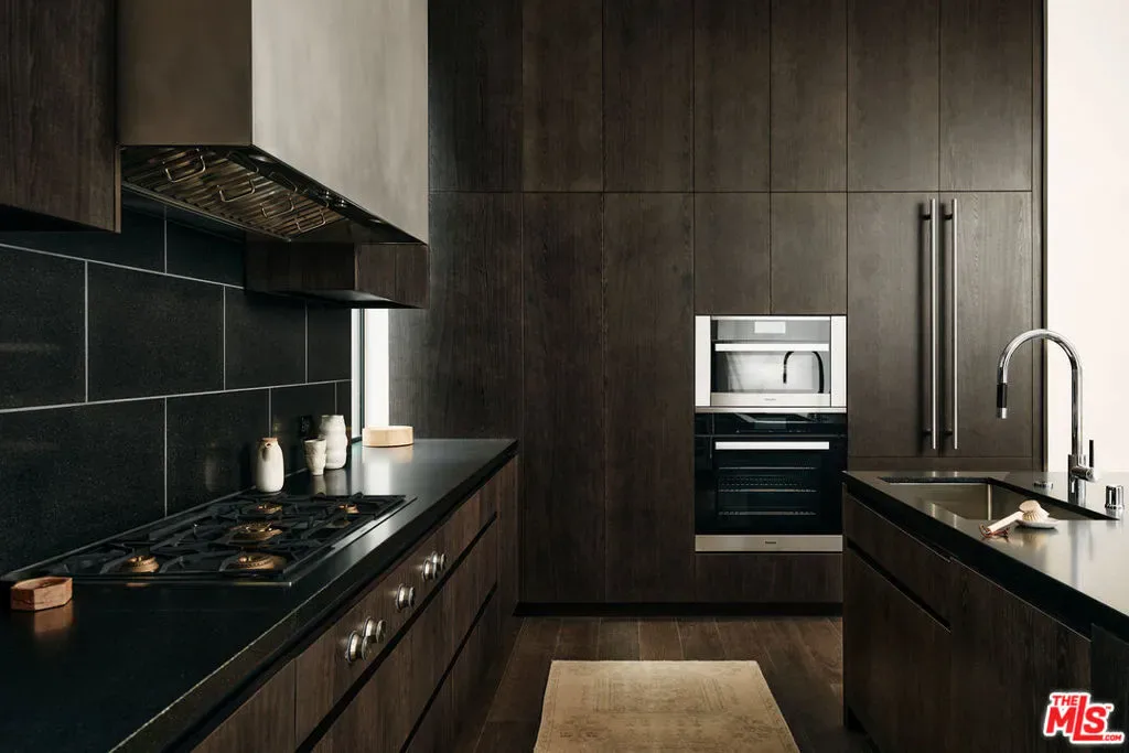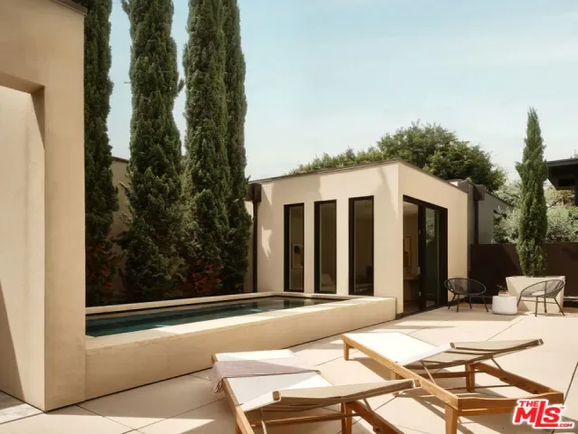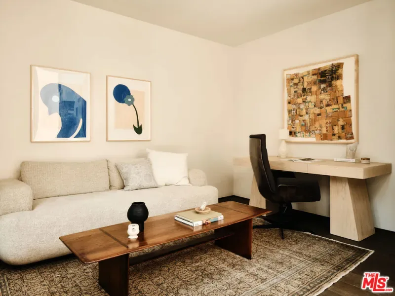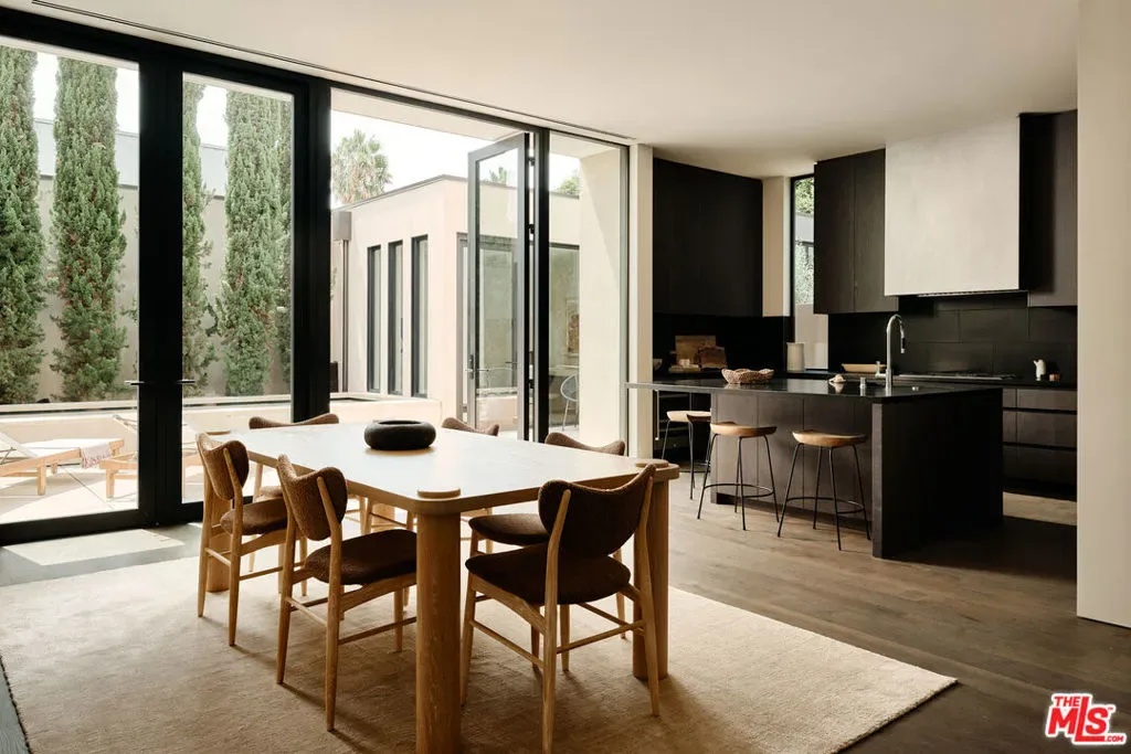 Brick House by Olson Kundig at 8899 Beverly | This distinctive architectural residence combines the privacy of a single-family home with the services of a luxury building in the heart of West Hollywood. One of only eight signature houses within the development, Brick House celebrates the warmth and texture of clay-fired brick through Olson Kundig’s expressive material design, giving the home its unmistakable personality and mid-century spirit.The residence offers three bedrooms and two and a half bathrooms. A brick-surrounded fireplace anchors the living room, while Fleetwood doors open wide to the sunny private courtyard for effortless indoor-outdoor living. The kitchen features an oversized island with ample room for meal preparation and casual dining. Interior finishes include dark-stained quarter-sawn walnut casework and wood flooring throughout.Upstairs, the primary suite opens to a private balcony with views of the Hollywood Hills and includes a walk-in closet and spa-like ensuite bathroom.The sunny Mediterranean-inspired courtyard is centered around an oversized outdoor spa framed by sandstone pavers and cypress trees. A detached studio on one side of the courtyard offers a peaceful retreat-ideal for an office, meditation room, home gym, or artist studio- while the opposite side includes an outdoor shower and enclosed powder room. Among the most character-driven homes in the collection, Brick House offers the privacy of a detached architectural residence paired with the convenience and services of a full-service building. Located in one of West Hollywood’s most walkable neighborhoods. As part of the Olson Kundig-designed 8899 Beverly development, homeowners enjoy access to 24-hour concierge and property management services, a state-of-the-art fitness center, and a landscaped amenity deck with resort-style pool and spa and a custom outdoor kitchen. One of the final remaining homes available in the development, Brick House offers a rare opportunity to own a fully private, architecturally significant residence with the services and amenities of a world-class enclave.