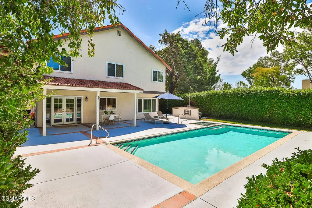 In the heart of Westlake Village, within the highly desirable Village Homes community, this beautifully updated residence is ready to welcome you home.Step inside to soaring ceilings and a light-filled living room that creates an inviting and open atmosphere. The entire downstairs has been enhanced with brand-new Pergo flooring, offering a fresh, modern aesthetic paired with durability and ease of living.The thoughtfully updated kitchen features sleek quartz countertops, stainless steel appliances, and refreshed cabinetry, creating a functional and stylish space for everyday living. Recessed lighting and updated bathrooms throughout the home add to its clean, contemporary feel.Upstairs, the spacious primary suite offers vaulted ceilings and a private ensuite bath, while three additional bedrooms provide flexibility for family, guests, or a home office. A conveniently located powder room completes the main level.Step outside to your own private backyard retreat–complete with a sparkling pool and spa that has been newly replastered and is ready to enjoy just in time for summer, along with a built-in BBQ area ideal for outdoor gatherings.Ideally located just moments from grocery stores, shopping, and a variety of popular restaurants, this home offers everyday convenience alongside a peaceful residential setting.Village Homes offers an exceptional lifestyle with amenities including a clubhouse, community pool, tennis courts, and beautifully maintained greenbelts–creating the perfect balance of relaxation and recreation.This is a rare opportunity to enjoy comfort, style, and community in one of Westlake Village’s most sought-after neighborhoods–don’t miss it.