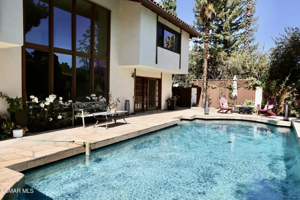 Located in a quiet Foxmoor Hills cul-de-sac, this private house offers architectural character, abundant natural light, and a serene setting. A long paver driveway leads to mature landscaping and a welcoming entry.Inside, soaring ceilings and floor-to-ceiling windows create an open, light-filled living space with views of the pool and garden. The kitchen provides ample cabinetry, counter space, and a breakfast bar opening to flexible work or lounge areas. Multiple living spaces, including a media room with fireplace, add versatility. A main-level bedroom with a renovated full bath enhances layout flexibility.Upstairs, the primary suite features peaceful mountain views, dual vanities, soaking tub, walk-in shower, and a sunlit walk-in closet. Additional bedrooms are thoughtfully arranged with an upgraded bath.The private backyard is designed for relaxed California living with a sparkling pool, flagstone patio, pergola-covered dining area, firepit, BBQ space, and lush greenery. French doors and oversized windows create seamless indoor-outdoor flow.Features include: hardwood flooring upstairs, fully owned solar, Tesla EV charger, and a garage with built-in storage and gym/office setup.Conveniently located near shopping, dining, hiking trails, freeway access, and minutes to the beach.