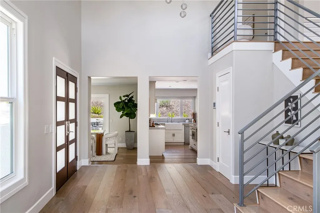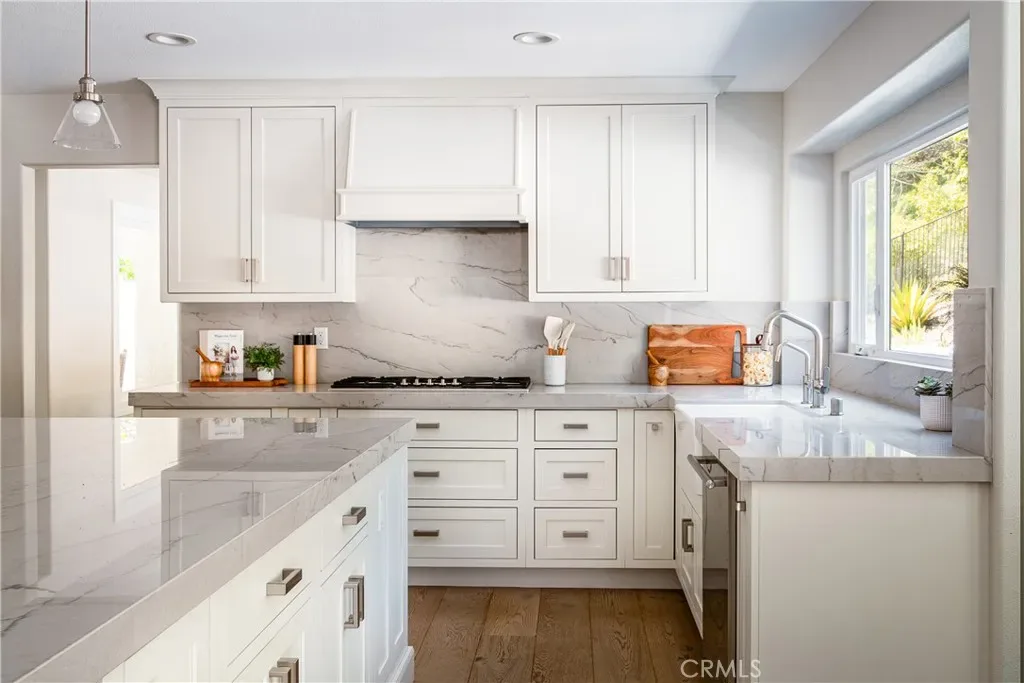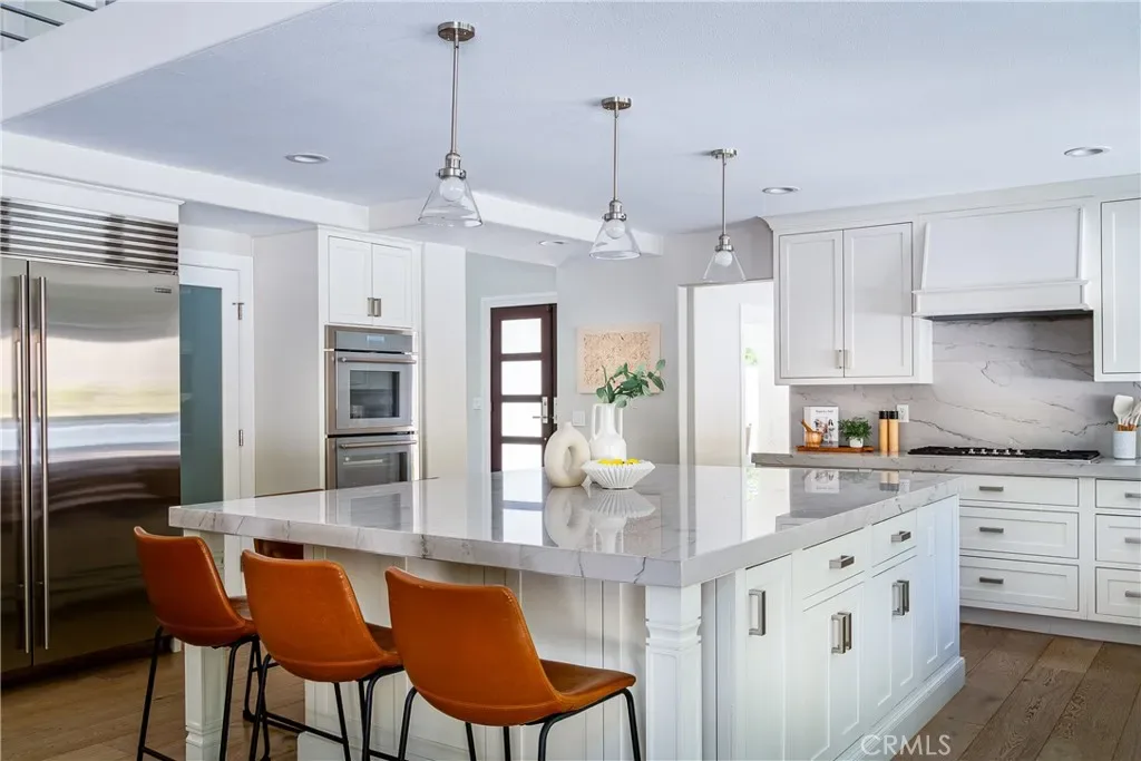 Featuring a bright and open floor plan, the home welcomes you with a two-story entry, custom staircase, high ceilings, and new hardwood floors throughout. The kitchen is centered around a large island and opens directly to the family room, complete with quartzite countertops and high-end appliances.