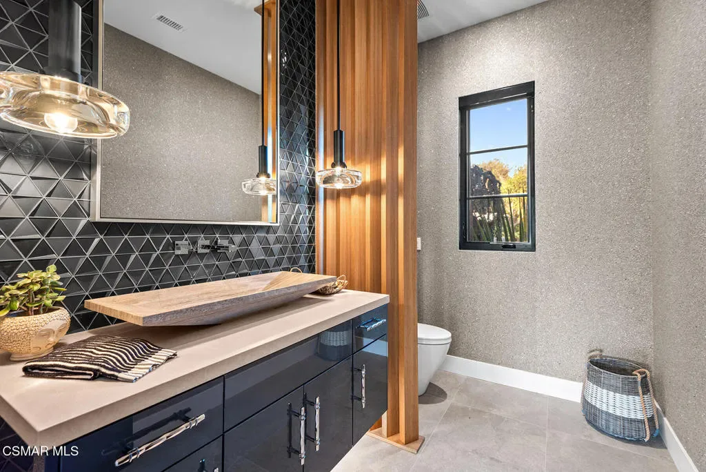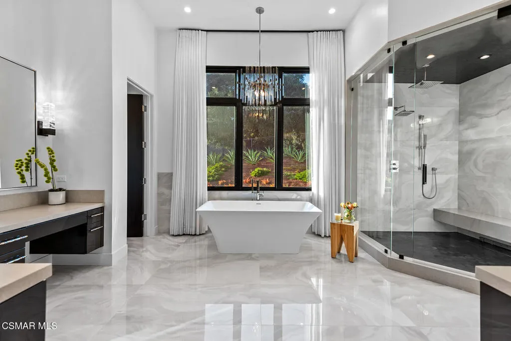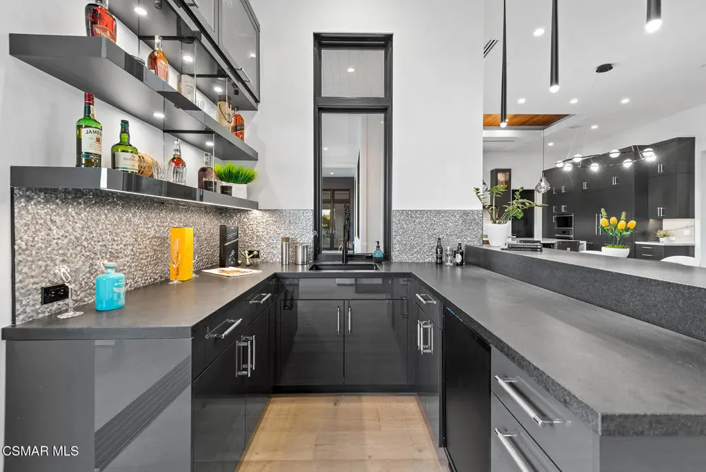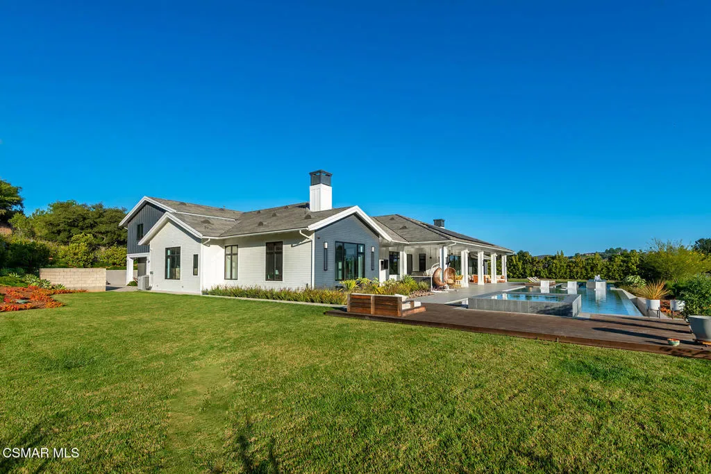 The absolute premier newly built North Ranch estate. An awe inspiring contemporary farmhouse with an ideal cul-de-sac location in upper North Ranch! Privately gated trophy custom on over two acres with stunning mountain views! No expense was spared to create this true masterpiece! Livable as mostly one level, this amazing open concept floor plan spans over 7000 square feet. Features include a grand ‘great room’ with 10 foot multi-slide Fleetwood glass doors, floor to ceiling stone fireplace and a beautifully designed soaring ceiling with wood accents. There is also a separate theater/bonus room (6th bedroom), two sided glass wine cellar, walk in wet bar and so much more! Up the floating stairs you will find an additional family room and two large secondary en-suite bedrooms, one of which serves as a second primary suite option. Perfect for guest quarters! The home is elevator ready if desired. The main level primary suite is extraordinary. There are two large walk in closets, tremendous fireplace, sitting room and a Four Seasons quality bathroom with steam shower and soaker tub. The resort quality grounds are second to none. There is a 90 foot infinity pool enhanced by fire & water features. There is also 1300 square feet of covered outdoor living, barbecue center and massive manicured lawns. Other amenities include a smart home and solar systems, FIVE car garage, Sonos sound, security cameras, large glass pivot front door and so much more. A very exciting estate to hit North Ranch.