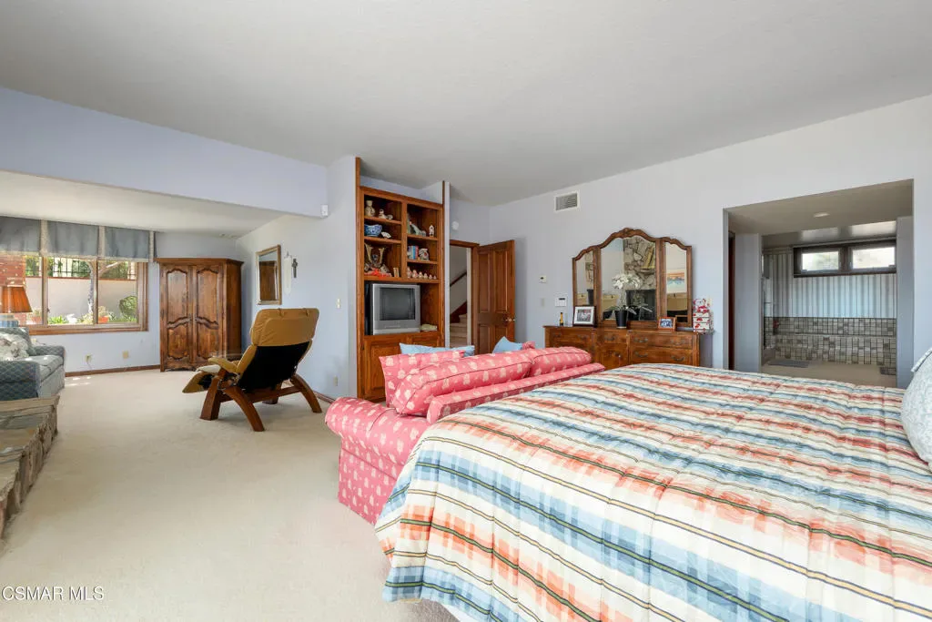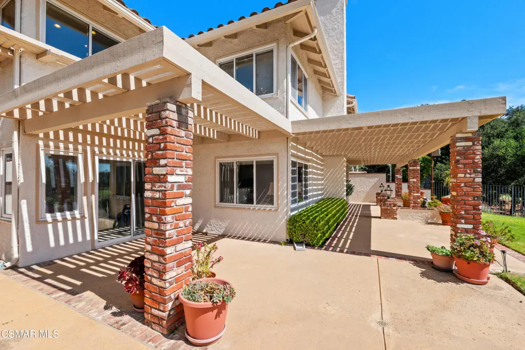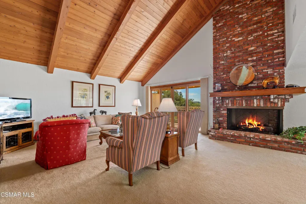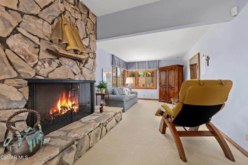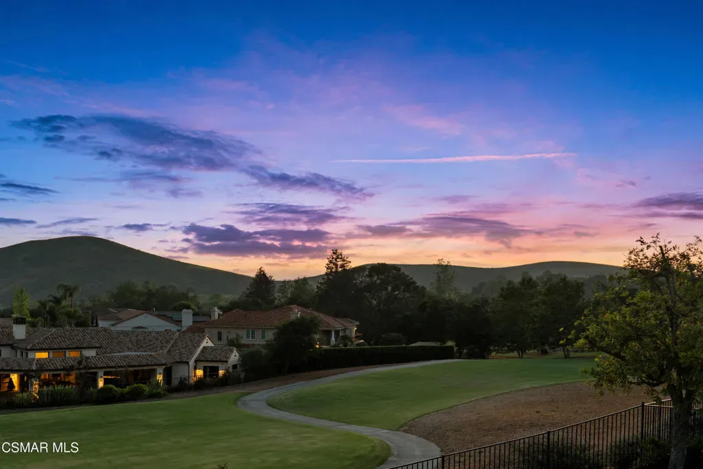 Set along picturesque Rayburn Street in the highly sought-after North Ranch community, this home is perched overlooking the 6th fairway of the North Ranch Golf Course, capturing sweeping views of majestic oak trees, lush fairways, and the Santa Monica Mountains. Dramatic wood-beam ceilings infuse the home with character and warmth, while expansive windows and sliding glass doors invite in natural light and frame the stunning vistas beyond. The family and dining rooms are anchored by a striking two-sided brick fireplace and wet bar, ideal for entertaining or relaxed everyday living. Enjoy morning coffee or an evening sunset from the viewing deck and watch as the changing colors dance along the nature surrounding you. The spacious kitchen offers ample cabinetry, generous prep space, newer appliances, and a cozy breakfast nook. A main-level bedroom with adjacent full bath + space to convert to a 4 bedroom provides flexibility. Privately situated on the lower level, the Primary Suite includes a fireplace, lounge area, walk-in closet, veranda access with golf course views, and a spacious bath with dual vanities and soaking tub. A secondary bedroom with ensuite bath and walk-in closet completes the lower level. Multiple patios and a low maintenance yard offer versatile spaces for outdoor entertainment, dining, or quiet relaxation while soaking in unforgettable views. The peaceful sounds of birds and evening crickets fill the breeze as you settle into the outdoor spa, all while enjoying sunset views over the golf course and mountains. Additional highlights include a 3-car garage, laundry room with utility sink, and dual-pane windows. Every moment feels like a vacation when you’re here, yet you’re moments away from exceptional restaurants, shopping, freeway access, outdoor activities, and the North Ranch Country Club.