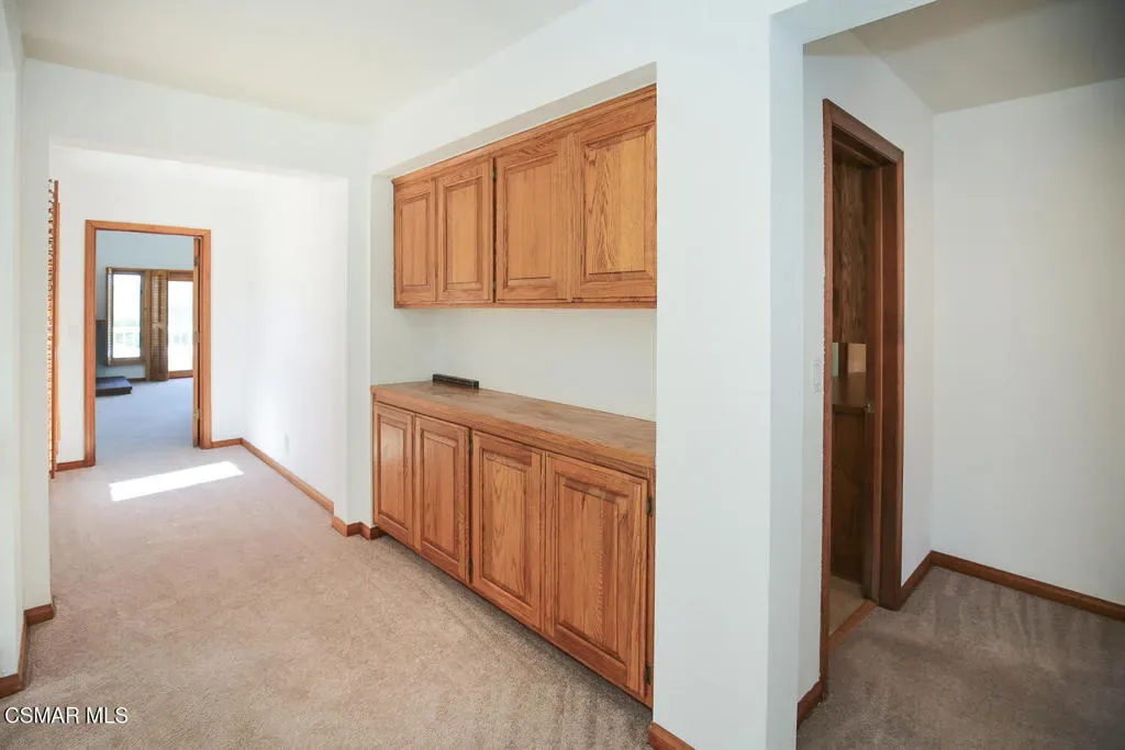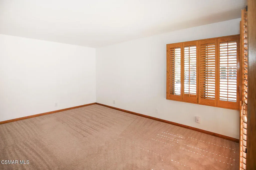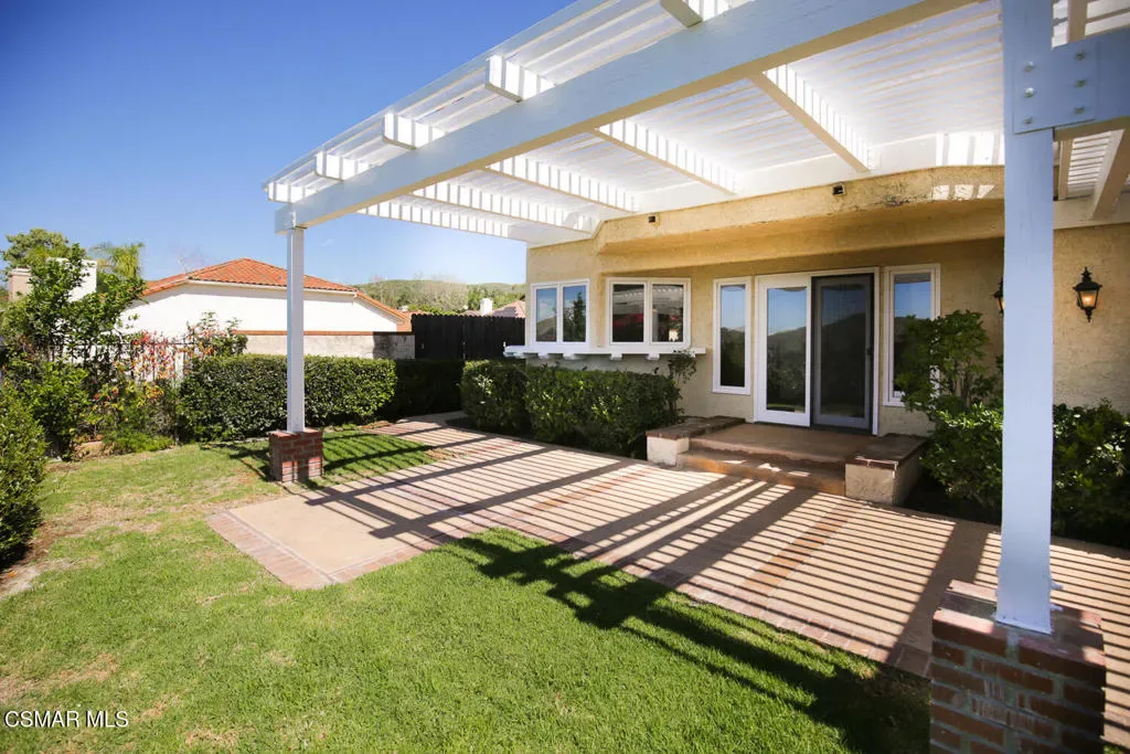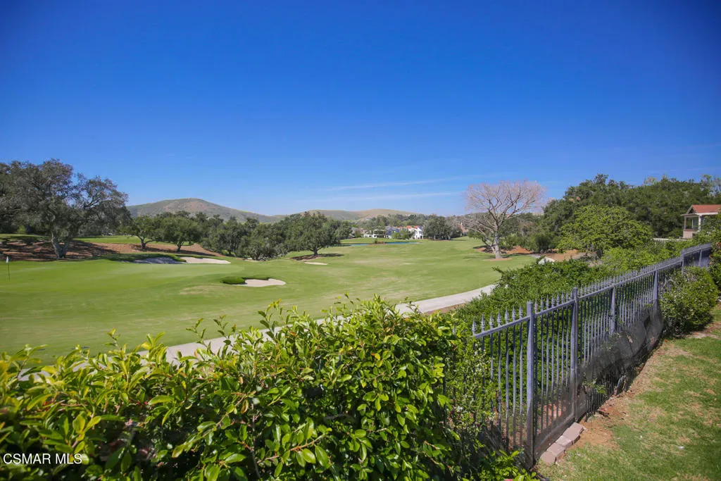 Unobstructed Views of Golf Course and Hills of North Ranch Country Club. This unique home with formal living room has high ceiling, French doors, and opens to formal dining room with serene views of Golf Course. Spacious kitchen with Granite Counter tops, plenty of counter space and a roomy breakfast area with huge bay window. Family room with wet bar and fireplace perfect for entertaining also with sliding doors open to nice patio. A winding staircase takes you to four nice sized bedrooms. Master suite with fireplace, large walking closet, step down sitting room and huge balcony to enjoy beautiful view of Golf Course. House has some window shutters. Newer Clay Tile Roof and 3 car garage door. Kitchen has a dishwasher, double oven. Close to award winning schools.