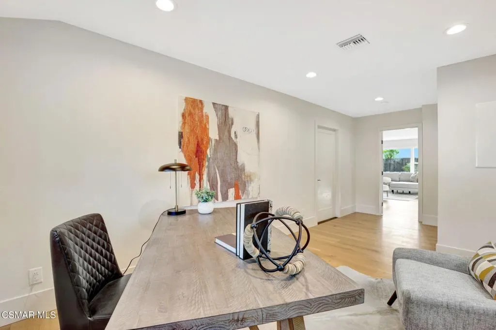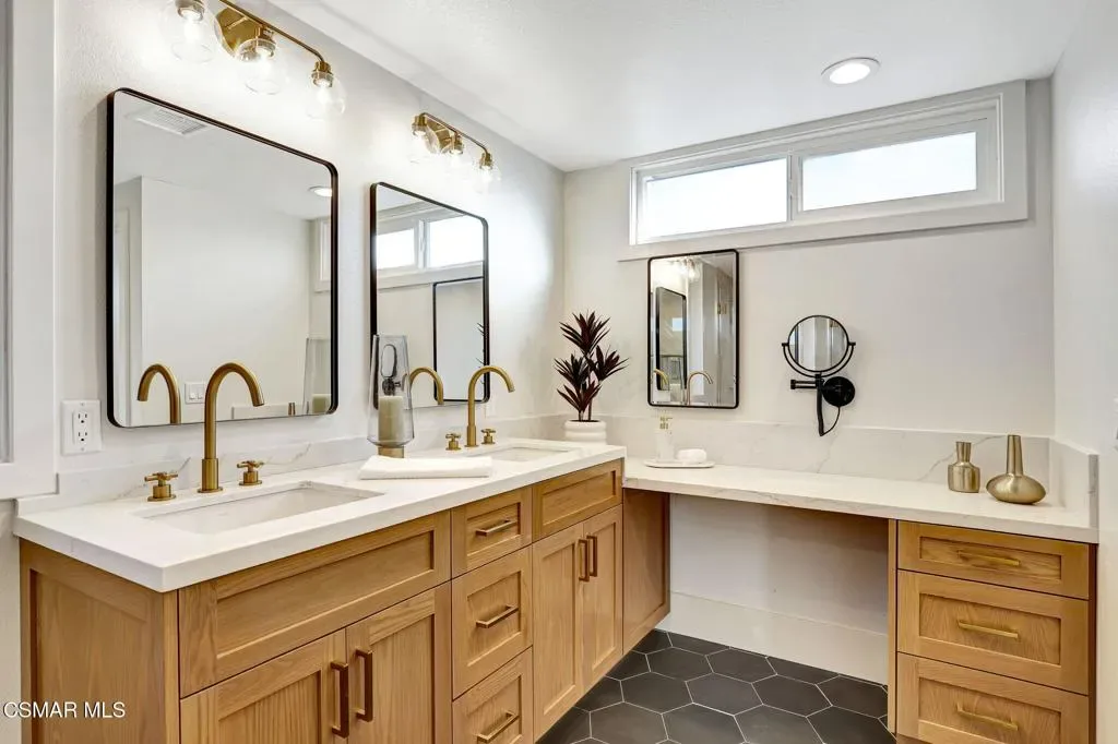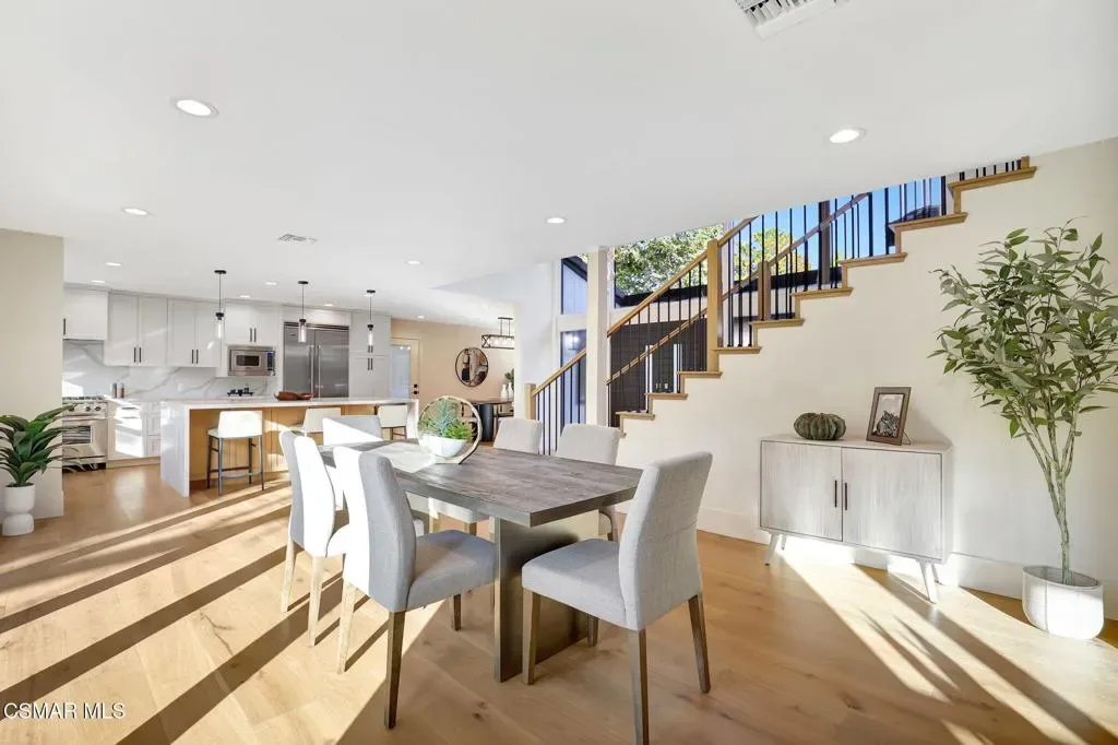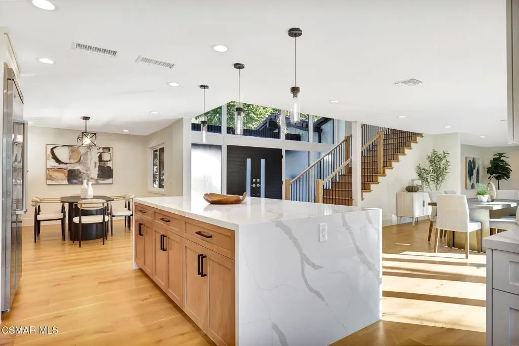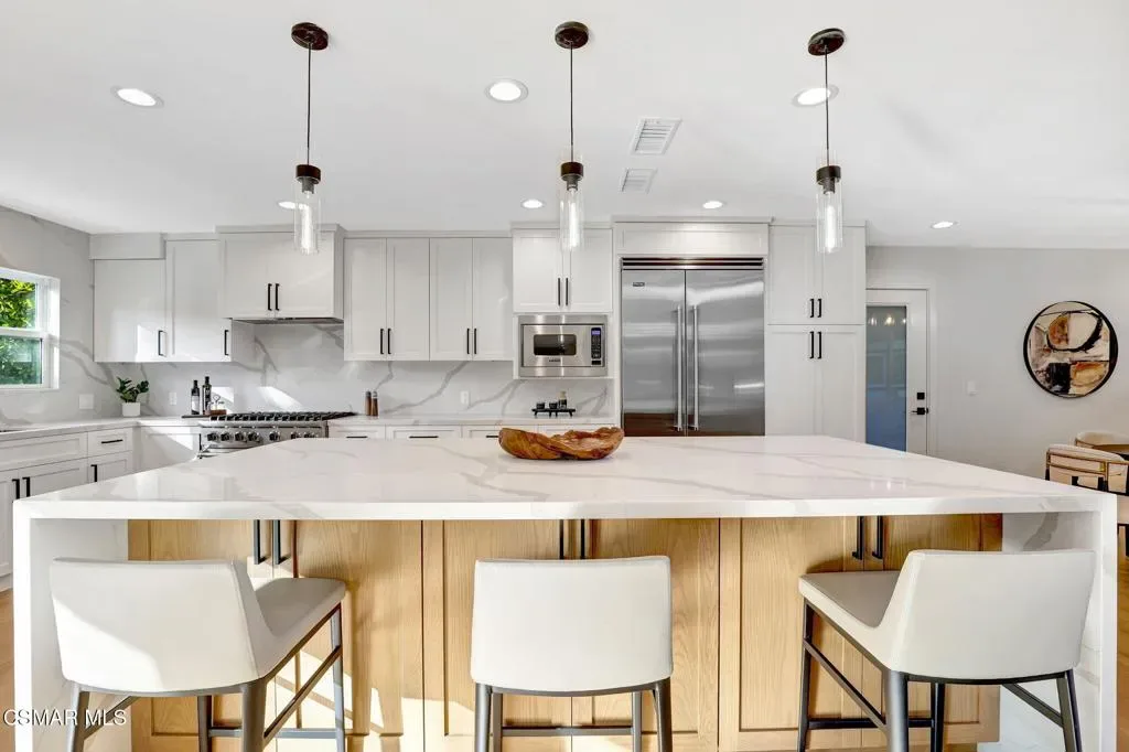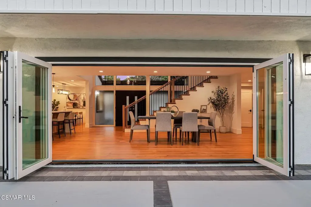 Step into this gorgeous, completely remodeled modern masterpiece located in the heart of Foxmoor, one of Westlake Village’s most coveted neighborhoods. Situated on a peaceful cul-de-sac RIGHT NEXT to the greenbelt, this home has been fully upgraded from top to bottom with a fresh modern aesthetic and recreated to illustrate the California lifestyle, with seamless indoor-outdoor living and entertaining at its absolute best! As you approach, you are welcomed by the BRAND NEW charcoal paver driveway and walkway with lush green landscaping. The flooring in this home is European white oak engineered wood with wide 9” planks and NEW custom cabinetry all throughout. The expansive entryway reveals soaring ceilings, a beautiful modern gold light chandelier, marvelous white oak staircase and a new open concept design. The exquisite designer kitchen is a chef’s dream, boasting Vadara quartz countertops, high-end Viking appliances, and a massive island with waterfall edges. Harmonious indoor-outdoor entertaining awaits with spacious living and dining areas that open through bifold doors to a beautifully landscaped backyard. Completing the first floor is a full bath with a newly added standing shower, office and laundry room, leading into the finished garage with crisp epoxy floors. Upstairs you will love the spacious primary suite, plus three bedrooms, and secondary bathroom. The primary suite is equipped with vaulted ceilings, 2 large closets, a newly expanded and reimagined spa-like primary bathroom with a huge walk-in shower, double vanity and make-up station. Enjoy peace of mind with fully permitted upgrades to the electrical, plumbing, and HVAC systems. This home is just steps away from award-winning Westlake Elementary, with wonderful shopping and restaurants close by. Experience luxury living where no expense was spared. Welcome to your new home!