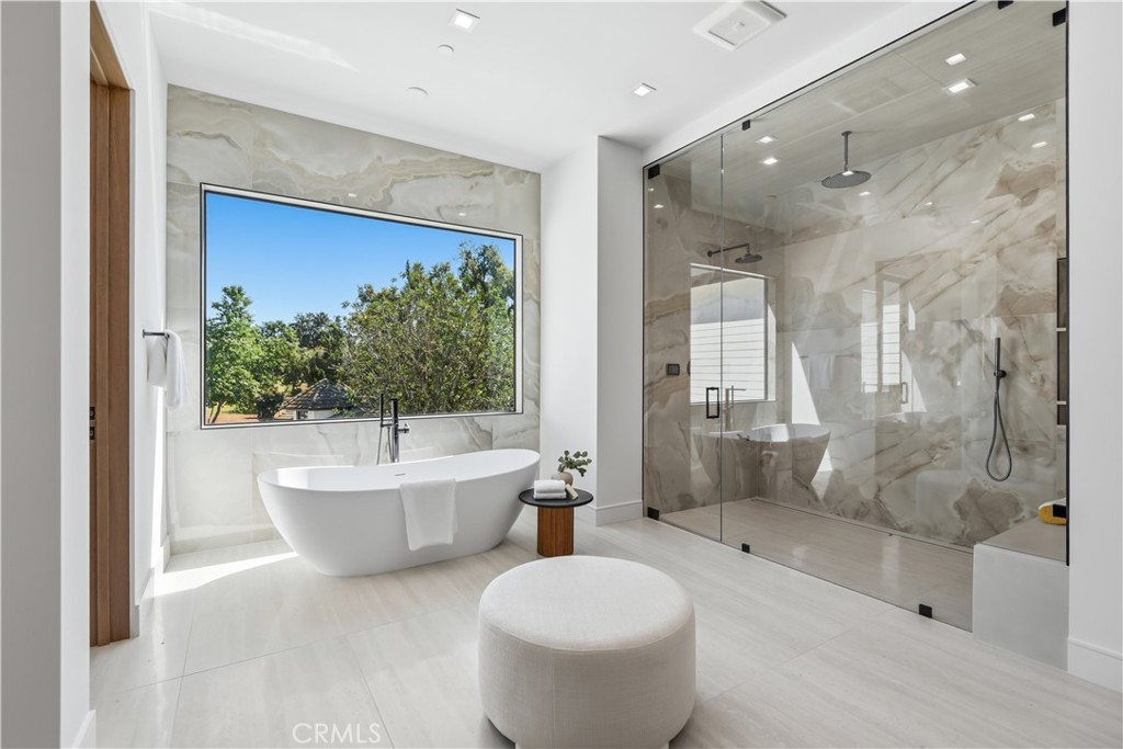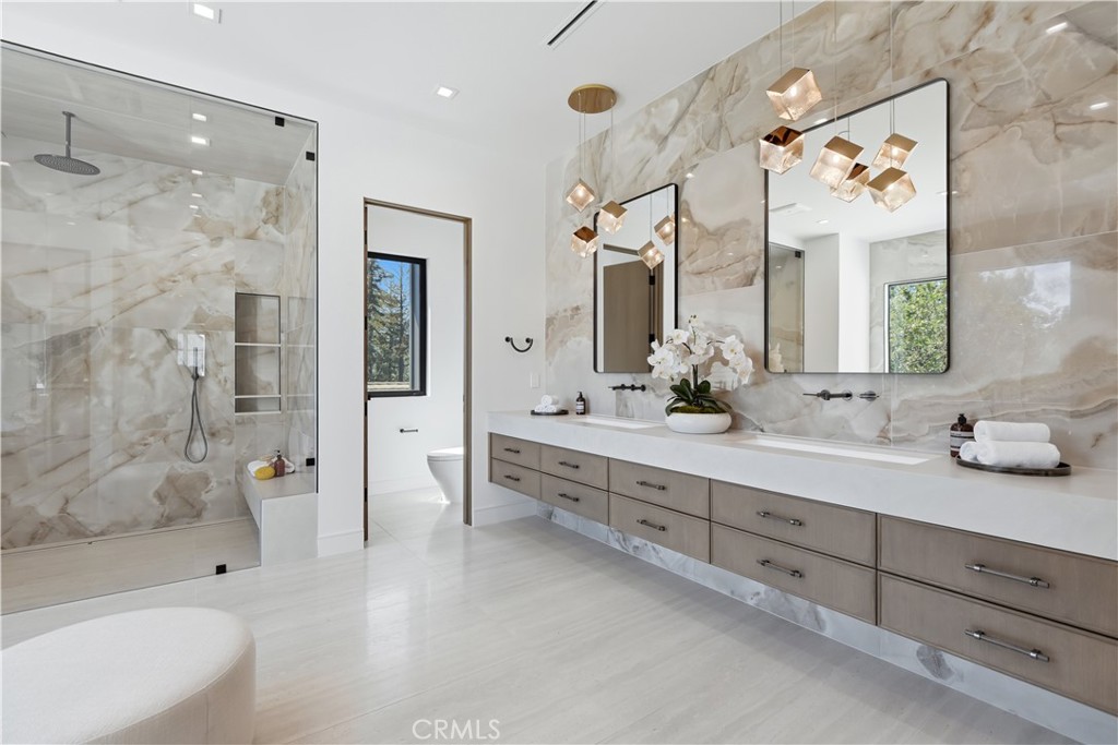 This gorgeous, brand new view estate with a premier location in the heart of North Ranch, is sited at the end of the cul de sac on a privately gated street. Spanning over 9,000 square feet of luxury living (with guest house) and boasting sensational views of the fairway of North Ranch Country Club, the home features a superb, open floor plan that’s flooded with natural light and enhanced by top quality finishes throughout. There are six large ensuite bedrooms, including the stellar primary suite with retreat, two sided fireplace, all stone bath with steam shower, room sized custom closet and a big walk-out view balcony. Additional amenities include a beautiful, center island chef’s kitchen complete with counter seating, wide open to the big great room with nearly 30′ of sliding walls of glass, bringing the outdoors in, plus an adjoining lounge area with back-lit Onyx wet bar & glass encased wine cellar, a media room, and casual living & dining rooms that are perfect for easy entertaining. The spacious grounds include a sparkling pool & spa, your own pickleball court, a large sunken firepit, a big covered patio with space heaters & music, and a charming guest house with an additional bedroom, bathroom & family room. Conveniently located within easy walking distance to North Ranch community park, along with nearby shopping & restaurants, and close to the beaches of Malibu, this true custom estate has much to offer.