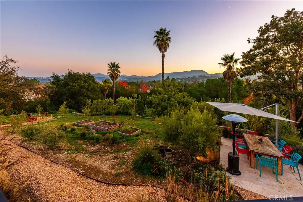 Inside, white oak flooring (engineered) flows through an open-concept layout where the kitchen, dining area, and great room are all oriented to capture sweeping mountain, sunrise, and sunset vistas. The Italian-designed kitchen is a masterwork of style and function, featuring a walk-in pantry equipped with its own HVAC, custom cabinetry, and top-tier appliances including a Gaggenau induction stove with an additional gas burner, Miele oven and refrigerator, Fisher & Paykel dishwasher, and Thermador wine refrigerator. A thoughtfully engineered climate system includes multiple mini-split units throughout the home, ensuring individualized comfort in every space. Whole-home Sonos audio, Cat 6 wiring, and a robust security network with 20 cameras for additional peace of mind. A separate laundry room adds everyday practicality. A sprawling balcony connects the primary suite, media room, secondary bedroom, and main living spaces, creating a continuous indoor–outdoor experience. The primary suite offers a sanctuary with a walk-in closet, sitting area, and a spa-caliber bath featuring a marble shower/tub floor and microcement walls – a striking retreat. The media room, complete with custom built-ins, surround sound, and a spiral staircase to a loft hideaway, provides a perfect spot for laid-back evenings or creative escapes. Four additional bedrooms offer generous flexibility for offices, guests, or family with many showcasing the home’s remarkable views. The home is equipped with a three car garage, solar panels, and a Tesla Powerwall, supporting sustainable and efficient living. Outdoors, a sparkling pool, fire pit, and enchanting Italian garden create an idyllic backdrop for sunset dinners and relaxed gatherings. Thoughtful design, luxurious finishes, and commanding views define this remarkable Westlake Village residence as an architectural retreat that offers both privacy and presence. Truly one not to be missed.