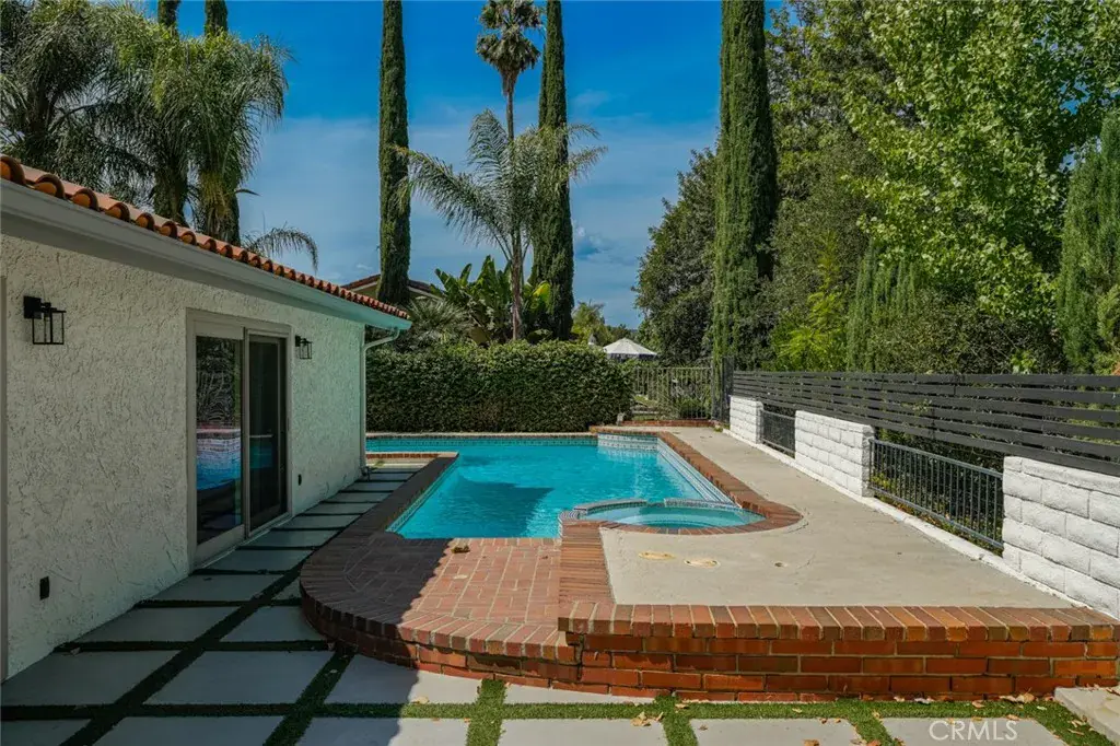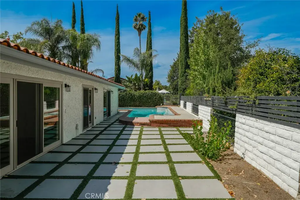 Discover this beautifully designed 4-bedroom, 2-bathroom single-story home offering 2,038 sq ft of open and inviting living space. The open floor plan is filled with abundant natural light from large glass doors and multiple windows, creating a bright and airy atmosphere throughout. The kitchen is both stylish and functional, featuring a center island perfect for casual dining, along with ample counter space and generous storage. The living room serves as a stunning focal point with a dramatic floor-to-ceiling fireplace, ideal for relaxing or entertaining. Situated on a spacious 9,583 sq ft lot, the exterior is equally impressive with a modern permeable patio and a large in-ground pool that thoughtfully wraps around the corner of the home, maximizing outdoor living space. This home seamlessly blends comfort, design, and indoor-outdoor living.