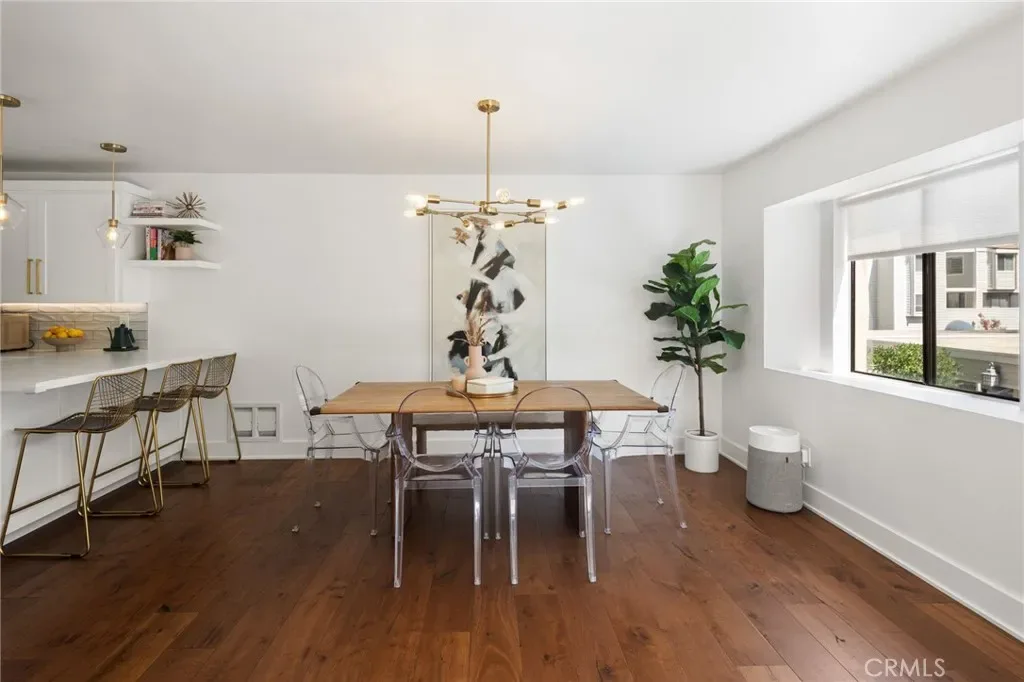 On the next level, the bright kitchen includes bar seating, a new refrigerator, and opens to a dining area and a cozy second living room-style space with access to a sunny balcony, ideal for morning coffee or evening cocktails.