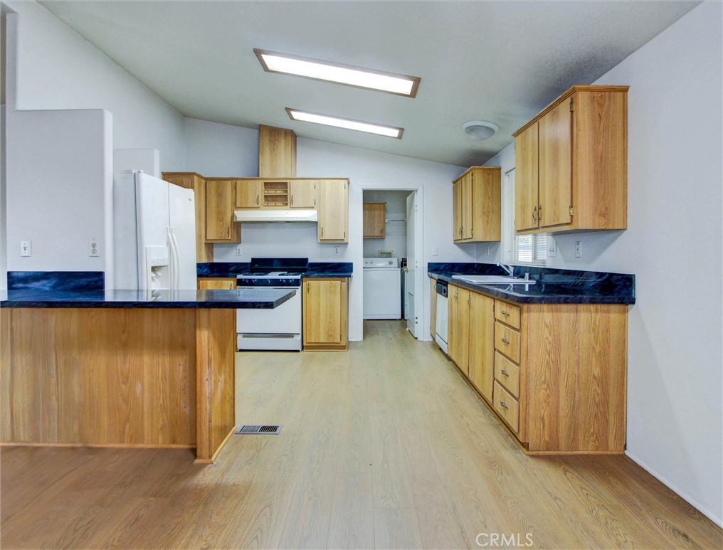 Spacious and well-maintained double-wide manufactured home featuring a comfortable and functional floor plan, located in a desirable all-age community. The home features water-resistant flooring throughout, offering both durability and style. The kitchen opens to a generously sized dining area, creating a functional and inviting space for everyday living and entertaining. The living and dining areas provide added comfort and flexibility, allowing for a variety of layout options. For added convenience, the home includes a washer and dryer, making laundry days effortless, along with additional space ideal for storage or multi-purpose use. The primary bedroom features a private ensuite bath complete with a soaking tub and separate shower, enhanced by abundant natural light from multiple windows and a skylight. Enjoy relaxing on the extended front porch—perfect for morning coffee or quiet afternoons. The rear and side yard offer excellent space for gardening and seasonal blooms. Additional highlights include a convenient storage shed and an attached carport accommodating multiple vehicles, along with ample guest parking nearby. The community is pet-friendly. Ideally located just minutes from major freeways, shopping, dining, local parks, and the beach, this home offers easy access to everything Westminster has to offer. The Beach Boulevard Cottages community is currently undergoing improvements and features desirable amenities such as a sparkling pool, clubhouse, on-site laundry facilities, and a car-wash area. Blending comfort and practicality, this inviting home offers relaxed living with the opportunity to add your personal touches.