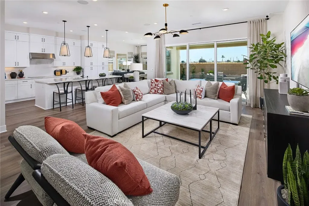 NO MELLO ROOS, LOW HOA, FURNISHED MODEL HOME just released for sale. Single Family Residence, fully landscaped front/back on an end/corner lot. Floorplan lives almost entirely like a single level with Primary Suite at main floor, complemented by additional Bed + ensuite Bath, w/ a Flex room and covered Outdoor Room. Open Great Room/Kitchen/Dining frame the centerpiece of floorplan, with a large Bonus room upstairs opposite two additional Bedrooms, each with their own ensuite Baths. Included purchased solar power system, washer/dryer/fridge and designer-curated finishes consist of GE Café Series SS appliances, Quartz countertops, kitchen island pendant lighting, LVP and tile flooring. Desirable schools, Los Angeles and Orange County commuter routes nearby. Seller concessions available, ESTIMATED JUNE MOVE IN.