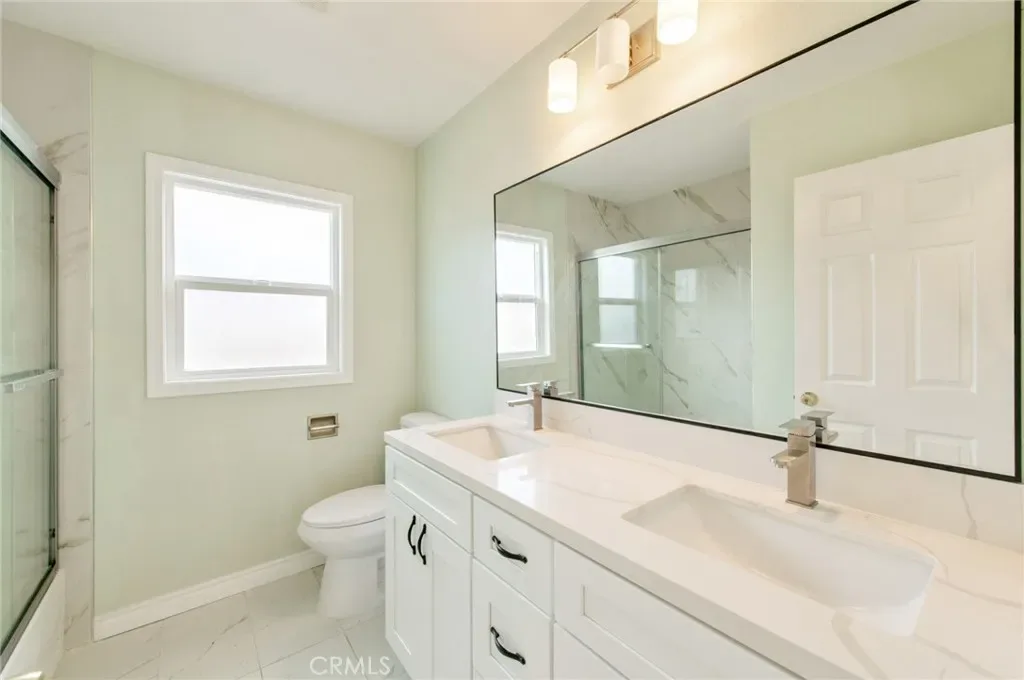 The fully remodeled kitchen showcases a modern black-and-white design, complete with ample cabinetry, generous counter space, and excellent storage.