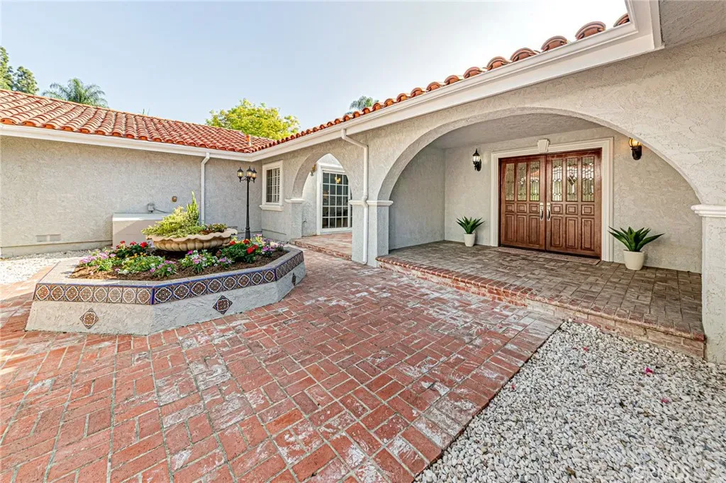 Privately gated, the home welcomes you into a charming courtyard with a custom planter centerpiece. Inside, the layout is enhanced by arched architectural details and travertine and wood flooring throughout. The floor plan includes a formal living room and family room with fireplaces, while the formal dining room is currently used as an office.