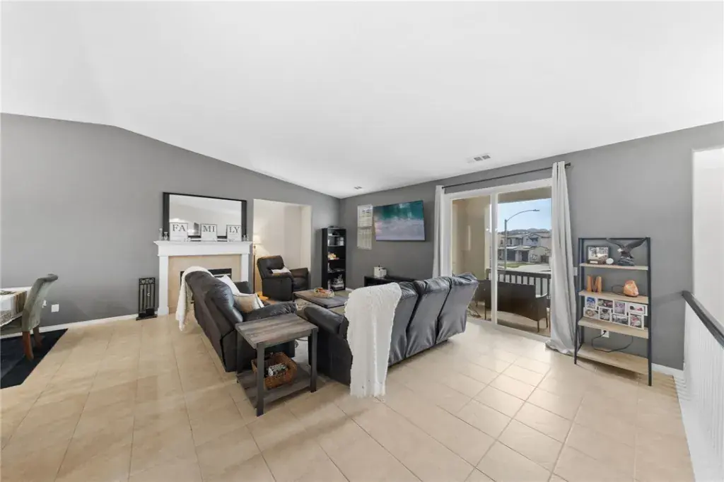Upstairs, enjoy an open-concept main living area filled with natural light. The kitchen features a large island with granite tile countertops, black granite utility sink, walk-in pantry, newer appliances, and seamless flow into the family room complete with a cozy fireplace and private balcony showcasing mountain views. The primary suite includes an ensuite bathroom with dual sinks, a soaking tub, builder-upgraded oversized shower with dual shower heads, and a walk-in closet. An additional full bathroom and flexible sixth bedroom — currently used as an office — complete the upper level.