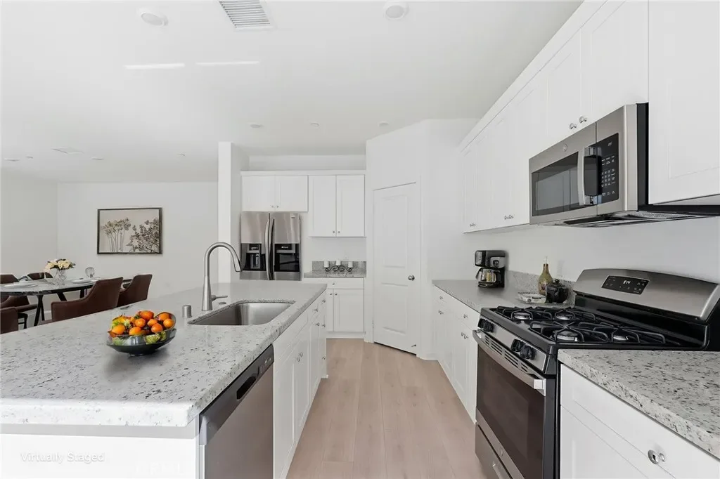 Welcome to this beautifully designed new construction home in the desirable Courts at French Valley community of Winchester. This light-filled residence offers an open-concept layout with wide-plank flooring, recessed lighting, and a spacious great room that flows into the dining area and modern kitchen. The kitchen features quartz countertops, white cabinetry, stainless steel appliances, a gas range, and a large center island with bar seating perfect for entertaining. Sliding doors lead to a private backyard with low-maintenance landscaping and a patio ideal for outdoor dining. Additional highlights include an attached 2-car garage, energy-efficient construction, and 9 paid-off solar panels for added savings. Located in a newer planned community with HOA amenities and within the Temecula Valley Unified School District, near parks, shopping, and commuter routes.