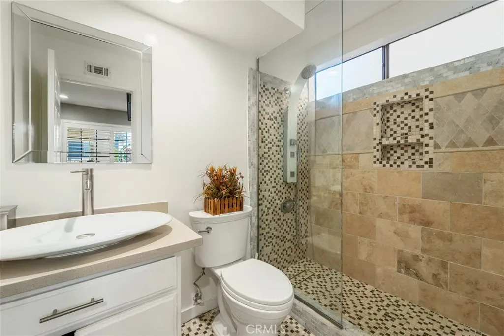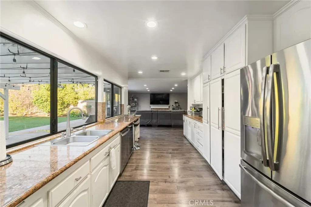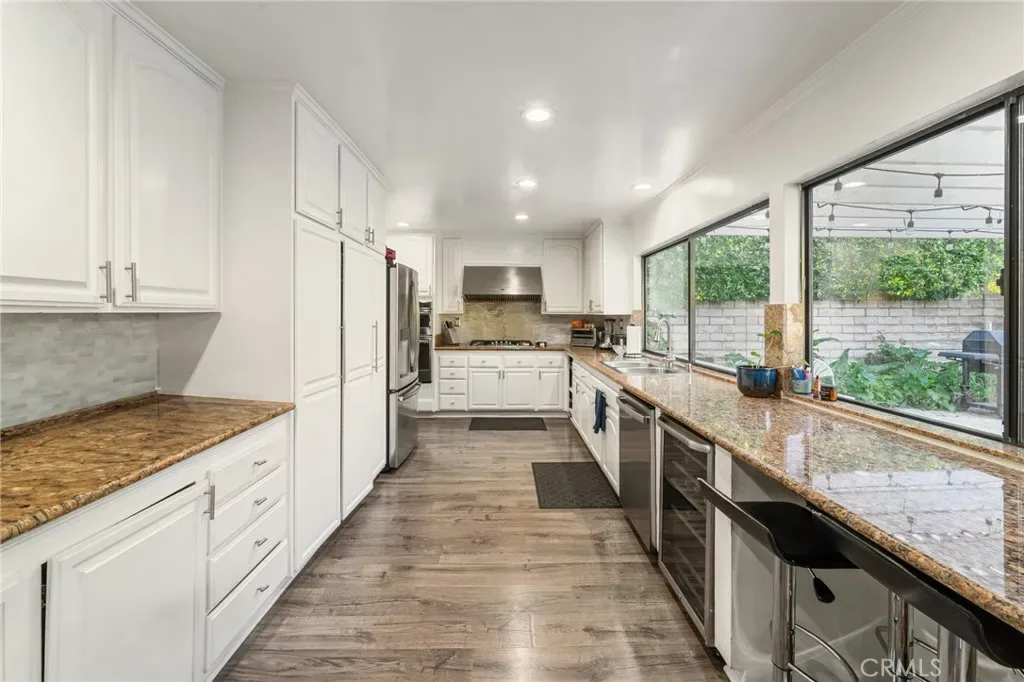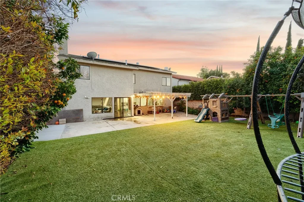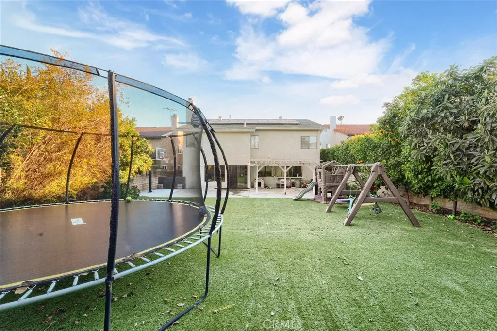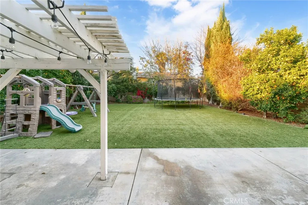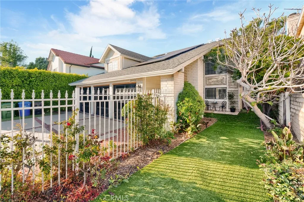 The spacious kitchen is appointed with granite countertops, abundant cabinetry, stainless steel appliances, and an extended counter with bar seating overlooking the backyard. Large picture windows fill the space with natural light and offer views of the outdoor entertaining areas. A generously sized family room with a fireplace provides additional space to relax or host, while a downstairs bedroom with an adjacent bath offers flexibility for guests, in-laws, or a private home office. Upstairs, the expansive primary suite features ample closet space and a large ensuite bath with soaking tub, separate shower, and dual vanities. Additional bedrooms are well-proportioned, offering comfort and versatility. The backyard is designed for year-round enjoyment, featuring artificial turf, mature landscaping, a covered patio with string lighting, basketball hoop, and multiple areas for recreation and entertaining. Solar panels provide added efficiency and long-term savings. Ideally located near Westfield Topanga & The Village, Warner Center, Costco, Pierce College, and local parks, with convenient access to the 101 and 118 freeways, this home offers both space and connectivity in the heart of the West Valley. With nearly 3,000 square feet of living space and a prime cul-de-sac setting, 7,675 sqft expansive lot, this Winnetka residence delivers comfort, functionality, and lifestyle in one complete package.