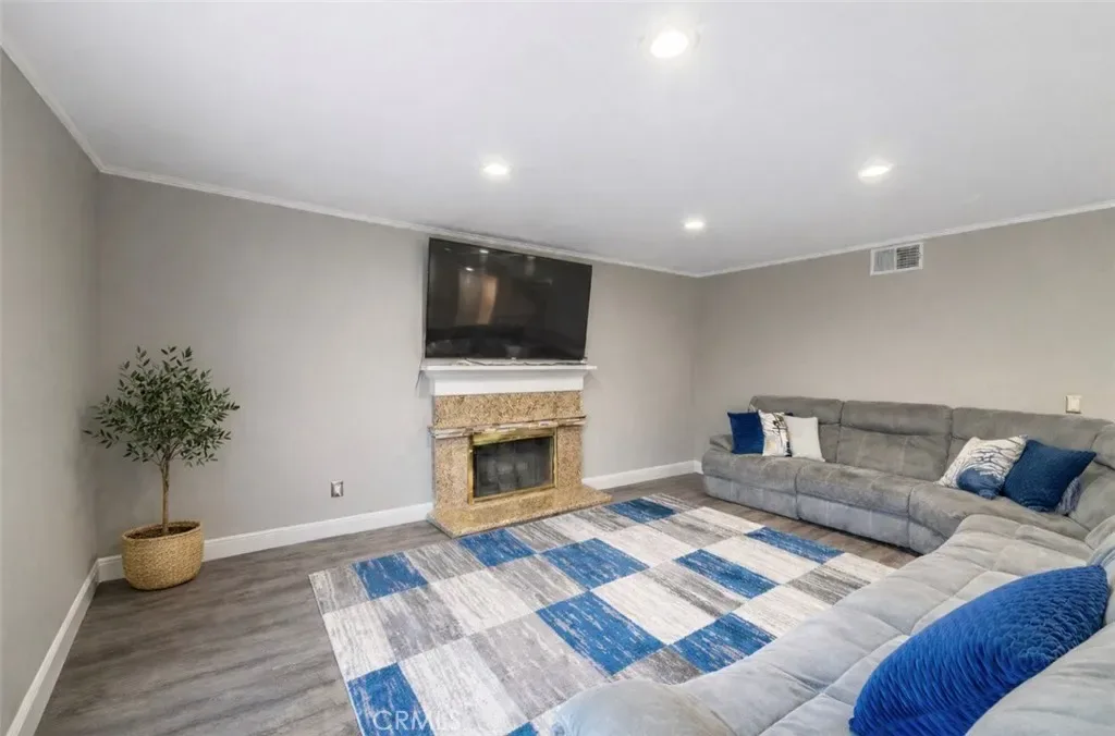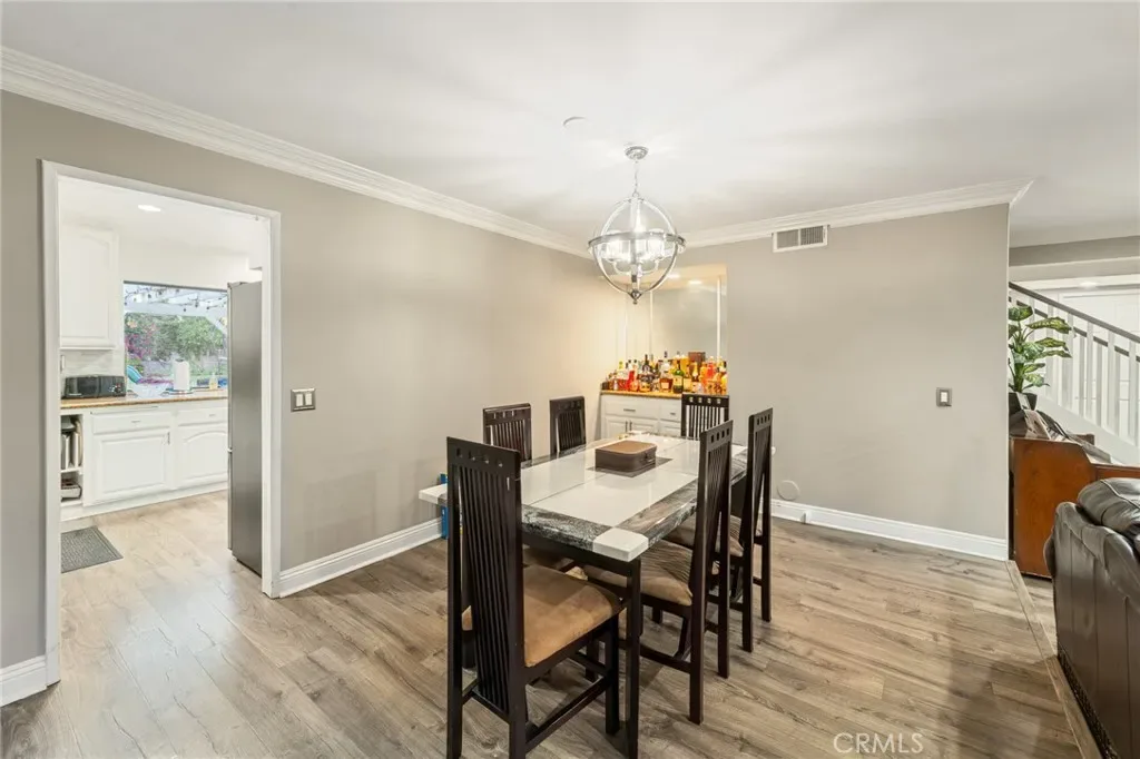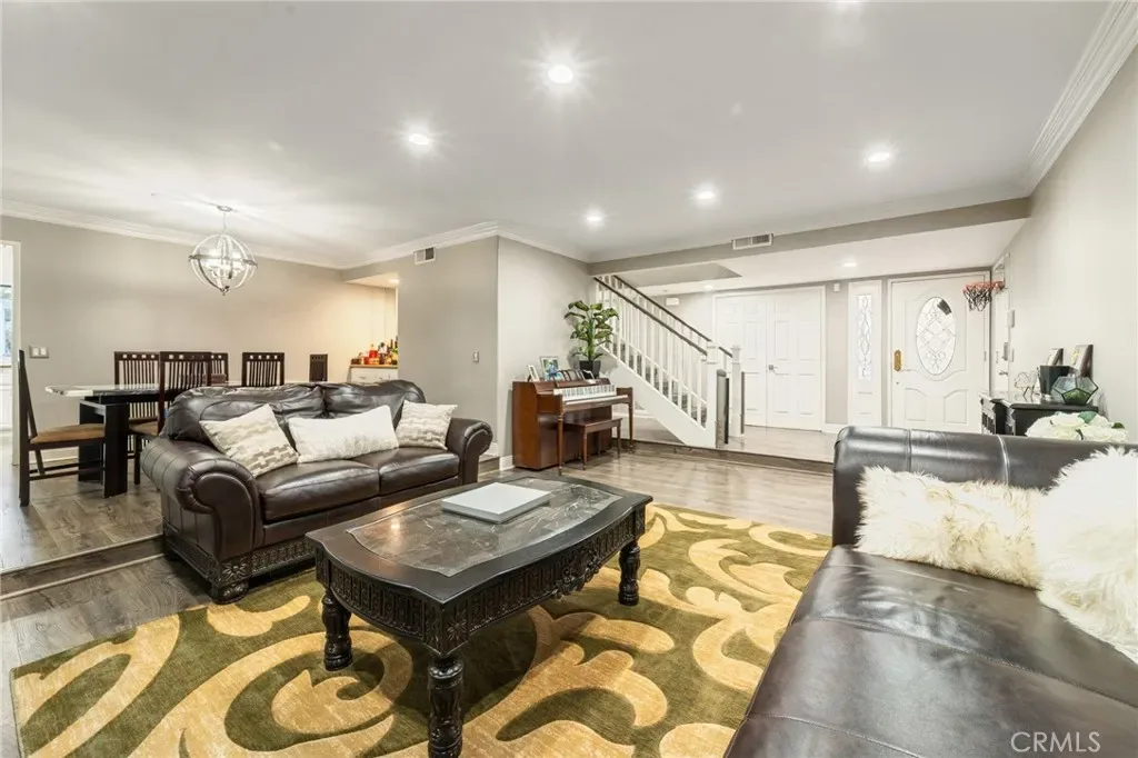 A welcoming double-door entry opens to bright, oversized living areas enhanced by recessed lighting, crown molding, and wide-plank wood-style flooring throughout. The formal living and dining areas flow seamlessly together, creating an ideal setting for gatherings and entertaining.
