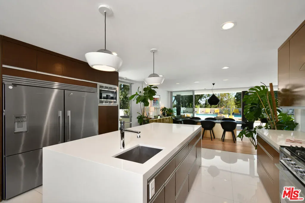 Mid-century lines, Palm Springs spirit, and mountain views beyond come together in a way that just feels easy. Set behind gates on a rare, 26,000 sq ft lot, this single-story home has been thoughtfully reimagined with a relaxed, design-forward sensibility. Four bedrooms and five baths are wrapped into a layout that flows, balancing clean architectural lines with warm, livable textures. Inside, the main living space is filled with light. It’s open without feeling exposed, anchored by a fireside lounge and a kitchen that naturally invites people to gather with a glass of wine and good converation. Glass walls pull your attention outward, framing treetop and city views that shift with the light throughout the day.The backyard is where everything slows down. A pool and spa sit at the center, surrounded by lounge areas, a firepit, BBQ station and an outdoor bar that makes hosting effortless. The landscaping leans into that desert-modern vibe, giving it just enough Palm Springs energy without losing its Woodland Hills setting. The kitchen stands out without overpowering the space, PS Wenge cabinetry, artisan glass, high-end appliances, and expansive center island that naturally becomes the heart of the home. The bedroom wing features a primary suite with expansive glass doors offering direct access offering garden and pool views , creating that indoor-outdoor rhythm that defines California living. The bath is bright and calming, with a soaking tub, oversized shower, and clean, modern finishes. Just beyond, a grassy, tree-shaded area offers a softer, more private outdoor moment. Every finish feels intentional; Porcelanosa and Italian tile,custom windows, wide-plank wood floors. Nothing overdone, nothing overlooked.