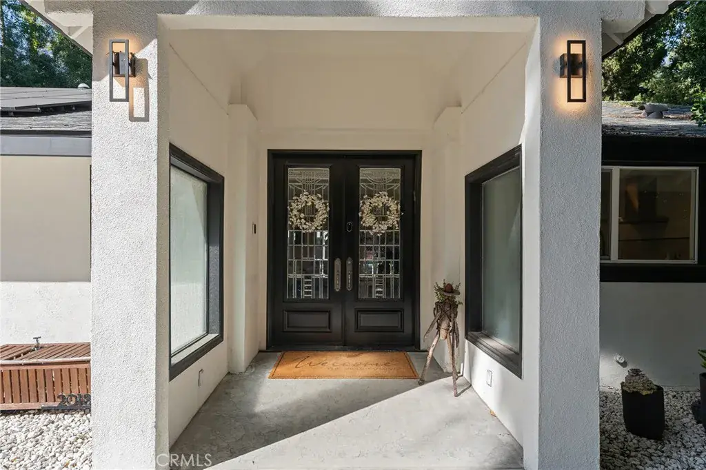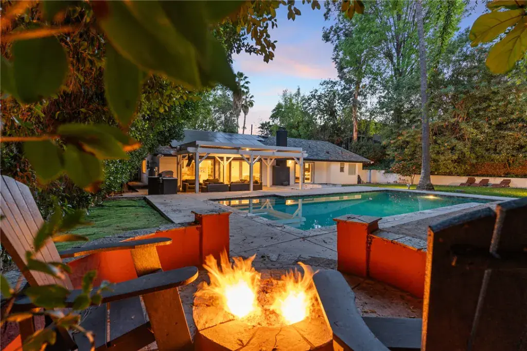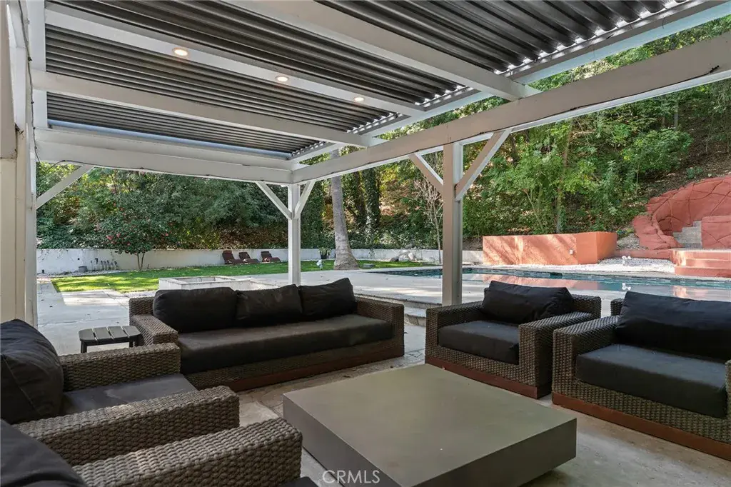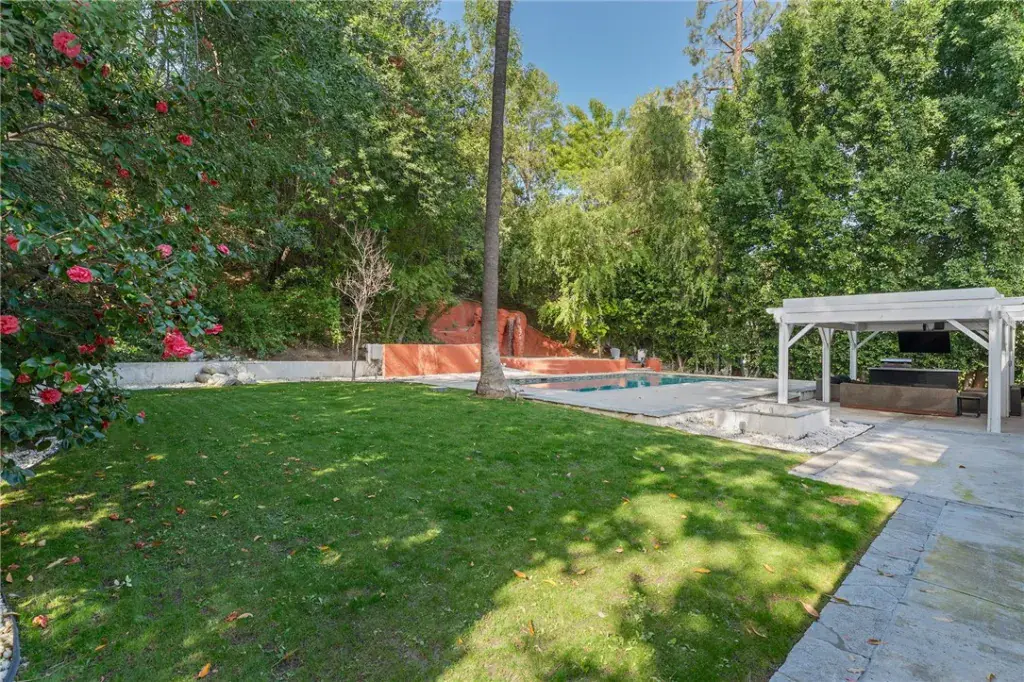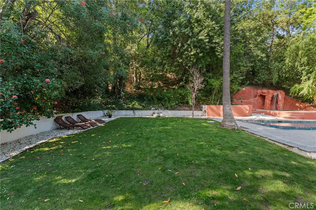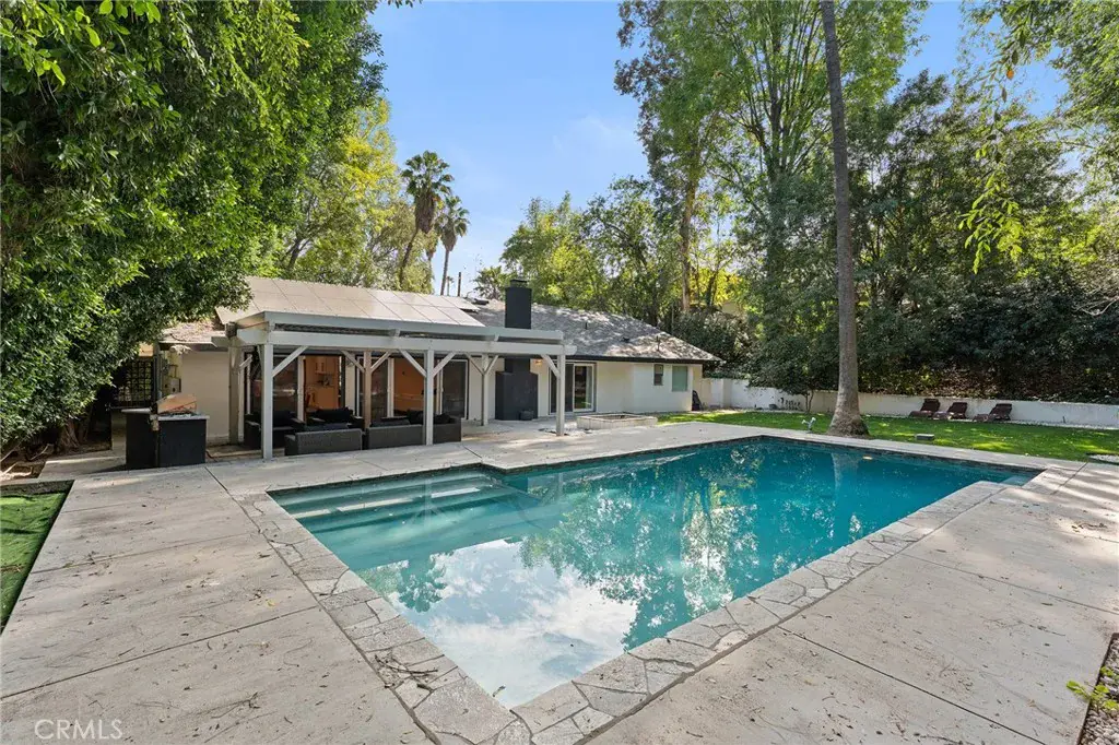 Extremely private single story gated estate located on a sprawling 20,000 SF lot South of the Blvd in the highly desirable neighborhood of Vista De Oro. The property sits far back from the street behind an automatic security gate and mature privacy hedging. An oversized driveway can accommodate parking for large gatherings and leads to the attached 2-car garage with 2 EV chargers. The grand double door entry foyer opens to a light and bright completely open floor plan with direct sight of the backyard setting an immediate tone for indoor/outdoor entertaining. The spacious family room has a plaster finished fireplace, tray ceiling, sliding glass doors that open to the yard, and wide plank hardwood floors found throughout. The equally large dining room also features a decorative tray ceiling and another glass slider that opens to the yard. The completely remodeled expansive kitchen opens directly to the living spaces and boasts center island with breakfast bar seating, Carrera marble counters & backsplash, custom soft close cabinetry, stainless appliances including a Miele range, and separate walk-in pantry. There are three well appointed bedrooms each with their own en-suite bathrooms. The primary bedroom features double door entry, glass slider that opens to the yard, large walk-in closet, and private luxurious remodeled bathroom with dual sinks, spa tub, and walk-in shower. The second bedroom suite has closet with custom built-ins and private remodeled bathroom with tub and shower. The third bedroom is located off the entry making it the ideal office or guest suite with access to a remodeled bathroom with dual sinks and walk-in shower, perfect for powder bathroom use as well. The garage is completely finished with laundry area and large attic, providing perfect flex space for play room/gym/etc but still is a fully operational garage. The stunning backyard features pebble finished saltwater swimming pool and resort style spa grotto with cascading waterfall, smart covered patio with misters, BBQ center with sink, gas fire pit, huge grass lawn for play, and gorgeous canopy trees providing ultimate privacy from neighbors. Additional upgrades include completely owned solar panels, two Tesla power walls, “Brilliant” smart home lighting, and “Span” smart home electrical panel. Sale also comes with plans/estimates for ADU & JR ADU. Adjacent to Westfield Topanga Mall/Village, Warner Center, hiking trails and easy access to the beach and freeways.