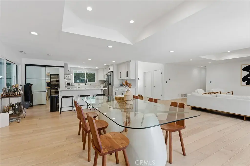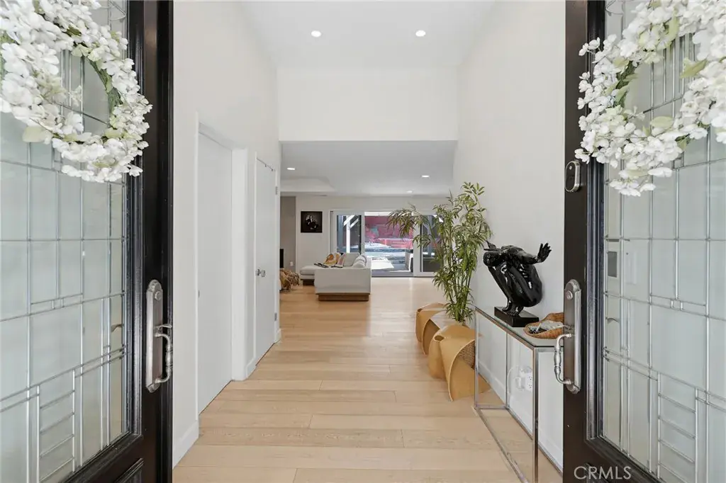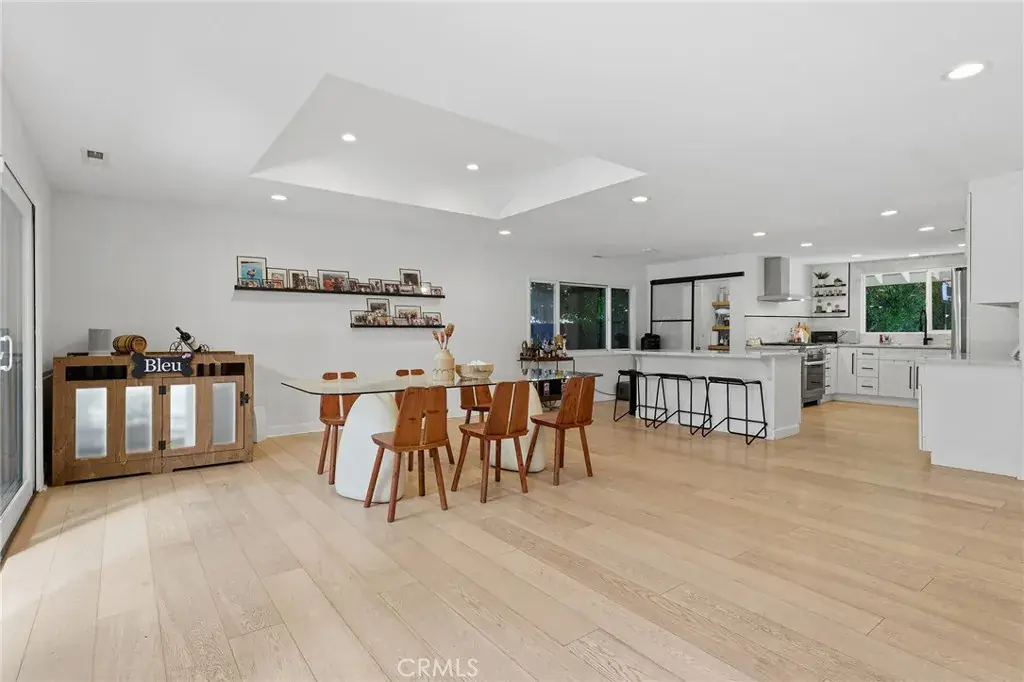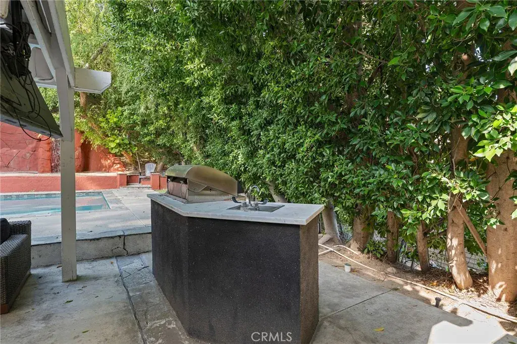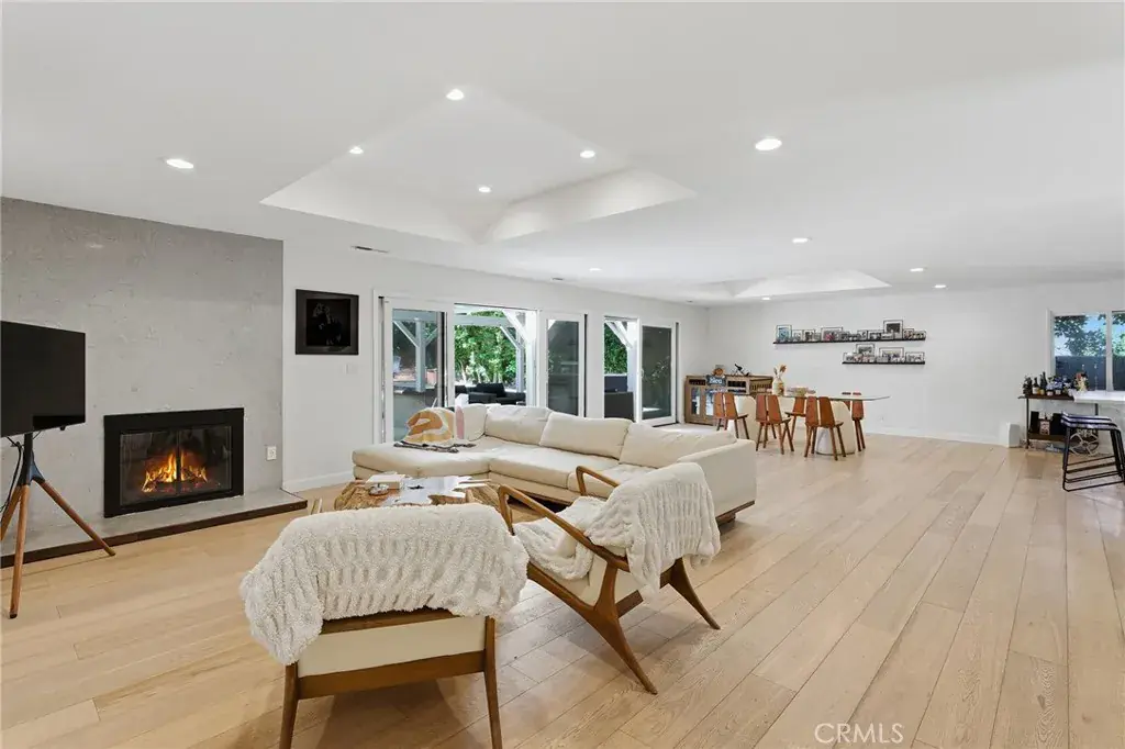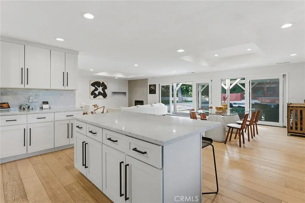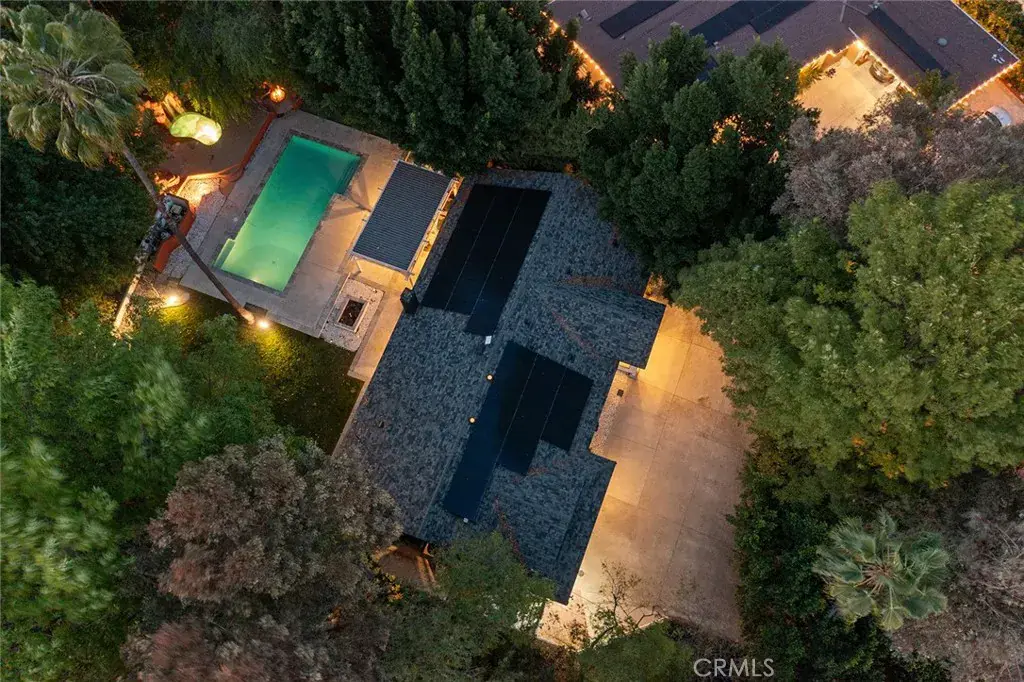 Extremely private single story gated estate located on a sprawling 20,000 SF lot South of the Blvd in the highly desirable neighborhood of Vista De Oro. The property sits far back from the street behind an automatic security gate and mature privacy hedging. An oversized driveway can accommodate parking for large gatherings and leads to the attached 2-car garage with 2 EV chargers. The grand double door entry foyer opens to a light and bright completely open floor plan with direct sight of the backyard setting an immediate tone for indoor/outdoor entertaining. The spacious family room has a plaster finished fireplace, tray ceiling, sliding glass doors that open to the yard, and wide plank hardwood floors found throughout. The equally large dining room also features a decorative tray ceiling and another glass slider that opens to the yard. The completely remodeled expansive kitchen opens directly to the living spaces and boasts center island with breakfast bar seating, Carrera marble counters & backsplash, custom soft close cabinetry, stainless appliances including a Miele range, and separate walk-in pantry. There are three well appointed bedrooms each with their own en-suite bathrooms. The primary bedroom features double door entry, glass slider that opens to the yard, large walk-in closet, and private luxurious remodeled bathroom with dual sinks, spa tub, and walk-in shower. The second bedroom suite has closet with custom built-ins and private remodeled bathroom with tub and shower. The third bedroom is located off the entry making it the ideal office or guest suite with access to a remodeled bathroom with dual sinks and walk-in shower, perfect for powder bathroom use as well. The garage is completely finished with laundry area and large attic, providing perfect flex space for play room/gym/etc but still is a fully operational garage. The stunning backyard features pebble finished saltwater swimming pool and resort style spa grotto with cascading waterfall, smart covered patio with misters, BBQ center with sink, gas fire pit, huge grass lawn for play, and gorgeous canopy trees providing ultimate privacy from neighbors. Additional upgrades include completely owned solar panels, two Tesla power walls, “Brilliant” smart home lighting, and “Span” smart home electrical panel. Sale also comes with plans/estimates for ADU & JR ADU. Adjacent to Westfield Topanga Mall/Village, Warner Center, hiking trails and easy access to the beach and freeways.