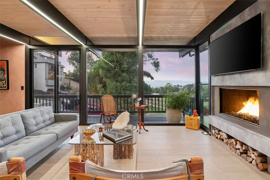 The living space is centered around a dramatic gas fireplace and seamlessly connects to both front and rear outdoor areas. A Teak wood entertainer’s deck spans the back of the home, featuring a Viking outdoor kitchen, built-in spa, and tranquil custom waterfall, all framed by a towering wall of timber bamboo for added privacy.