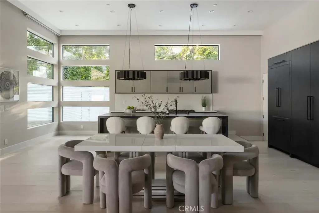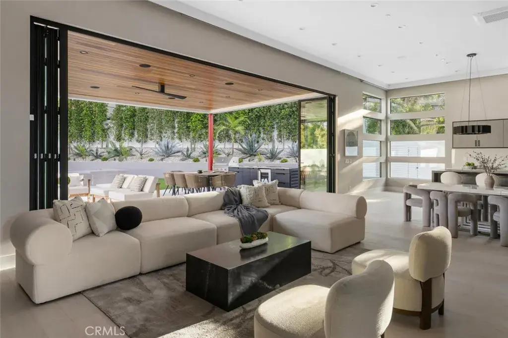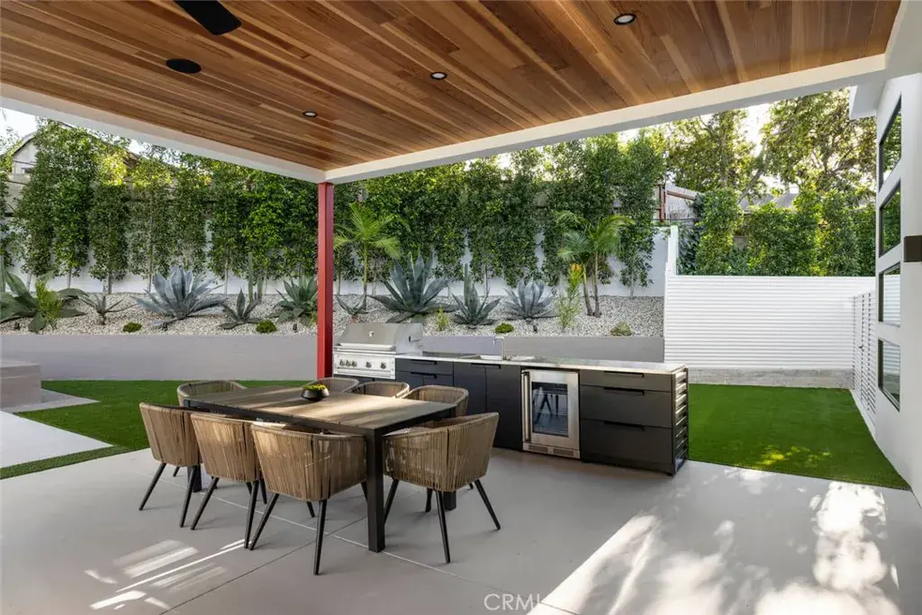 Soaring 13-foot ceilings throughout the home create an airy, expansive atmosphere throughout, while the seamless indoor-outdoor design blurs the line between interior comfort and alfresco living. The custom kitchen features built-in appliances and flows effortlessly into the entertaining spaces, making it ideal for hosting.