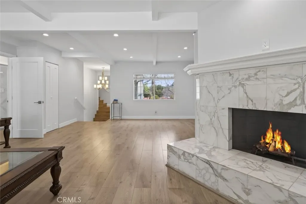 Inside a stunning living room features beamed ceilings recessed lighting a cozy fireplace and an abundance of natural light. The chefs kitchen is a true showstopper open concept elegantly designed and fully equipped with high end finishes and premium appliances perfect for entertaining and everyday living.