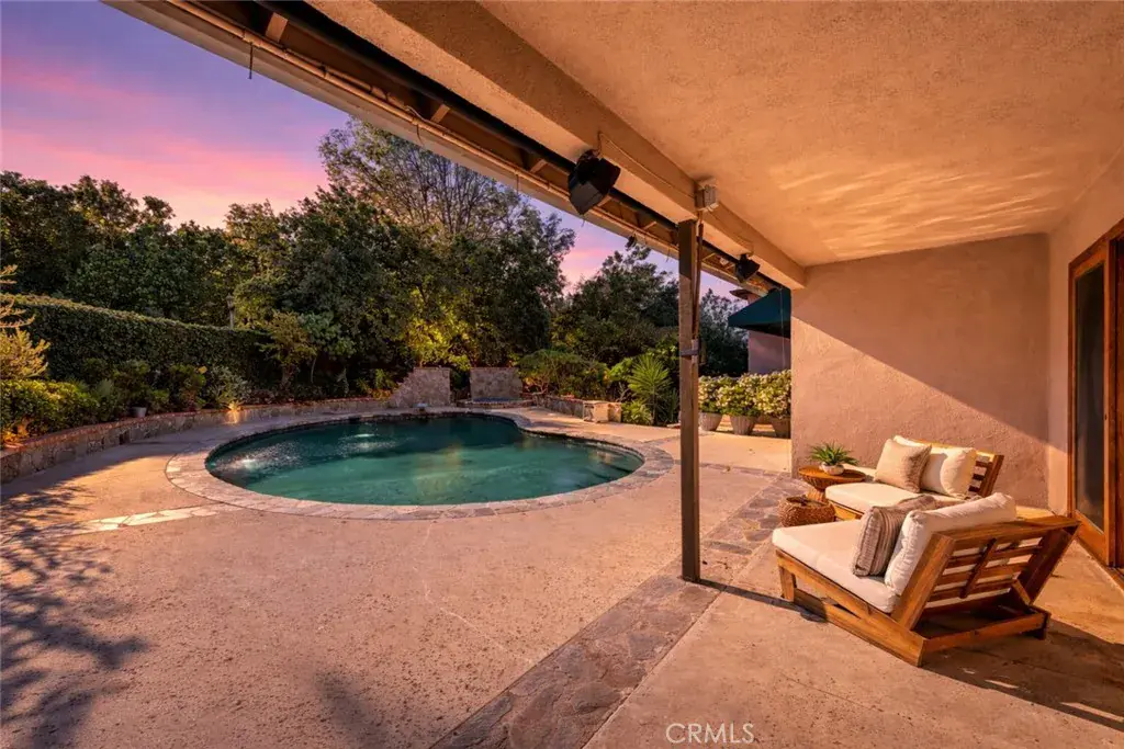 Stunning multi-level retreat nestled in the hills, offering privacy, lush surroundings, and a seamless indoor-outdoor lifestyle. Enter through the double-door entry into a thoughtfully designed home where natural light flows throughout the main living spaces. The layout is ideal for both everyday living and entertaining, with the kitchen and living room located on the main entry level, while bedrooms and additional living areas are intelligently separated across multiple levels for added privacy and flexibility. The home has been extensively maintained and improved, featuring a recently replaced roof, upgraded electrical systems, a tankless water heater, serviced HVAC, new stucco, and completed attic insulation. The backyard is a true sanctuary, highlighted by a private PebbleTec pool and spa with separate heating systems, updated pool equipment, and beautifully landscaped grounds with mature fruit trees, including lemon, orange, grapefruit, fig, and lime. Additional features include a bar/den and a dedicated large theater screening room, complete with a professional, motorized Stewart Filmscreen, indoor laundry, direct-access garage with smart opener, exterior lighting, covered patio areas, outdoor speakers with Bluetooth connectivity, and remote-controlled shades. This special property blends comfort, function, and timeless character in a serene hillside setting—a rare opportunity not to be missed.