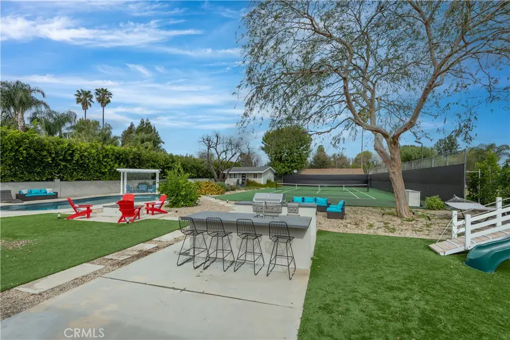 Mature landscaping surrounds a PebbleTec pool with waterfall feature, a charming putting green, multiple outdoor lounge areas, fire pit gathering space, and a fully equipped outdoor kitchen with BBQ, prep sink, and refrigeration. A professional-size tennis court enhances the estate’s lifestyle appeal, creating a true at-home retreat.