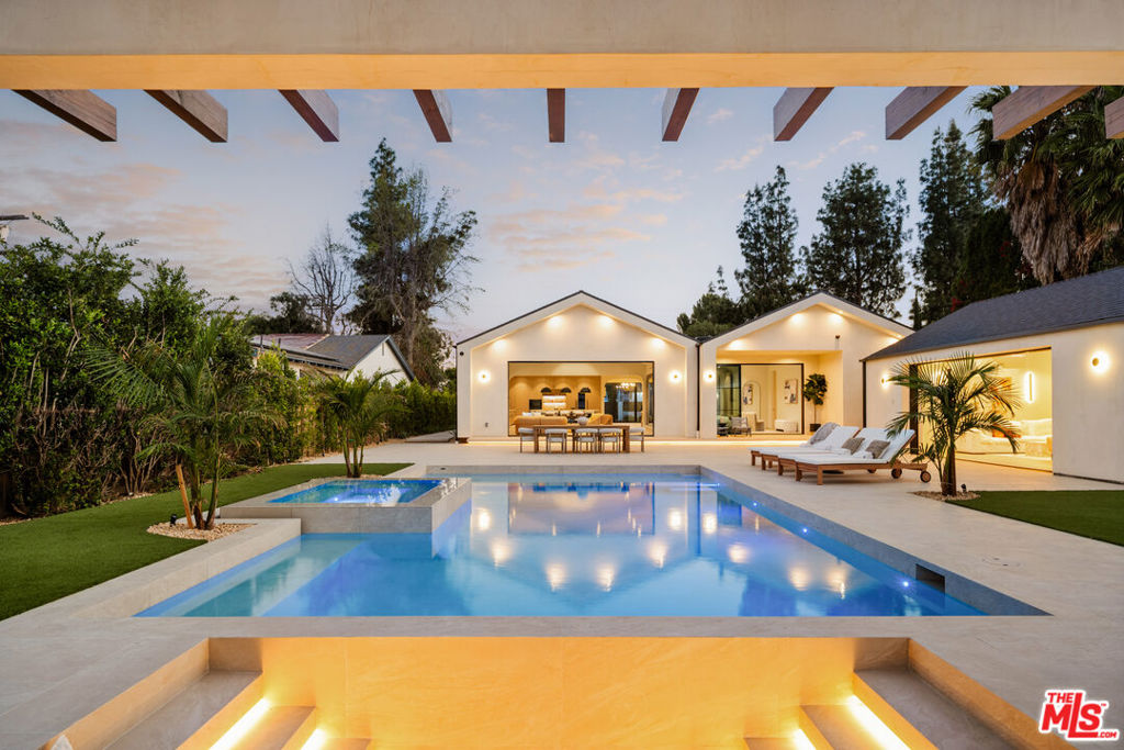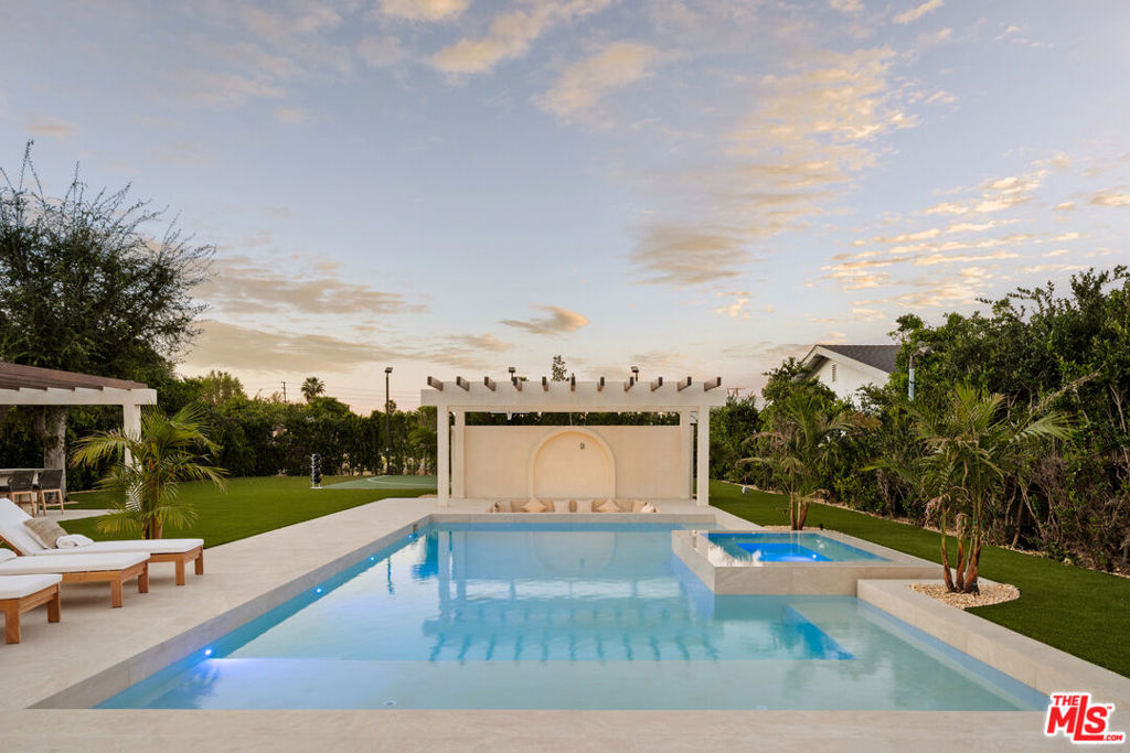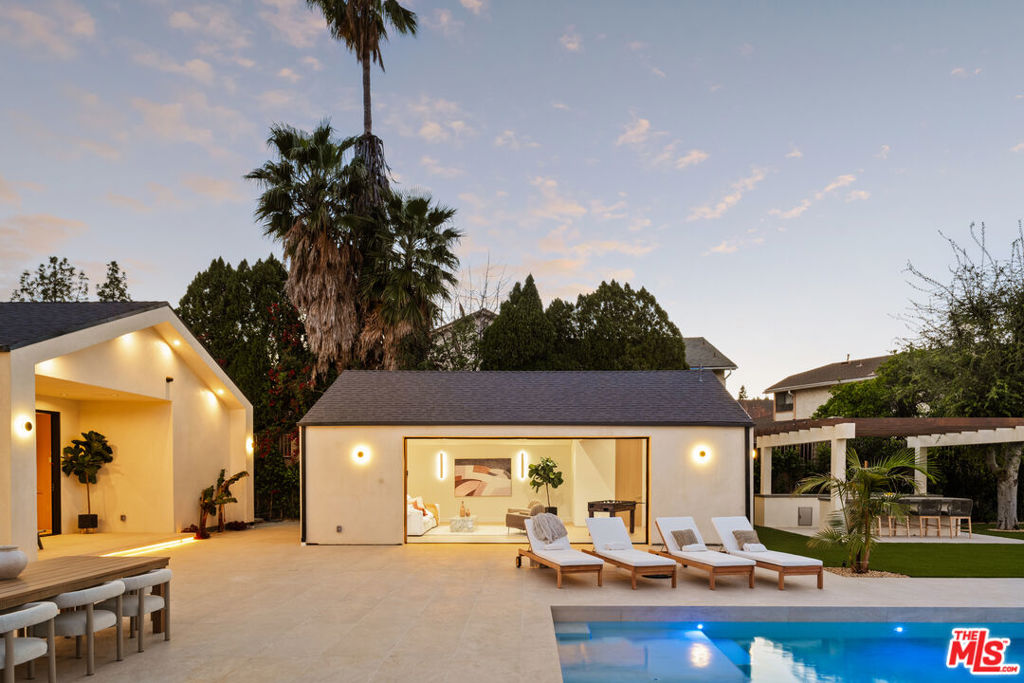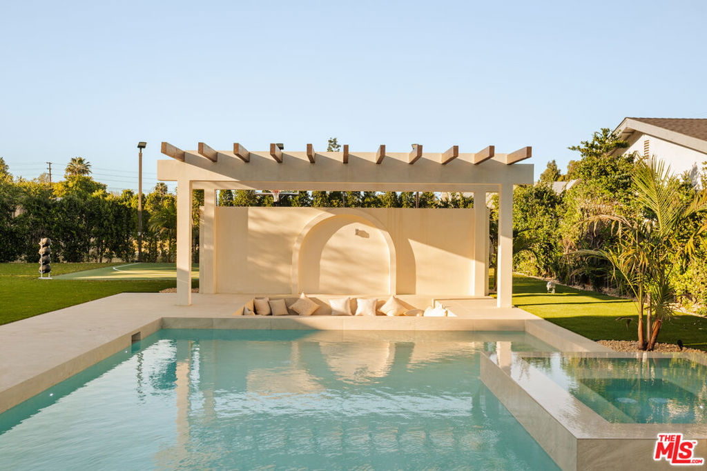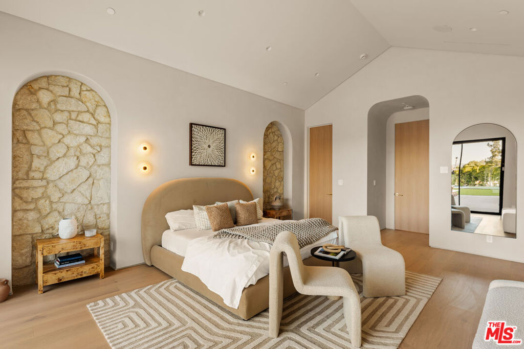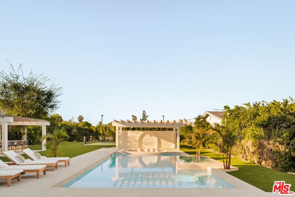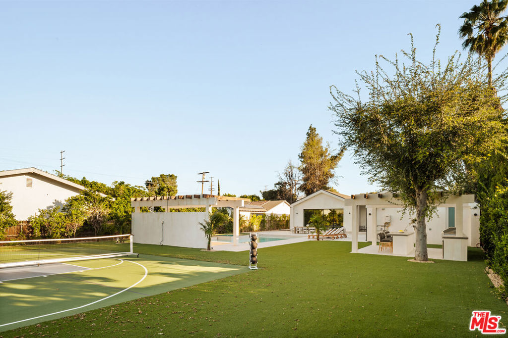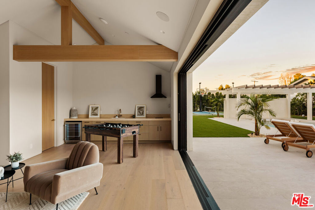 Elevated single-level resort-style residence blending warm natural textures with refined modern design. A soft neutral palette, custom millwork, arched architectural details, stone finishes, and wide-plank wood flooring create a cohesive, magazine-worthy aesthetic throughout. Vaulted ceilings with exposed beams and walls of glass fill the open-concept layout with natural light while creating seamless indoor-outdoor flow.The designer kitchen serves as the heart of the home, anchored by an oversized island with seating, integrated cabinetry, sculptural pendant lighting, and a dramatic stovetop feature wall wrapped in custom stone with a sleek vent hood delivering both striking design and everyday functionality.The approximately 4,000 sq. ft. residence offers four bedrooms and four-and-a-half bathrooms, including a luxurious primary suite designed as a private retreat. The spa-inspired bath features natural stone finishes, refined fixtures, soft ambient lighting, and dual walk-in closets. Secondary bedrooms and baths continue the home’s calm, elevated design aesthetic.Set on an approximately 18,000 sq. ft. lot, the backyard unfolds as a private resort-style oasis featuring a sparkling pool and spa with Baja shelf, a sunken fire pit lounge, expansive entertaining patios, and a private sport court. A detached guest house with a private bathroom offers ideal flexibility for guests, a home office, or creative studio.A rare single-level offering that seamlessly combines modern architecture, comfort, and resort-style living.