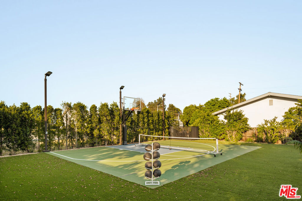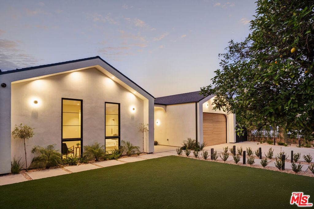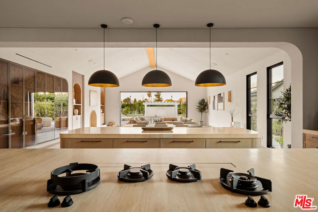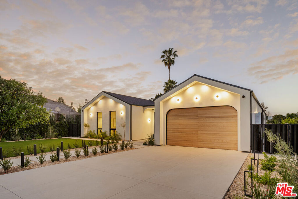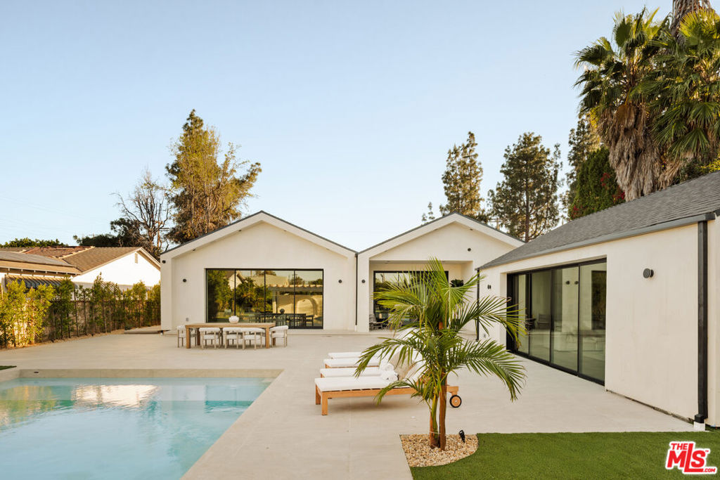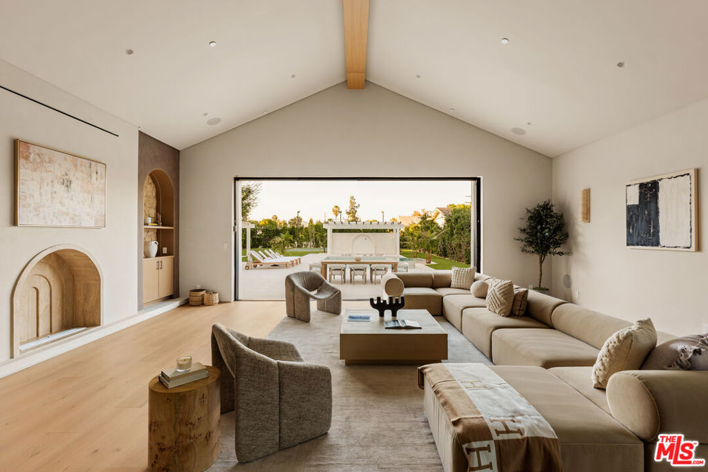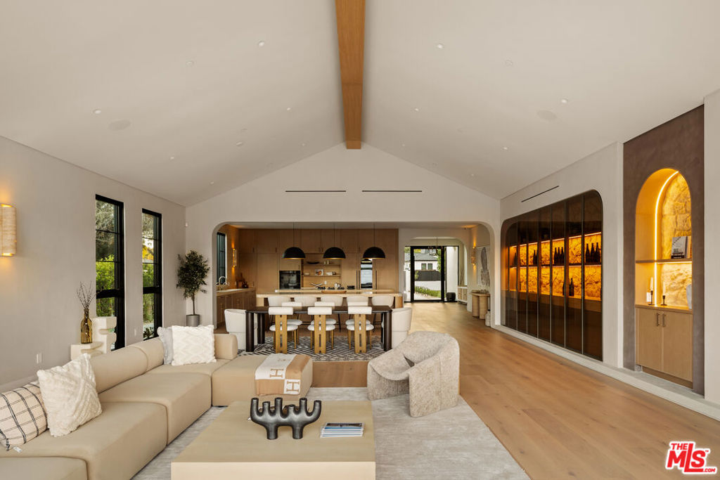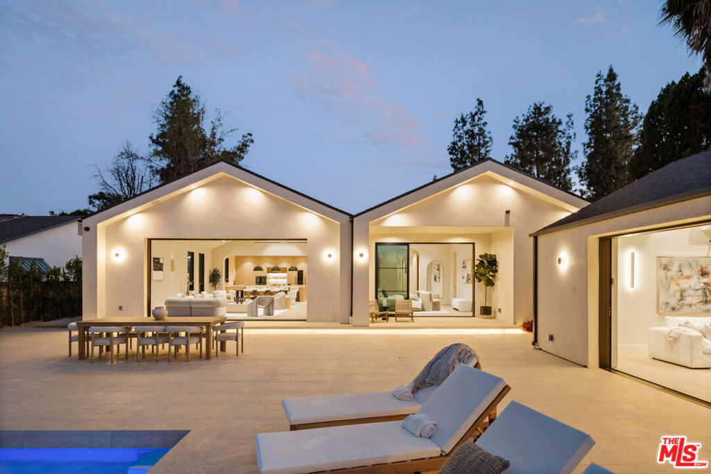 Elevated single-level resort-style residence blending warm natural textures with refined modern design. A soft neutral palette, custom millwork, arched architectural details, stone finishes, and wide-plank wood flooring create a cohesive, magazine-worthy aesthetic throughout. Vaulted ceilings with exposed beams and walls of glass fill the open-concept layout with natural light while creating seamless indoor-outdoor flow.The designer kitchen serves as the heart of the home, anchored by an oversized island with seating, integrated cabinetry, sculptural pendant lighting, and a dramatic stovetop feature wall wrapped in custom stone with a sleek vent hood delivering both striking design and everyday functionality.The approximately 4,000 sq. ft. residence offers four bedrooms and four-and-a-half bathrooms, including a luxurious primary suite designed as a private retreat. The spa-inspired bath features natural stone finishes, refined fixtures, soft ambient lighting, and dual walk-in closets. Secondary bedrooms and baths continue the home’s calm, elevated design aesthetic.Set on an approximately 18,000 sq. ft. lot, the backyard unfolds as a private resort-style oasis featuring a sparkling pool and spa with Baja shelf, a sunken fire pit lounge, expansive entertaining patios, and a private sport court. A detached guest house with a private bathroom offers ideal flexibility for guests, a home office, or creative studio.A rare single-level offering that seamlessly combines modern architecture, comfort, and resort-style living.