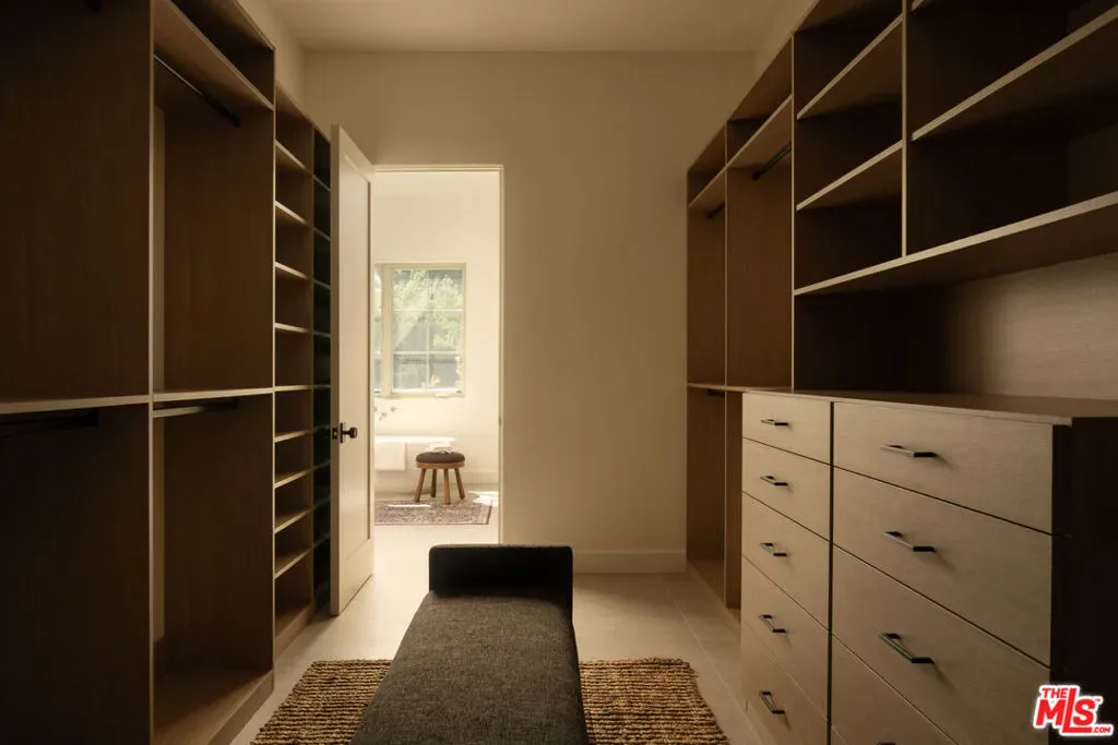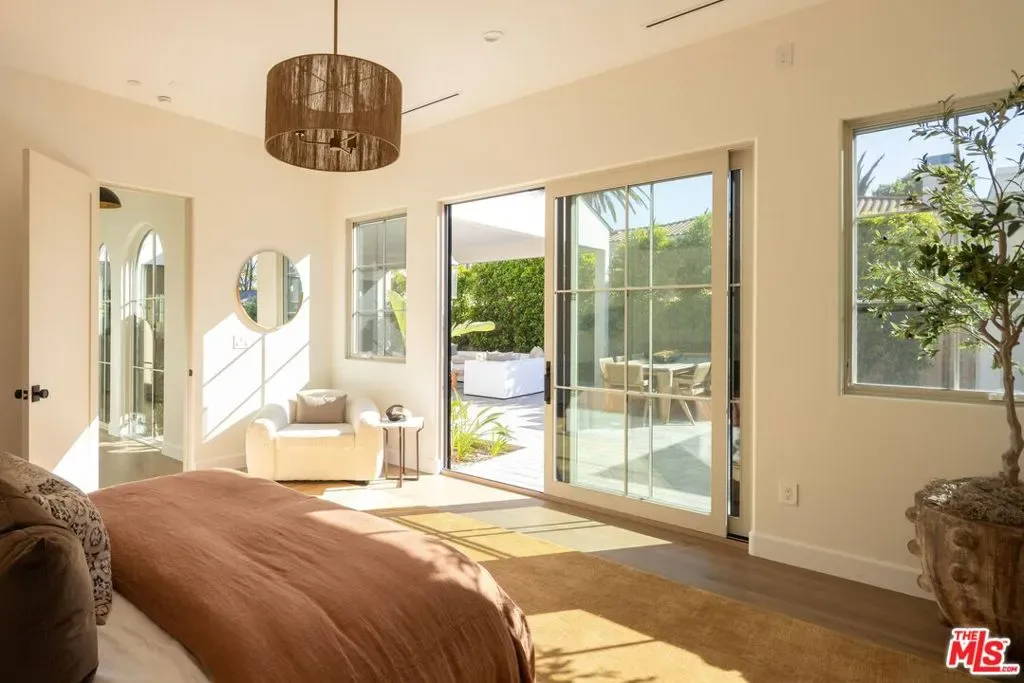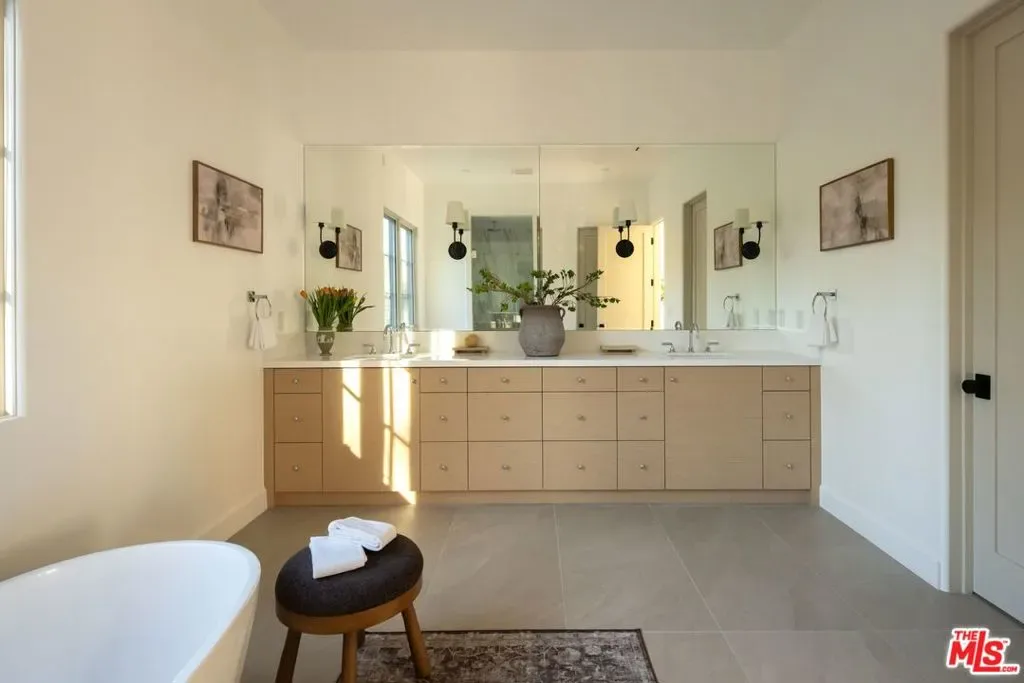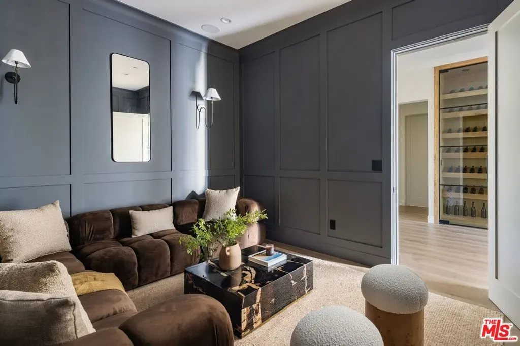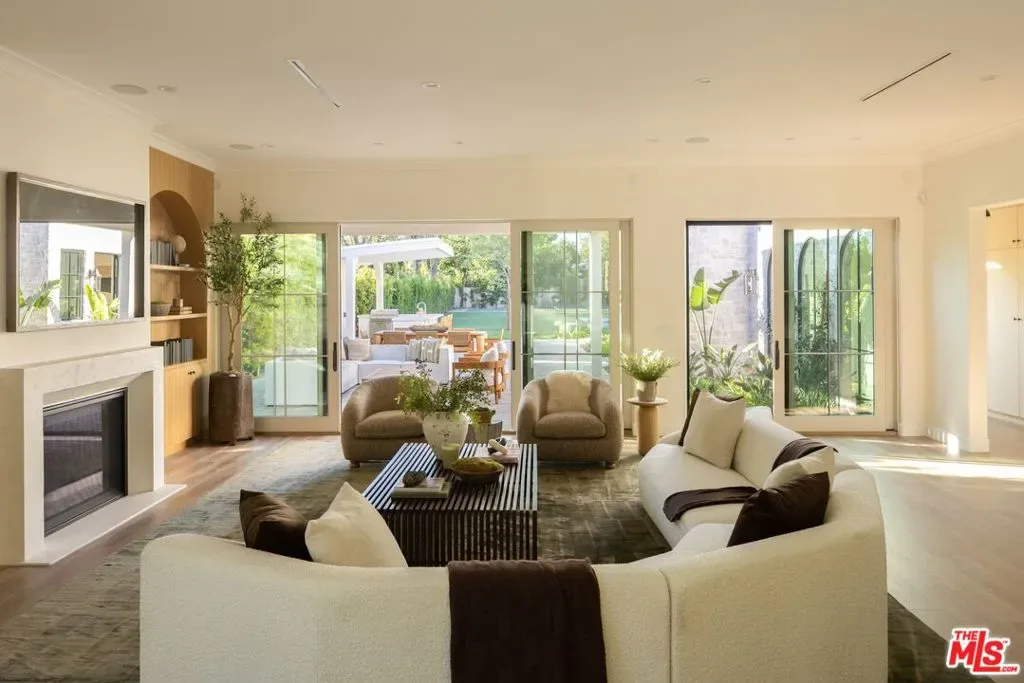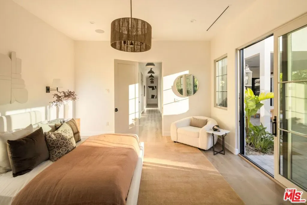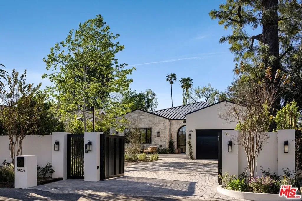 Welcome to this gated, 2025 single-story modern farmhouse compound in Walnut Acres Estates, newly finished with beautiful materials and set back from a tree-lined street with a pickleball court, an abundance of outdoor gathering space, and sparkling pool and spa. A sizable motor court is set amidst carefully placed drought-tolerant landscaping and cozy sitting areas under shade trees. Through a beautiful curved glass-paned front door, visitors discover high ceilings, warm woods, and organic hues throughout. The living room is centered by a stone fireplace flanked by thoughtfully designed built-in book cases that continue the home’s casual, artistic vibe. The kitchen is grand and elegant, with custom cabinetry, state-of-the-art appliances including a commercial-grade range with smartly designed hood plus pot filler, and oversized center island. The adjacent butler’s pantry perfectly connects to the formal dining room for catering and entertaining. Nearby is a glass-encased wine cellar and a plush theatre/screening room. In the owner’s wing, sliding glass opens to gardens and patios for effortless indoor-outdoor living. The primary bath is large, with a dual-sink vanity, soaking tub, and rainwater shower adjacent to the walk-in wardrobe with custom built-ins. Secondary bedrooms are also en-suite, and one is currently utilized as an office. Privacy hedges surround the backyard, with its variety of spaces to relax, recline, and converse, including a covered outdoor living room, al-fresco dining area, and barbecue with prep sink and bar ledge. Enjoy the shimmering waters of the pool and spa, roam and play on the grassy lawn, or challenge friends to a game of pickleball or basketball on the sport court. Effectively new construction and never before lived in. Welcome to an ideal location close to parks, schools, houses of worship, and the 101 Freeway, just moments to the Calabasas Commons, Westfield Topanga and Village, and upcoming Rams Village at Warner Center. Top-rated Woodlake Avenue Elementary School.
