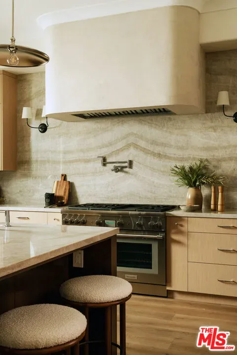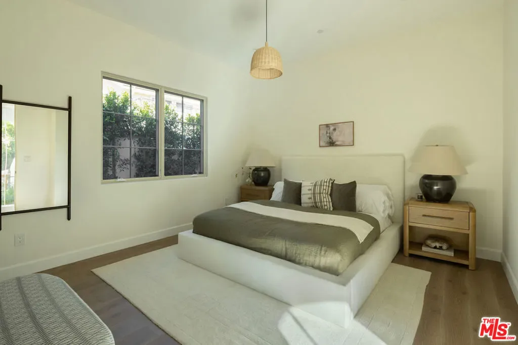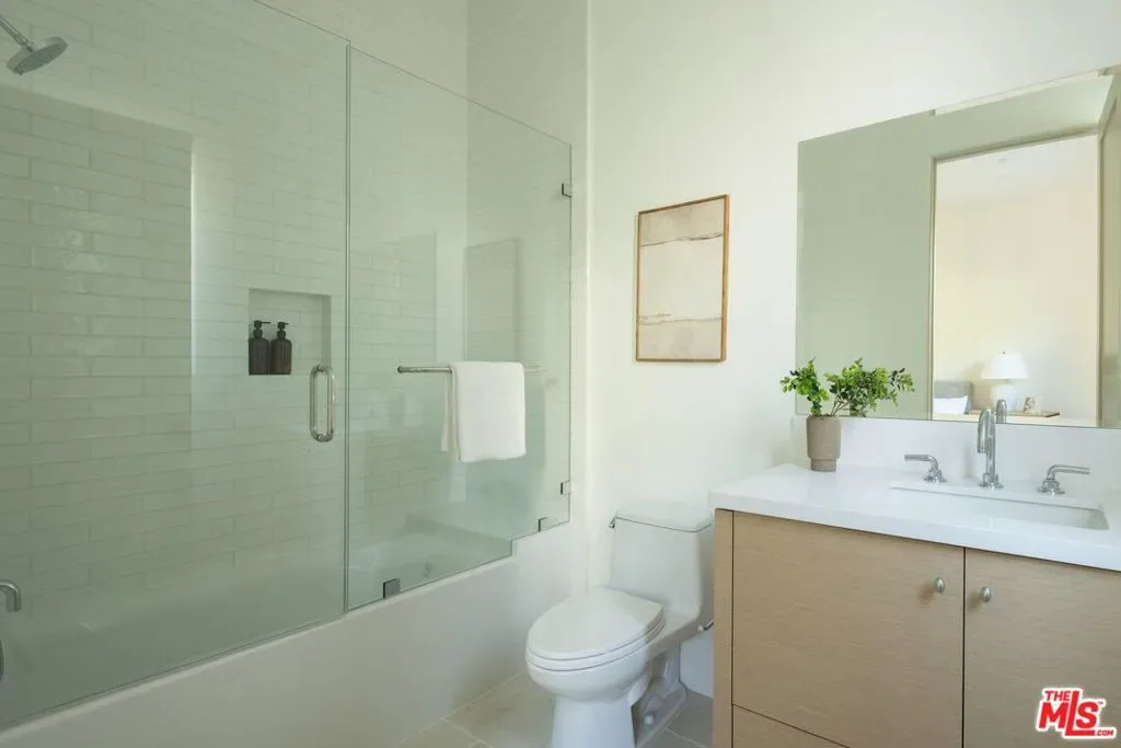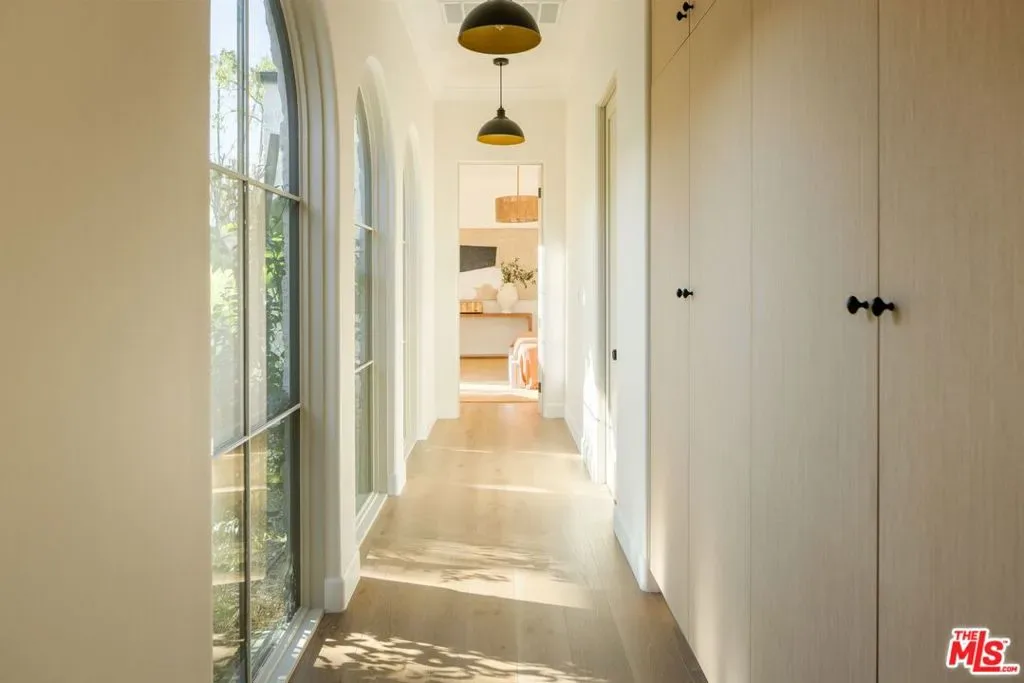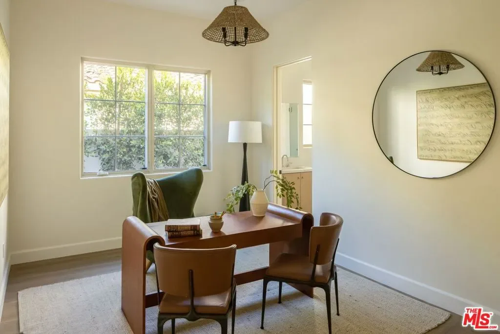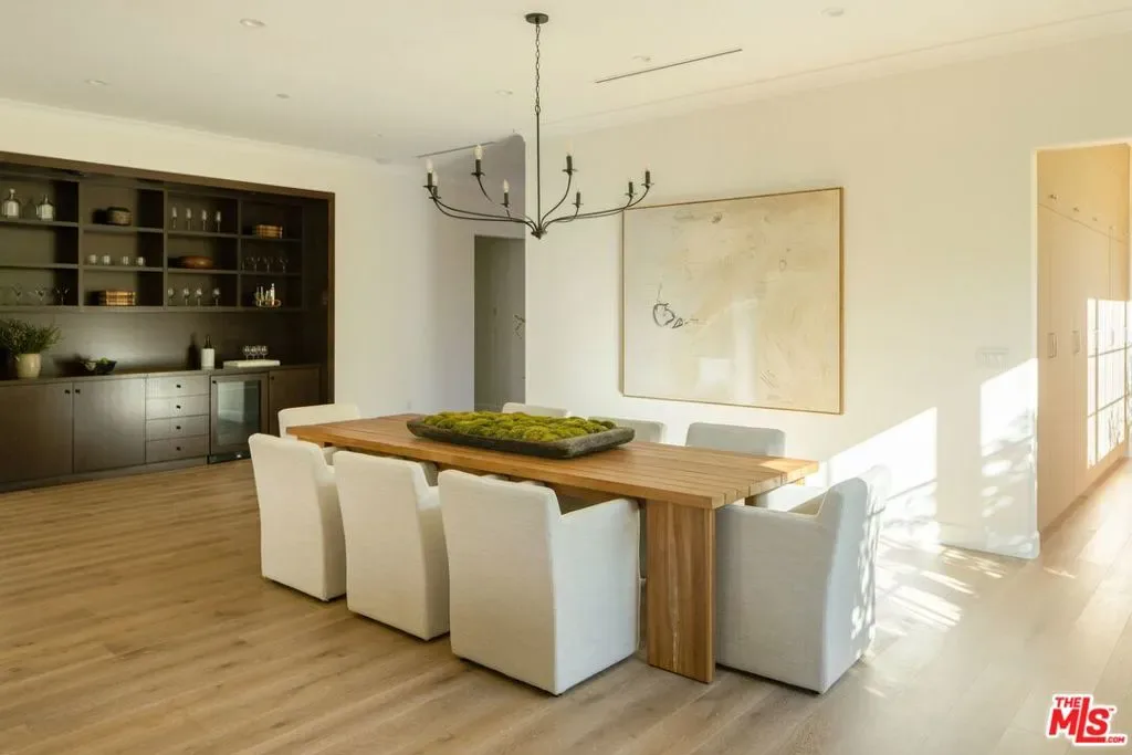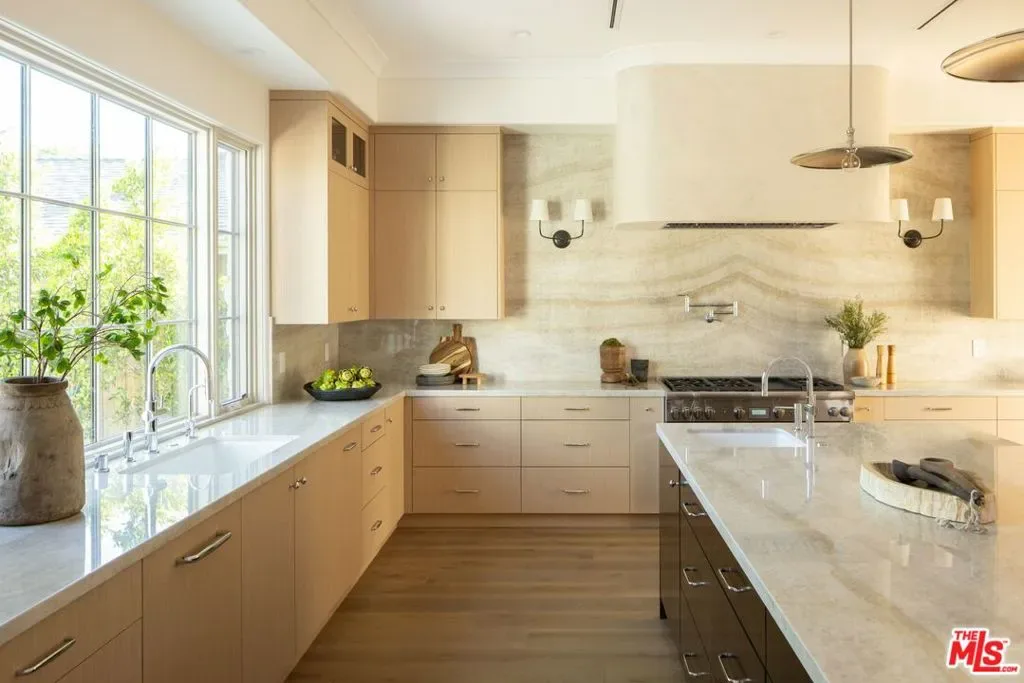 Welcome to this gated, 2025 single-story modern farmhouse compound in Walnut Acres Estates, newly finished with beautiful materials and set back from a tree-lined street with a pickleball court, an abundance of outdoor gathering space, and sparkling pool and spa. A sizable motor court is set amidst carefully placed drought-tolerant landscaping and cozy sitting areas under shade trees. Through a beautiful curved glass-paned front door, visitors discover high ceilings, warm woods, and organic hues throughout. The living room is centered by a stone fireplace flanked by thoughtfully designed built-in book cases that continue the home’s casual, artistic vibe. The kitchen is grand and elegant, with custom cabinetry, state-of-the-art appliances including a commercial-grade range with smartly designed hood plus pot filler, and oversized center island. The adjacent butler’s pantry perfectly connects to the formal dining room for catering and entertaining. Nearby is a glass-encased wine cellar and a plush theatre/screening room. In the owner’s wing, sliding glass opens to gardens and patios for effortless indoor-outdoor living. The primary bath is large, with a dual-sink vanity, soaking tub, and rainwater shower adjacent to the walk-in wardrobe with custom built-ins. Secondary bedrooms are also en-suite, and one is currently utilized as an office. Privacy hedges surround the backyard, with its variety of spaces to relax, recline, and converse, including a covered outdoor living room, al-fresco dining area, and barbecue with prep sink and bar ledge. Enjoy the shimmering waters of the pool and spa, roam and play on the grassy lawn, or challenge friends to a game of pickleball or basketball on the sport court. Effectively new construction and never before lived in. Welcome to an ideal location close to parks, schools, houses of worship, and the 101 Freeway, just moments to the Calabasas Commons, Westfield Topanga and Village, and upcoming Rams Village at Warner Center. Top-rated Woodlake Avenue Elementary School.
