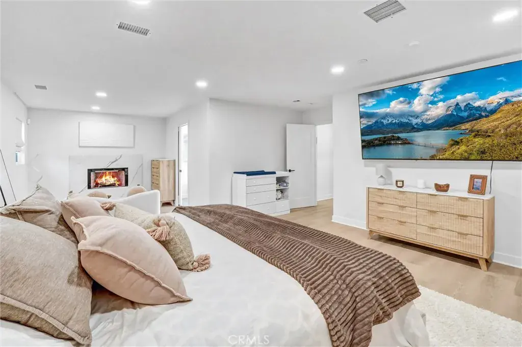 The primary suite is a true private retreat, complete with a walk-in closet, fireplace, and a spa-inspired en-suite bath with dual vanities, walk-in shower, and a separate soaking tub.