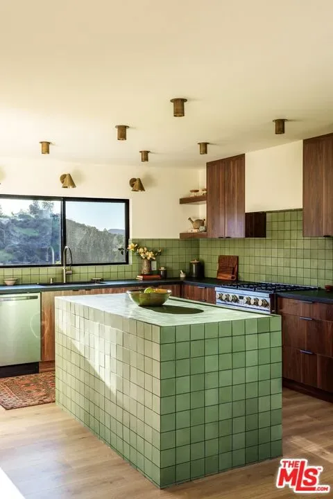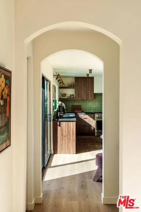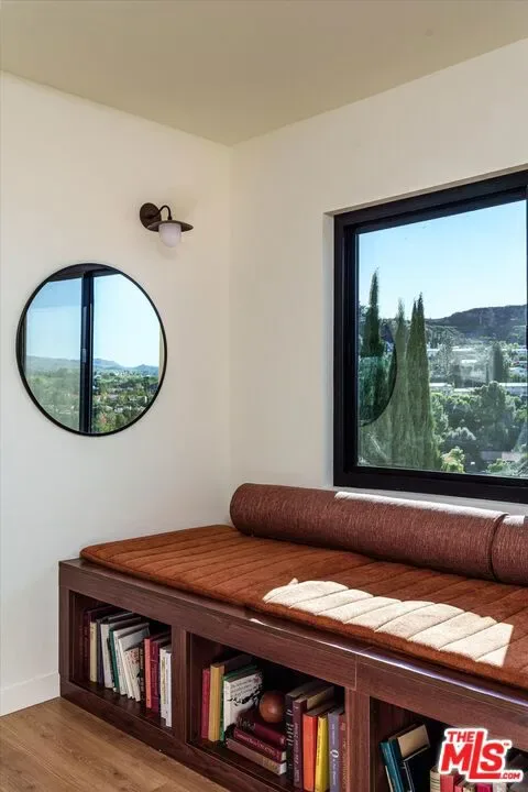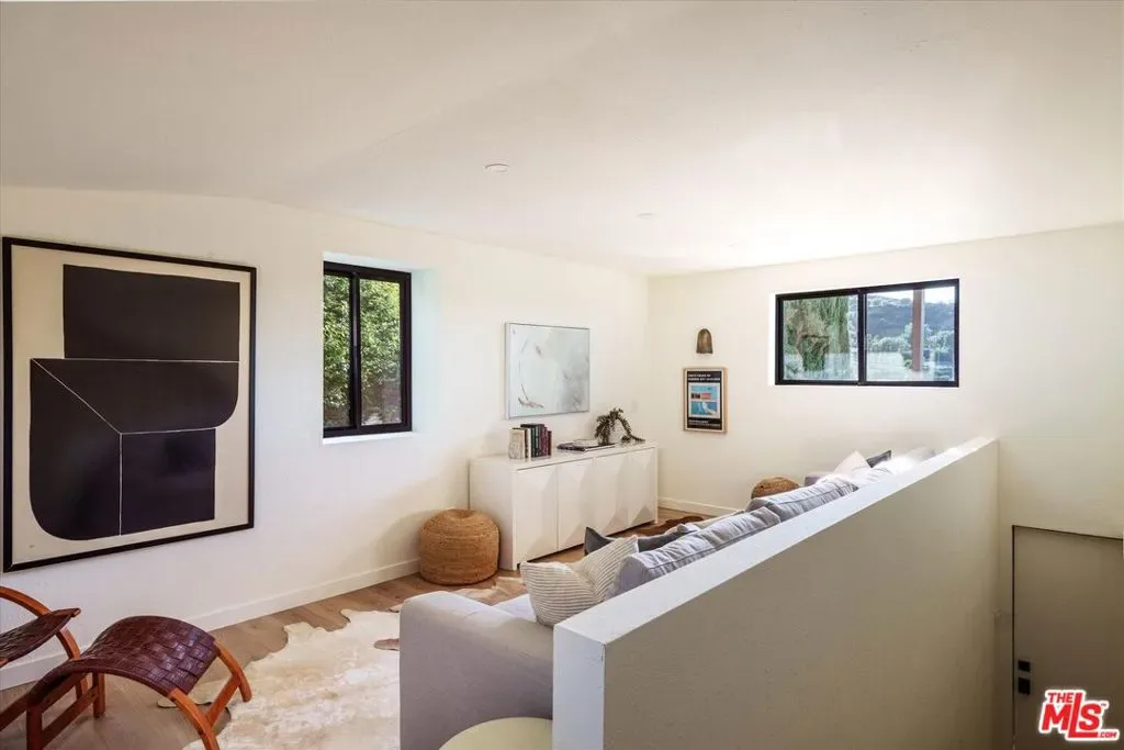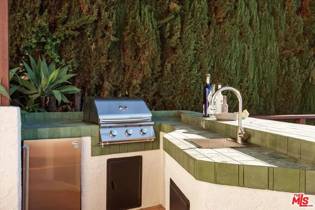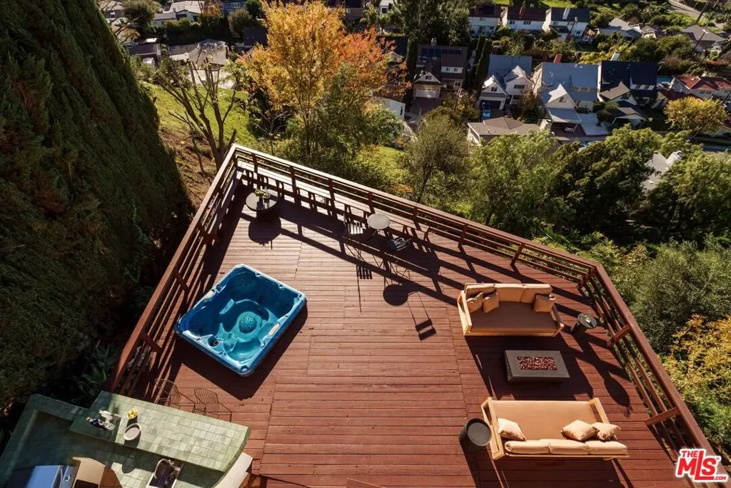 Beautiful spacious Spanish hills home with rolling countryside views and great natural light south of the Boulevard. Completely turn-key with greenery, large decks, built-in BBQ, spa, exceptional privacy, the designer reimagined home features stylish touches and high end finishes tucked away yet just a short drive to Ventura Blvd. New flooring, bespoke light fixtures and hardware, new Milgard windows and sliding glass doors, and an assortment of beautiful tiles adorn this one of a kind home. The kitchen has leathered granite countertops, walnut cabinetry, bronze hardware, leaf tile backsplash, brass light fixtures, all new appliances, accented by open shelving, breakfast nook and adjacent lounge area surrounded by mountain to hills views. On the other side of the home a classic Spanish step down living room lit by wall sconces and a tiled double sided wood burning fireplace. The second fireplace is in the formal dining room with a large sliding glass window with green and hillside views. Upstairs the large primary bedroom suite features its own balcony with mountain and tree views, walk-in closet, and an en suite bathroom clad in limestone, cement, and walnut. Three additional guest bedrooms upstairs and guest bathroom with double vanity, soaking tub, and unlacquered brass hardware are complemented by a built-in reading nook at the top of the staircase framed by a large window and skylight. Dining and lounging deck off of the kitchen, and an additional den space off the larger entertaining deck below with a built-in BBQ and hot tub all in complete privacy with 180 degree deep views of the surrounding green hillsides. Gardens areas below, and additional green spaces and gardens flank both sides of the house. Direct entry two car garage and just a short drive to markets, restaurants, coffee shops, hikes, and more at the bottom of the hill. A stunning Hollywood Hills home south of the boulevard in Woodland Hills.