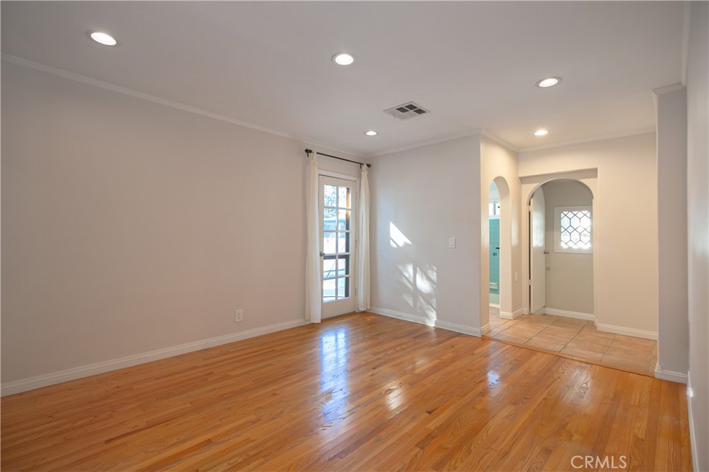 Arched wrought-iron gates welcome you into the private outdoors, evoking classic Spanish hacienda design and setting a warm, romantic tone. Classic white stucco, a red tile roof, and graceful arched details which create inviting curb appeal, while mature trees provide shade, privacy, and a sense of established charm. Inside, the home showcases warm hardwood flooring, abundant natural light, and a functional layout designed for both relaxed living and entertaining.