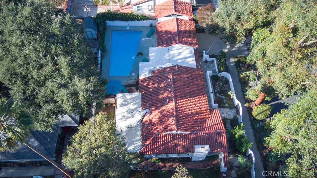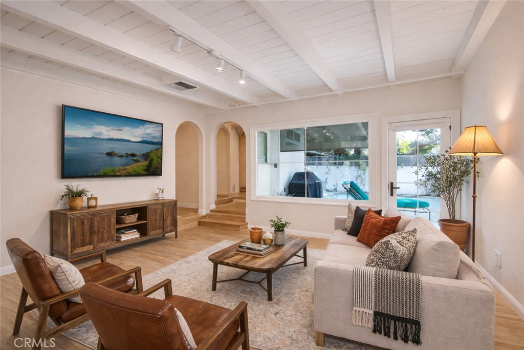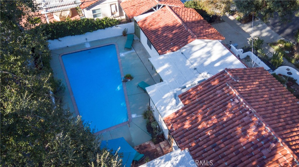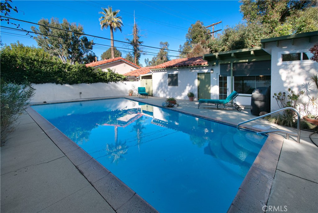 The backyard captures the essence of California indoor-outdoor living with a sparkling pool, patio areas, and a private courtyard atmosphere perfect for entertaining, lounging, or enjoying warm Woodland Hills evenings.