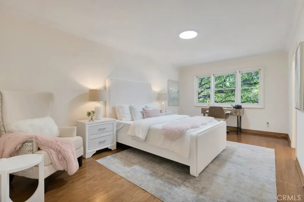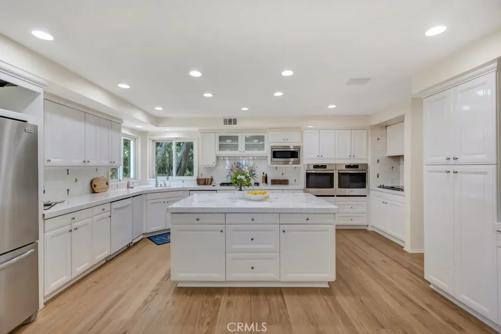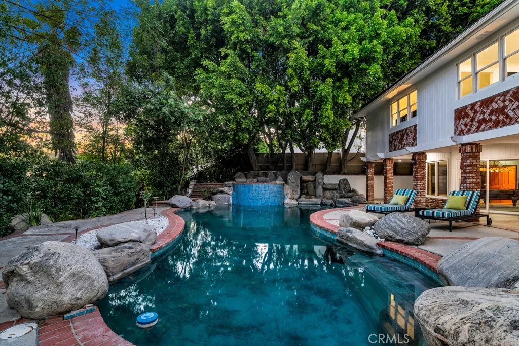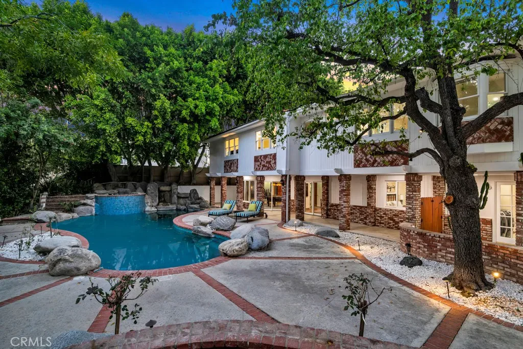 Nestled South of Ventura Boulevard on one of Woodland Hills’ most coveted cul-de-sac streets, this impressive 6-bedroom, 8-bathroom grand estate offers 5,334 sq ft of timeless character and versatile living on a sprawling 15,837 sq ft lot. A striking two-story facade with rich brick accents and illuminated bay windows sets the tone as you arrive, leading inside to a expansive living room adorned with exposed wood beam ceilings, gleaming hardwood floors, and elegant staircases. The oversized gourmet chef’s kitchen features a large center island sleigh countertops galore, stainless steel appliances, abundant white cabinetry, and a sunny breakfast nook. Entertain effortlessly in the spacious family room complete with a classic fireplace, wet bar, and French doors that open directly to the backyard, or challenge guests in the dramatic billiard room boasting soaring vaulted wood-plank ceilings and walls of windows framing the pool. A dedicated home office adds everyday functionality, while the luxurious primary suite is complemented by a spa-inspired bath showcasing polished black marble, a jetted soaking tub, and a serene bay window. Outside, your private resort awaits with epic daily sunsets, a stunning boulder-accented pool and spa, tranquil koi pond, romantic sitting areas, and lush mature landscaping create an idyllic SoCal retreat, all enclosed for total privacy. Completing the package is an attached 2-car garage, making this rare Woodland Hills family home an unmatched opportunity.