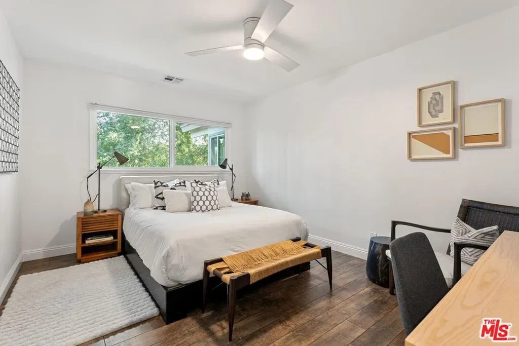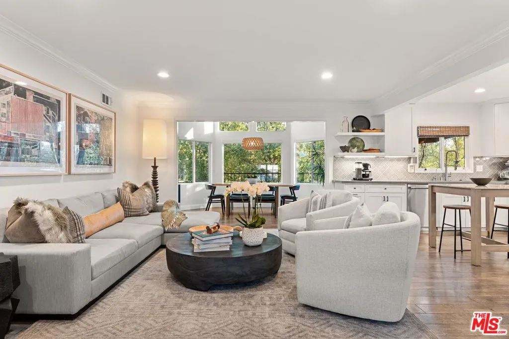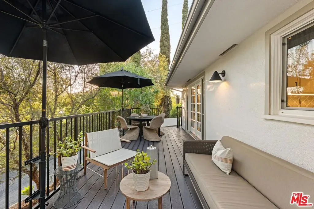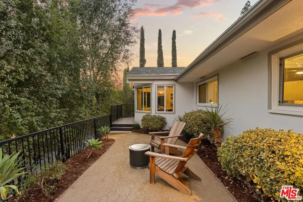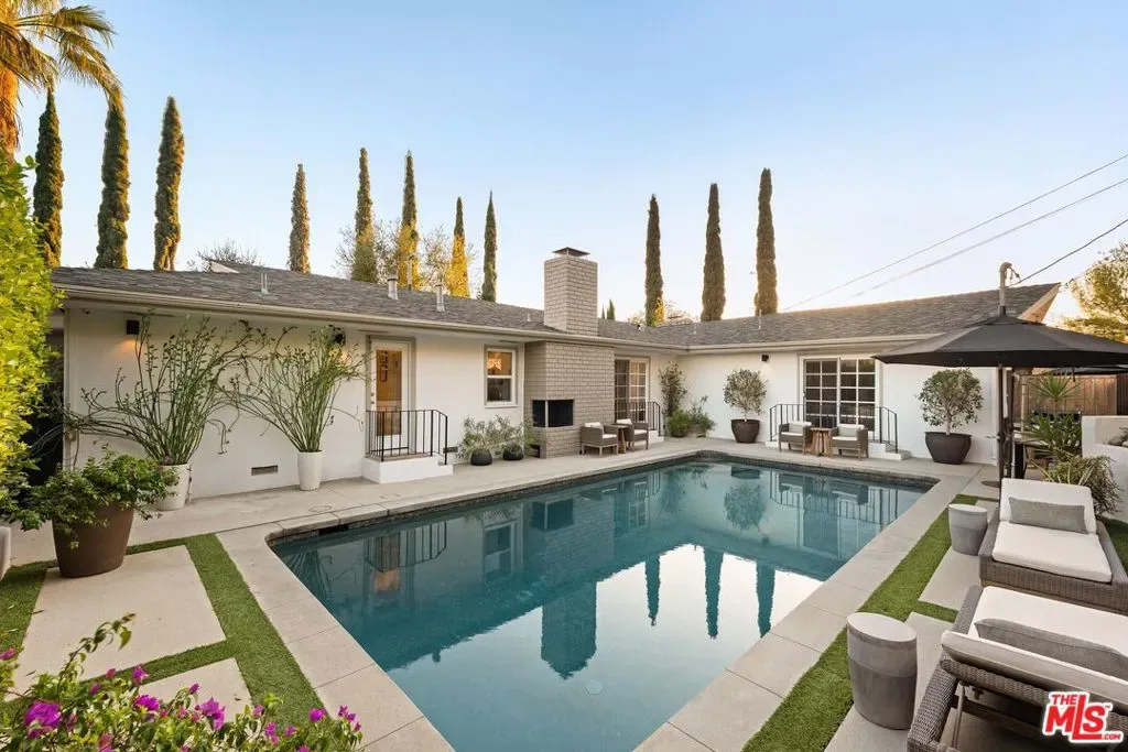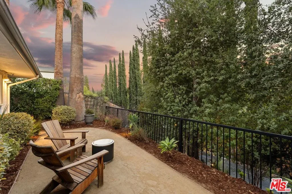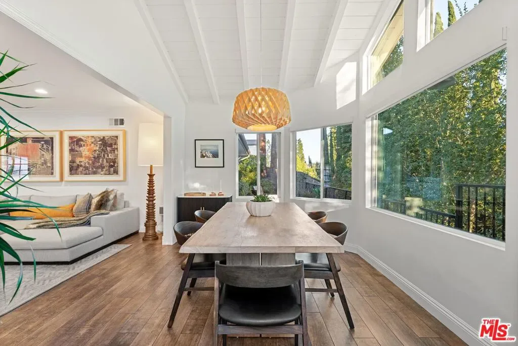 Step into this Woodland Hills sanctuary, a beautifully updated single-story home tucked away on a quiet street south of the boulevard. Set behind a private,180-foot gated driveway, this 3BD/2.5BA home blends comfort and style with treetop views, a resort-inspired pool, and effortless indoor-outdoor living. Inside, engineered hardwood floors and a stone-accented fireplace set a welcoming tone in the light-filled living room, where glass doors open to a view deck, perfect for morning coffee or sunset entertaining. A chic powder bath sits just off the entryway for guests. The open-concept kitchen features premium Thermador appliances, an island, and abundant cabinetry and counter space. The kitchen seamlessly connects to the family area, complete with its own gas fireplace, and to the formal dining room, where beamed ceilings and expansive windows frame the surrounding greenery. Offering a peaceful retreat, the spacious primary includes dual closets, a split A/C system, direct backyard access, and a luxurious ensuite bath with a dual vanity and step-in shower. Down the hall, two additional bedrooms share a beautifully appointed bath with generous counter space and shower-tub combo. Outdoor living shines here. Host unforgettable gatherings by the resort-style saltwater pool, equipped with brand new systems, or dining al fresco under the stars. Hillside vistas create a private oasis framed by lush landscaping. Ideally located near Wilbur Charter Elementary, scenic trails, and shops and restaurants along Ventura Boulevard, this home delivers the perfect blend of sophistication, seclusion, and everyday ease.