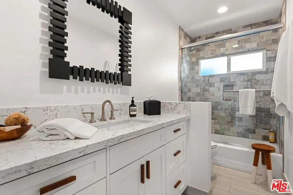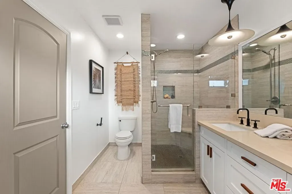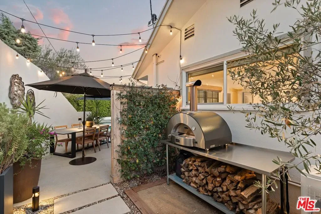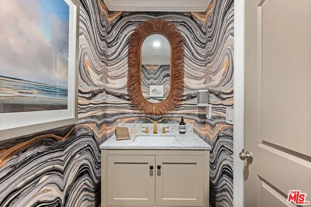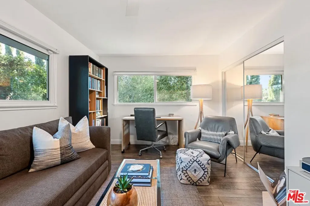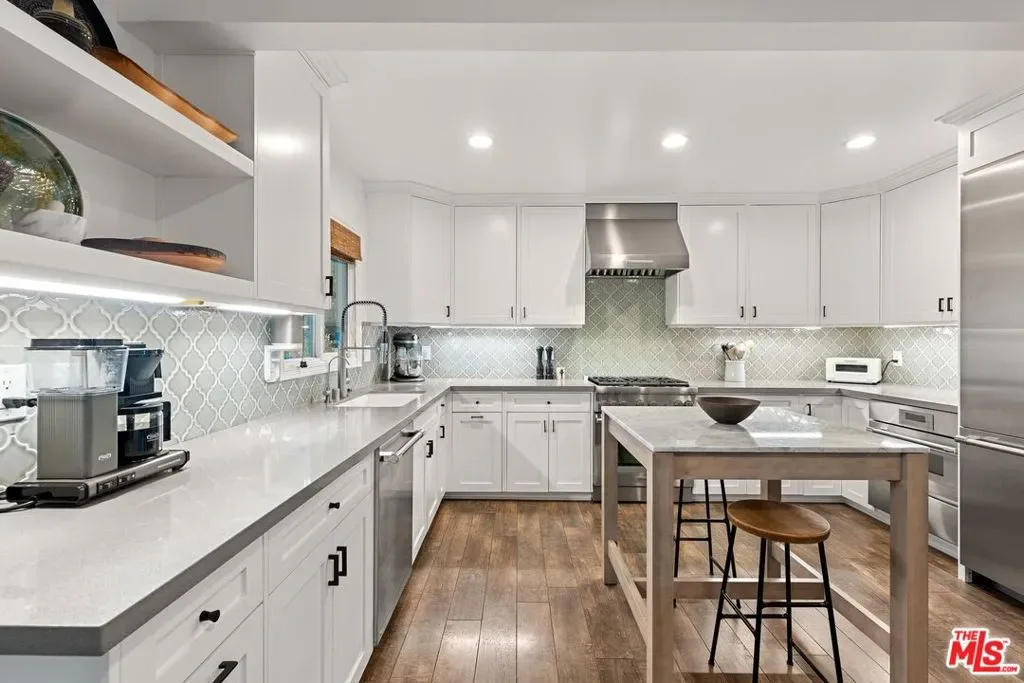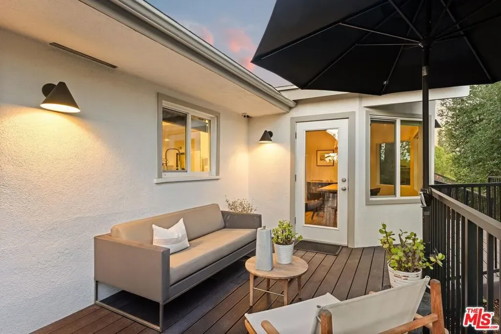 Step into this Woodland Hills sanctuary, a beautifully updated single-story home tucked away on a quiet street south of the boulevard. Set behind a private,180-foot gated driveway, this 3BD/2.5BA home blends comfort and style with treetop views, a resort-inspired pool, and effortless indoor-outdoor living. Inside, engineered hardwood floors and a stone-accented fireplace set a welcoming tone in the light-filled living room, where glass doors open to a view deck, perfect for morning coffee or sunset entertaining. A chic powder bath sits just off the entryway for guests. The open-concept kitchen features premium Thermador appliances, an island, and abundant cabinetry and counter space. The kitchen seamlessly connects to the family area, complete with its own gas fireplace, and to the formal dining room, where beamed ceilings and expansive windows frame the surrounding greenery. Offering a peaceful retreat, the spacious primary includes dual closets, a split A/C system, direct backyard access, and a luxurious ensuite bath with a dual vanity and step-in shower. Down the hall, two additional bedrooms share a beautifully appointed bath with generous counter space and shower-tub combo. Outdoor living shines here. Host unforgettable gatherings by the resort-style saltwater pool, equipped with brand new systems, or dining al fresco under the stars. Hillside vistas create a private oasis framed by lush landscaping. Ideally located near Wilbur Charter Elementary, scenic trails, and shops and restaurants along Ventura Boulevard, this home delivers the perfect blend of sophistication, seclusion, and everyday ease.