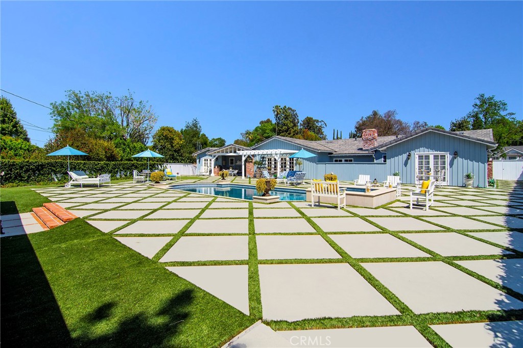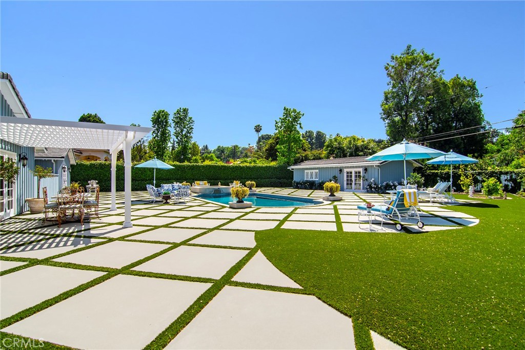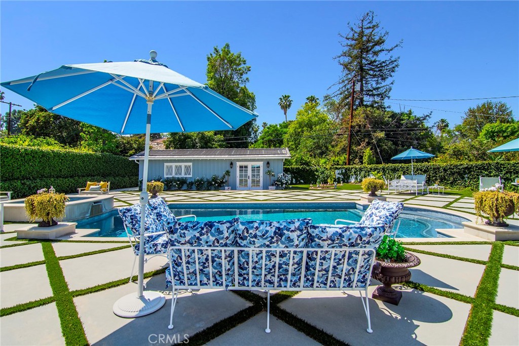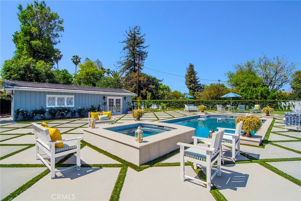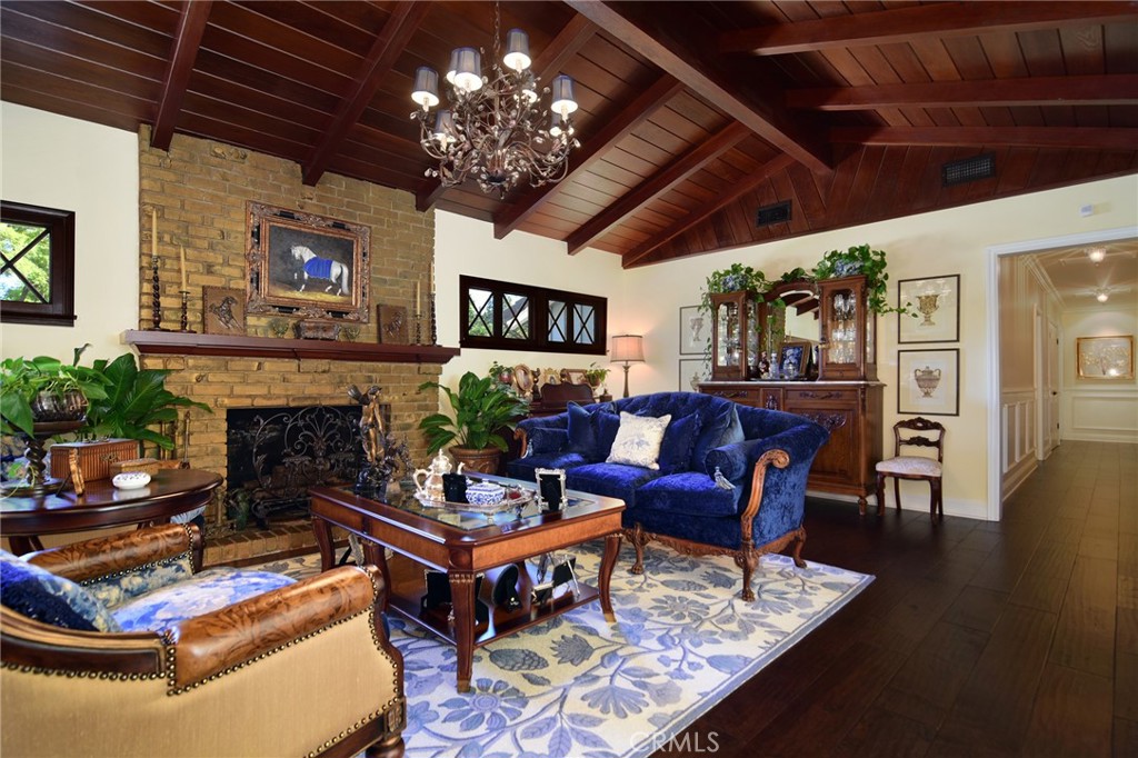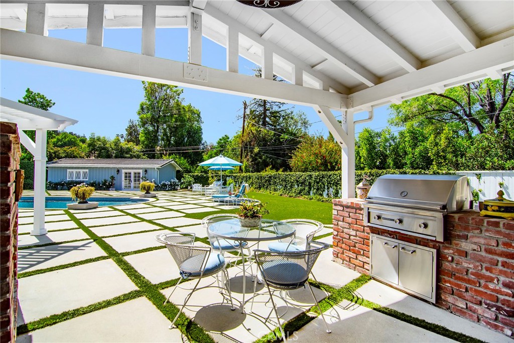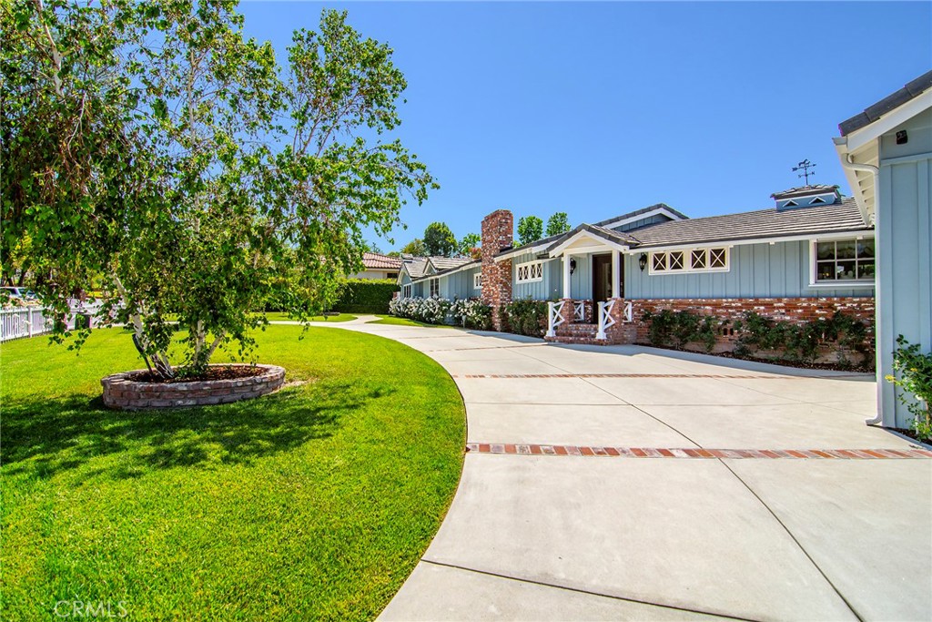Experience the dazzling restoration of this rustic style single-level ranch affording a classic “olde Hollywood” vibe. Situated on a flat nearly half-acre of sensational grounds featuring over 150 ft. of gated frontage adorned with roses, circular drive, brick accents, lush lawn & slate roof. Love at first sight is a quite the possibility here. An incredible over 600 sq. ft. guest house elevates it to another level. Both inside and out, the vision and style of its proud owners are prominently displayed. Gorgeous wood flooring blankets the interior. Living room with an inviting fireplace and the allure of original A-framed wood ceilings define this cherished space. A spectacular dream kitchen offering custom cabinetry, quality appliances and a massive center-island with exquisite Palomino granite adjoins a gorgeous butler’s pantry. Spacious & bright family room & formal dining benefit from a beautiful brick fireplace. Unique convertible den is a favored destination enhanced by a distinct curved fireplace. Your amazing primary-suite delivers a refined walk-in closet, French doors to the rear & an ultra-luxurious bath where white onyx walls & floors, soothing spa tub & a 6’ shower provide a true haven within. Two additional en-suites with stunning baths are sure to please. Outside, these glorious grounds truly rival that of a 5-star resort. Refreshing solar-heated pool and spa framed by the elegance of concrete decking with faux grass definition is just divine. An ideal covered dining and relaxation area offer a cozy fireplace & T.V. Bountiful fruit trees and a basement/storage room add to the appeal. Sought after charter schools too. So very special… this one should not be missed.