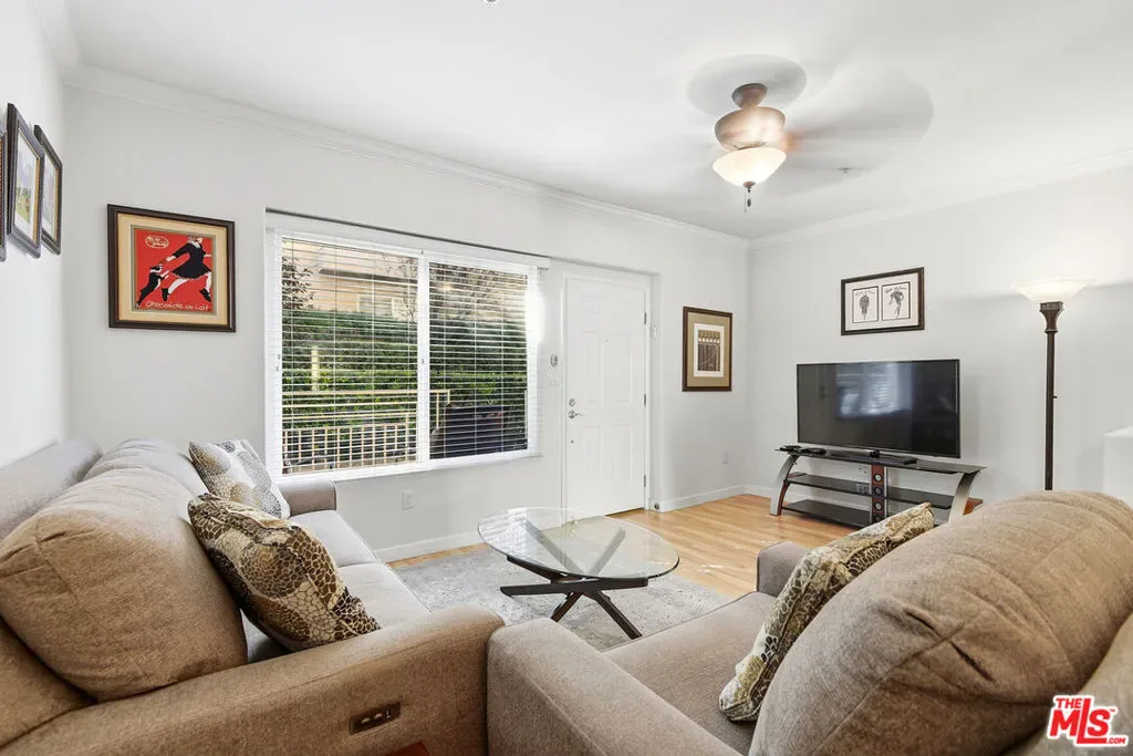 Welcome to this beautifully remodeled one-bedroom end-unit townhome nestled in the sought-after Bella Montagna community, where comfort meets resort-style living. Ideally located in the foothills just south of Ventura Boulevard, this serene and stylish home greets you with a private patio and a bright, open-concept living space designed for both relaxation and entertaining. The modern kitchen shines with quartz countertops, a designer tile backsplash, custom cabinetry, and stainless steel appliances, perfectly blending form and function. Throughout the home, light-filled interiors and sleek laminate flooring create a warm, contemporary feel. The spacious en-suite bedroom offers generous storage and features a charming Juliet balcony that invites in natural light and fresh air. Additional highlights include a direct-access one-car garage, extra storage, and a convenient downstairs laundry area with a side-by-side washer and dryer. Bella Montagna offers beautifully maintained grounds and an impressive array of amenities, including scenic walking trails, a basketball court, resort-style pool and spa, fitness center, BBQ areas, and a private theater room in the clubhouse. With gated entry, ample guest parking, and close proximity to shopping, dining, and freeway access, this home delivers the perfect balance of tranquility and convenience.