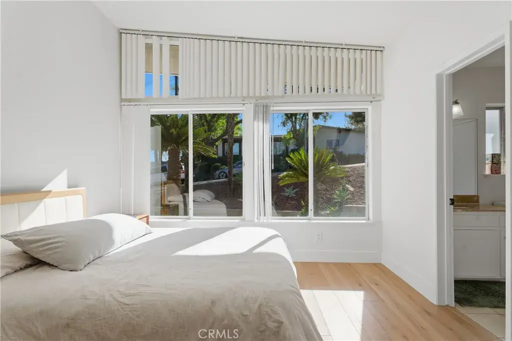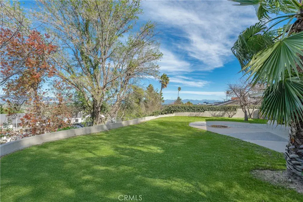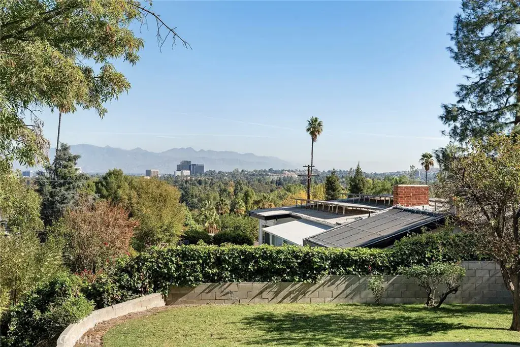 Remodeled mid-century modern Charles Du Bois single story VIEW home! Located West of Valley Circle on an approx. 12,000 SF rare expansive view lot that overlooks the Valley, mountains, and Warner Center! The single level property features wide frontage with mature palms and driveway that leads to a 2-car attached garage with direct access. Step inside to find a wide formal entry foyer with newly added guest powder bathroom and brand new wide plank oak wood floors found throughout. The entry opens to both the spacious living and dining rooms each featuring gorgeous wrapped wood beamed ceilings with skylights, double sided stone fireplaces, and large glass sliders that open to the backyard with dazzling mountain and city light views beyond, presenting the perfect backdrop for indoor/outdoor entertaining. The stunning completely remodeled open kitchen boasts large center island, soft close custom cabinetry with pantry space, gourmet Cafe appliances, wine fridge, and separate cozy breakfast nook with built-in bench seating with additional storage. The luxurious primary suite overlooks the Valley vistas and features high vaulted ceiling, wall-to-wall closet space, glass slider that opens to the yard, and private en-suite bathroom with dual sinks, walk-in shower, and separate bathtub. Two additional secondary bedrooms each have vaulted ceilings, large picture windows, good sized closets including a large walk-in, and share an en-suite bathroom with walk-in shower. The entertainer’s backyard features an expansive covered patio with fire pit, sprawling grass lawn, and Valley, mountain, and city light views with ample space for a pool if desired. Additional upgrades per seller: new roof (2023), new HVAC system (2024), upgraded electrical panel (2025), and new recessed lighting throughout. Adjacent to dining/shopping at the Westfield Mall/Village, The Calabasas Commons, Warner Center, & zoned for award-winning El Camino & Hale charter schools.
