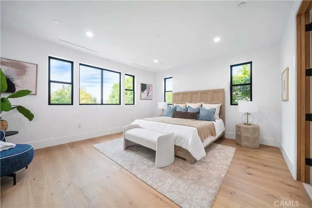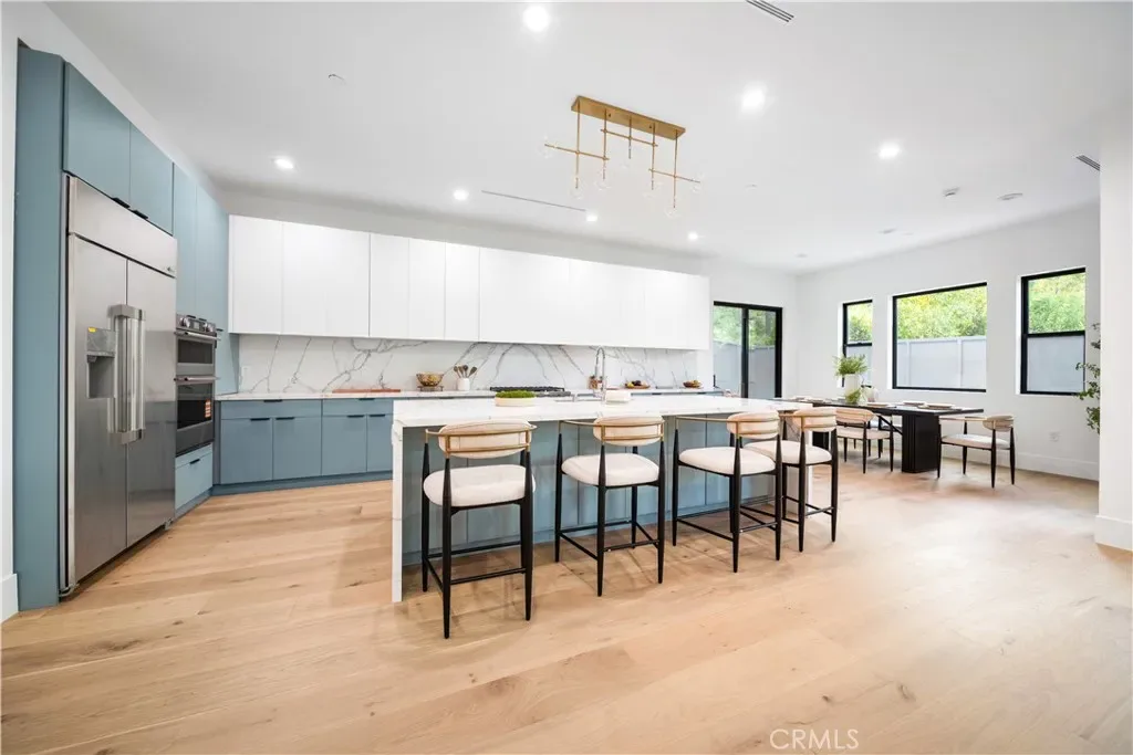 The main residence (5627 Oso Ave) features soaring ceilings and bright open-concept living spaces filled with natural light. Oversized black-framed windows and sliding glass doors frame hillside scenery and create a seamless indoor-outdoor experience. Wide-plank wood flooring, modern lines, and refined finishes create a warm yet sophisticated atmosphere.