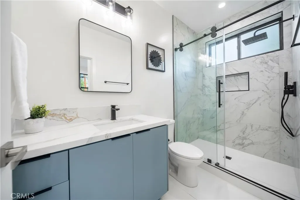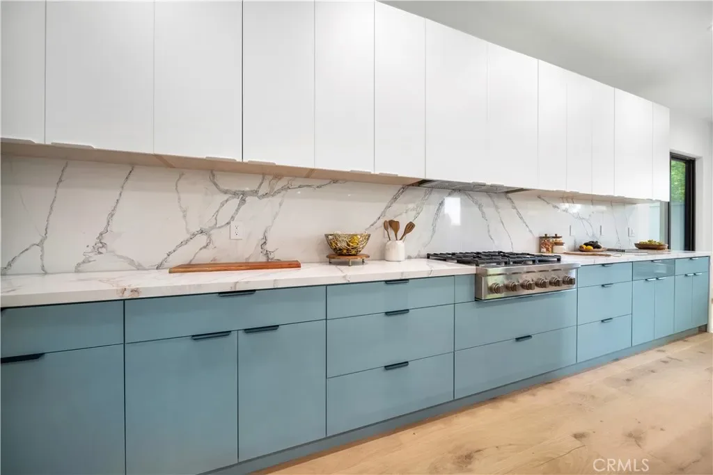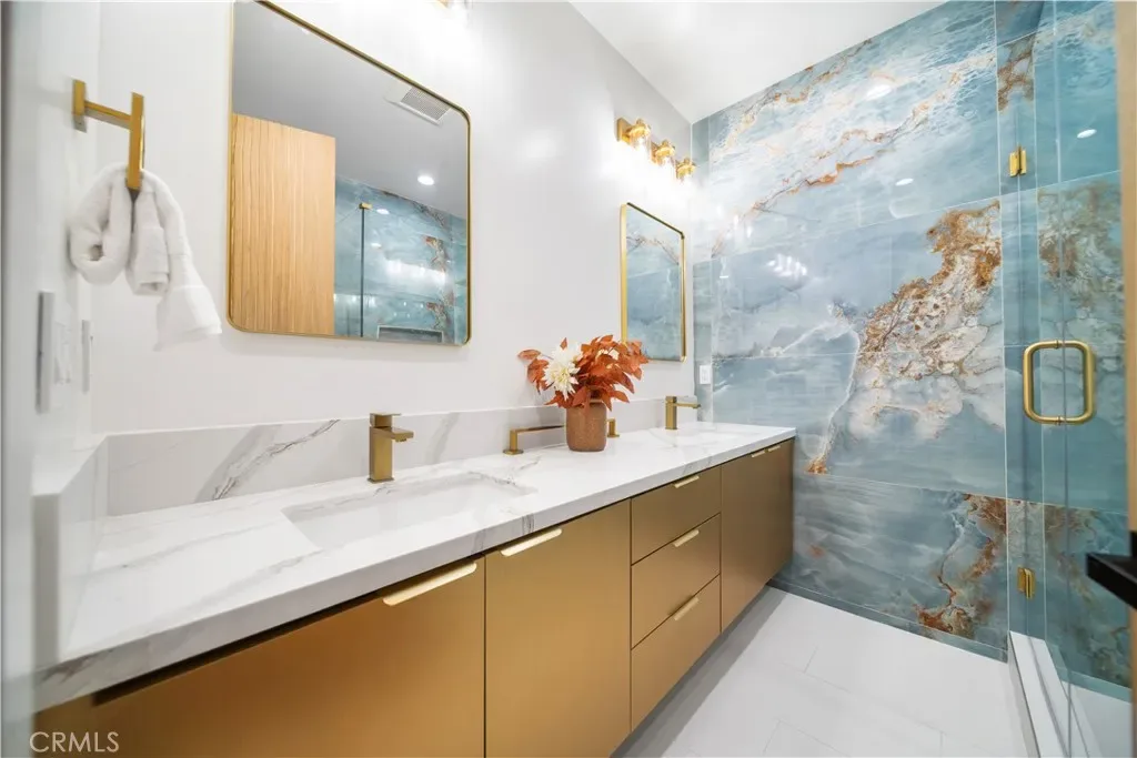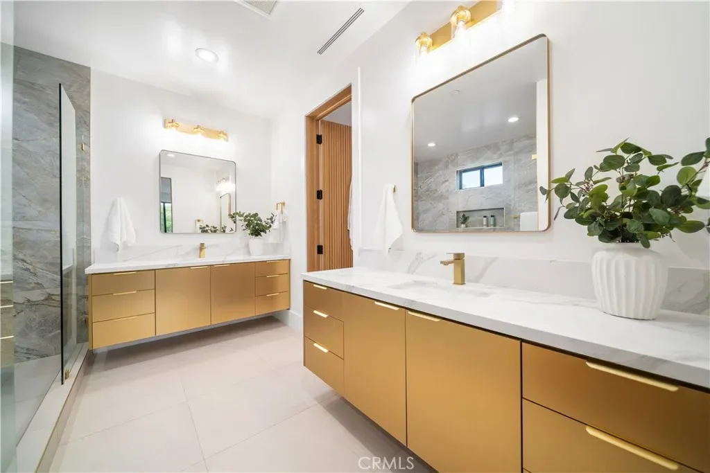 At the center of the home is a chef-inspired kitchen with custom cabinetry, quartz countertops, and a spacious island ideal for entertaining. Spa-like bathrooms feature marble slab tile, frameless glass showers, and designer fixtures. Generously sized bedrooms provide comfort and privacy, with select rooms opening to balconies or outdoor spaces overlooking the hills.