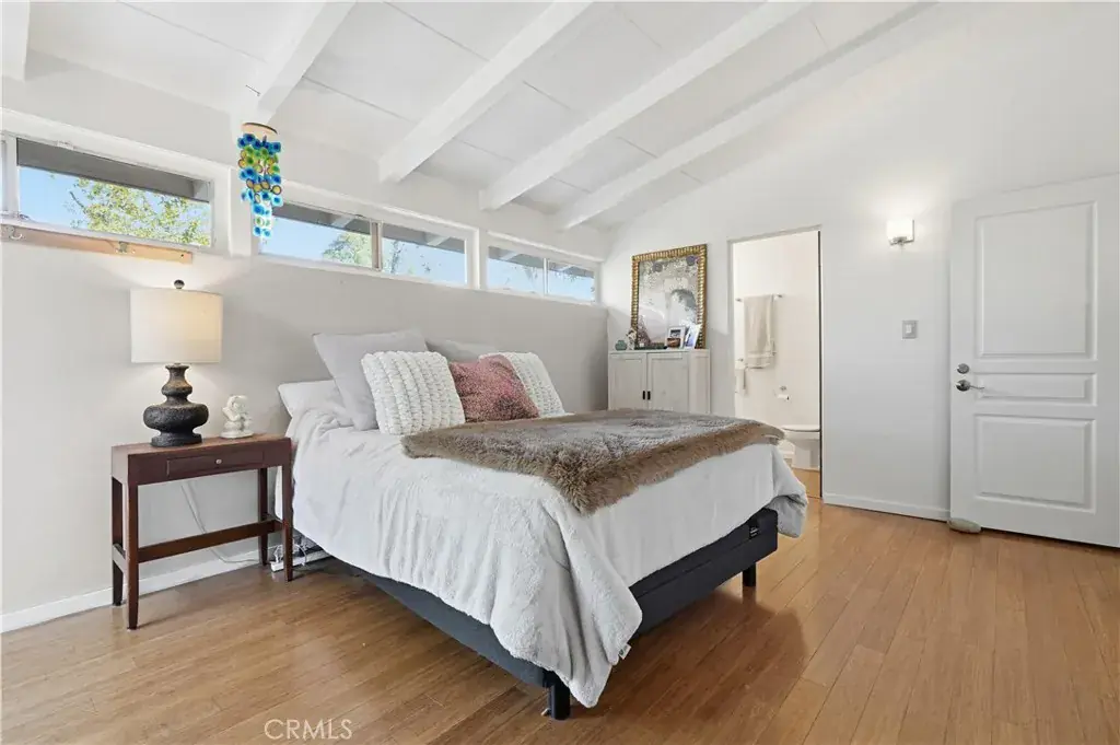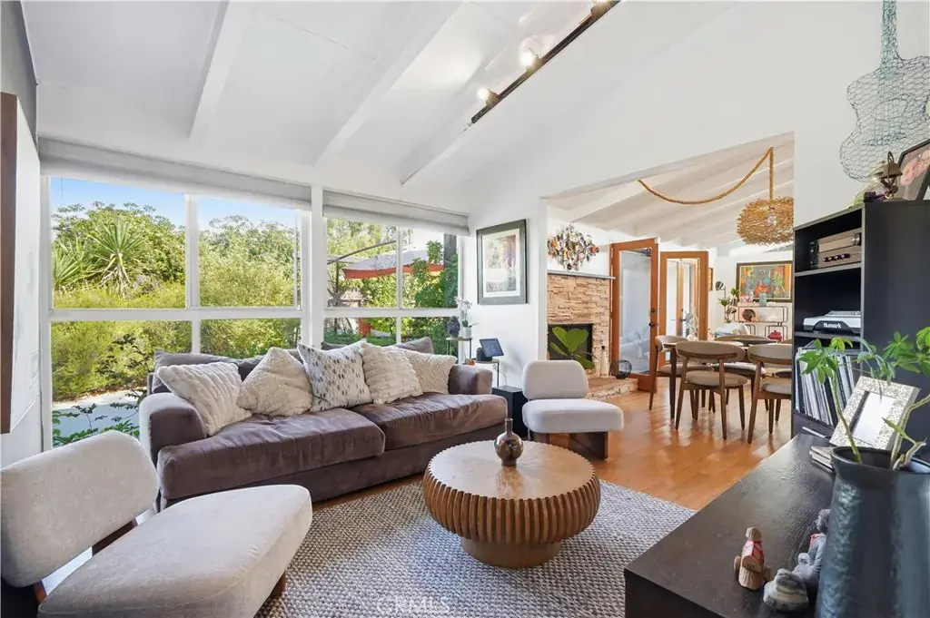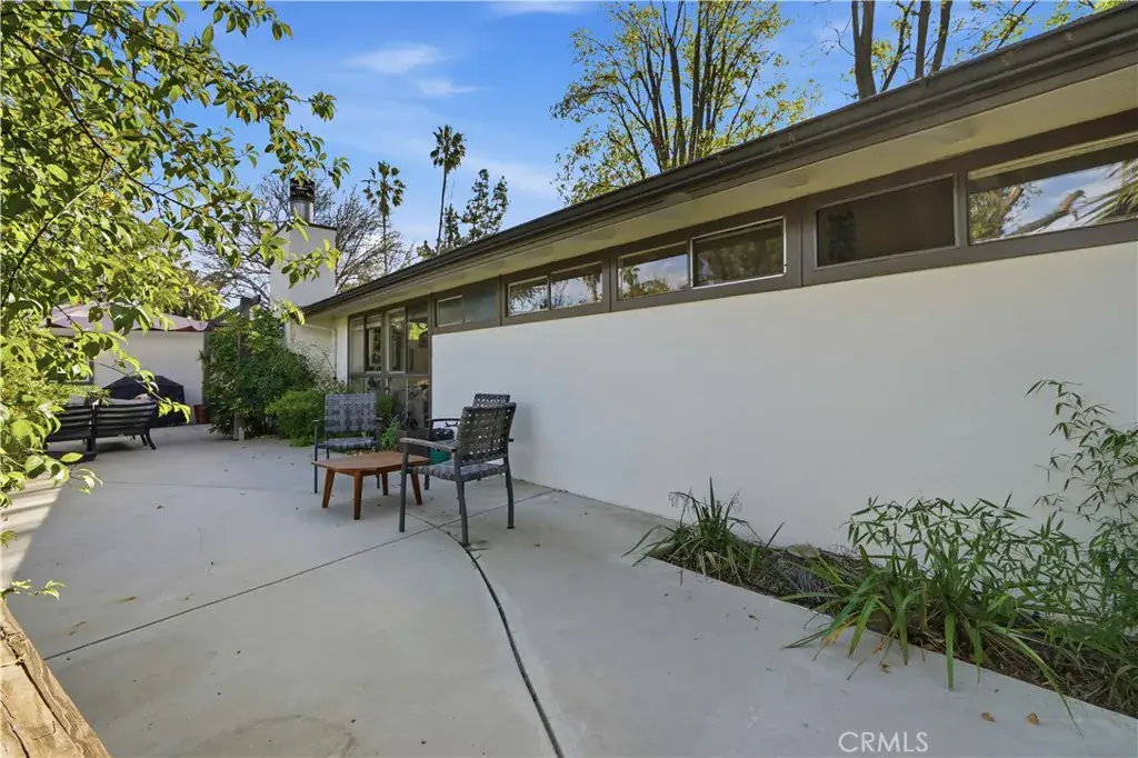 Corbin Palms Home :: Palmer & Krisel, Architects. Sited on a prominent corner in the storied and historic mid-century modern enclave known as “Corbin Palms,” this post & beam home is a testament to the enduring legacy and forward-thinking design of architects, Palmer & Krisel. The home retains such classic features as open-beam ceilings, wide expanses of glass, and clerestory windows. An airy, flexible floor plan contains 3 bedrooms and 2 1/2 bathrooms, the fourth bedroom having been opened to the living room, creating a cozy and comfortable den, but easily converted back to a 4th bedroom if needed. A portion of the garage has been converted into a studio/workshop, offering the opportunity for creating finished office/guest space, or easily converting back to garage space. Glass doors open to the yard with multiple patios and mature trees, setting the stage for laid-back Southern California living in the sunny San Fernando Valley.