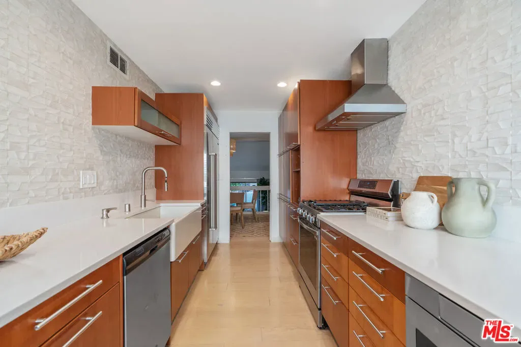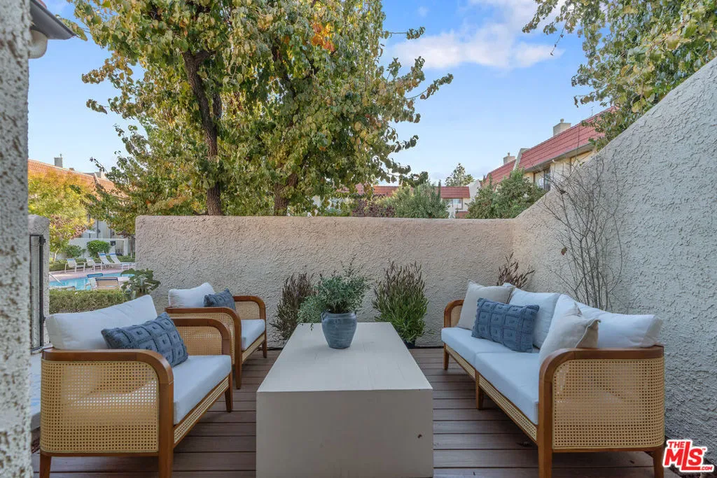 Ideally situated in the coveted Villa Castilla community in the heart of Warner Center and walking distance to the Village, this beautifully updated end unit townhome offers refined comfort and effortless living. The spacious 1,416 sq ft layout includes 2 bedrooms and 2 bathrooms, a gourmet chef’s kitchen with a generous dining room with bar area, a private outdoor patio, an attached 2-car garage, and an inviting open-concept living room highlighted by a fireplace. Newly updated chefs kitchen with premium appliances and custom cabinetry featuring a great breakfast dining area. The primary suite is a true retreat, featuring soaring ceilings, walk in custom closet and second closet, an en-suite bath, and a wall of windows that fills the space with natural light while overlooking the serene community courtyard, pool, and spa. Incredible entry level private patio with trex decking and a large 2 car garage with plenty of storage space! Just moments from Westfield Topanga, The Village, Equinox, Shoup Park, premier dining on Ventura Boulevard, and quick 101 freeway access, this exceptional location offers unmatched convenience and a lifestyle of ease.